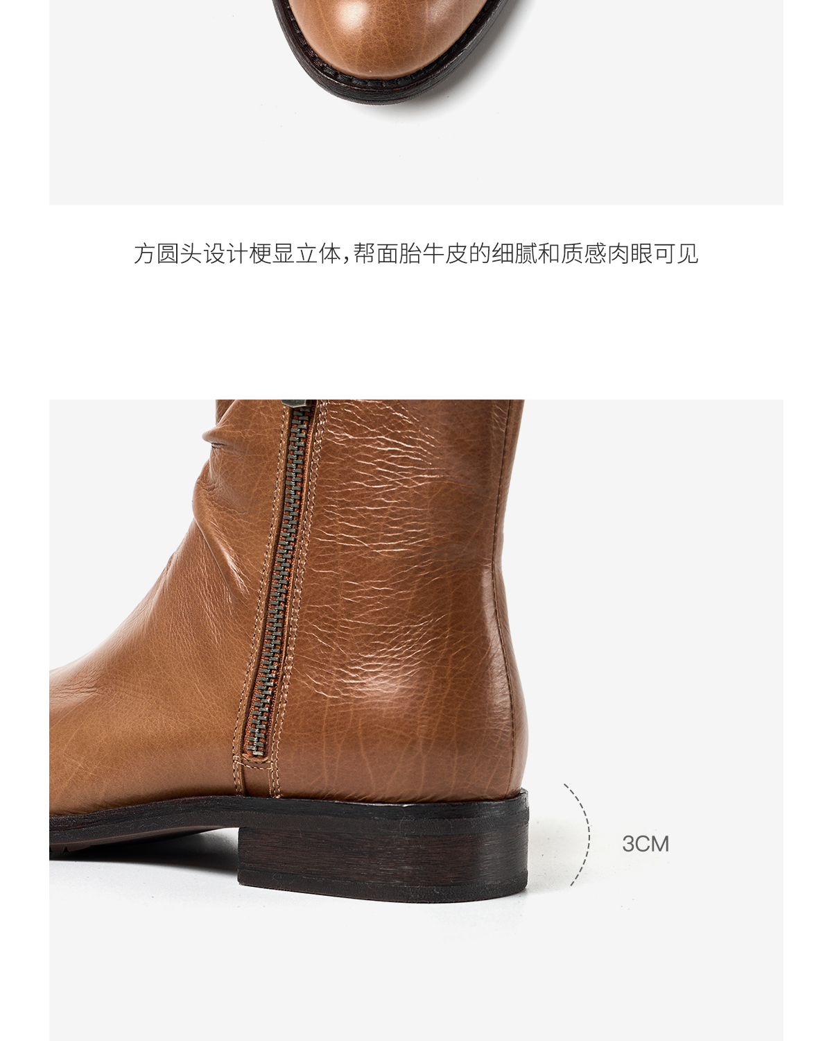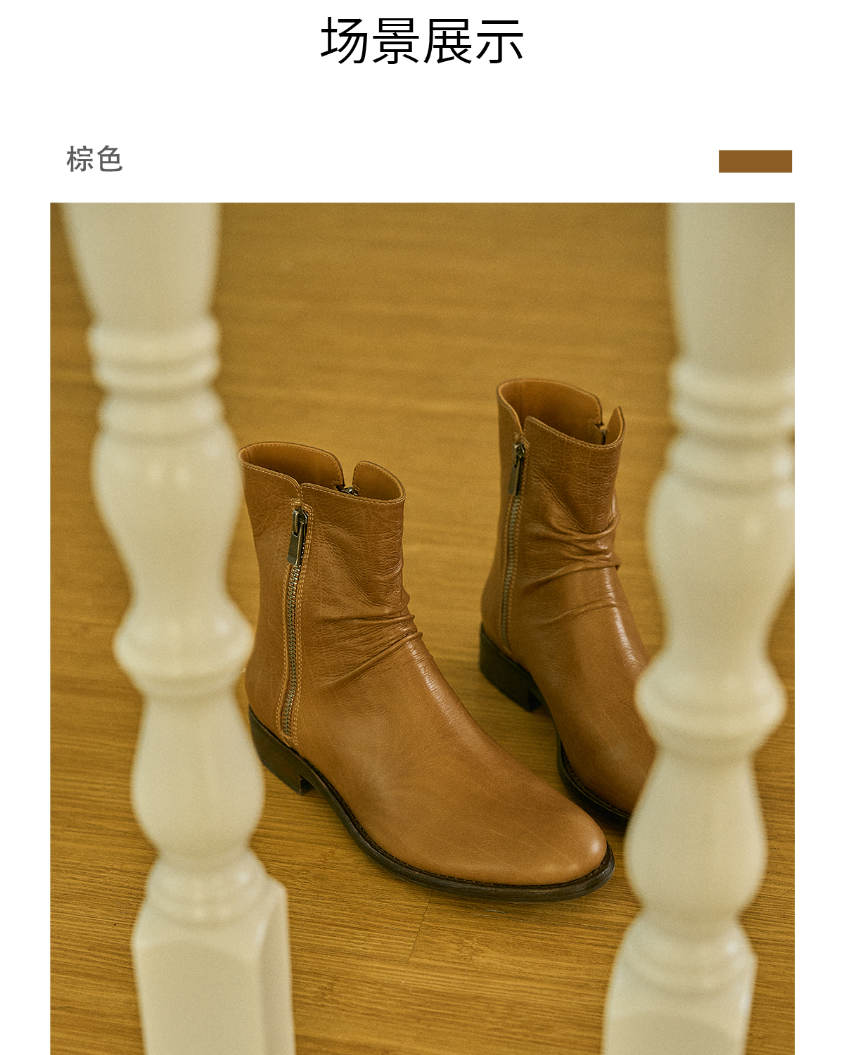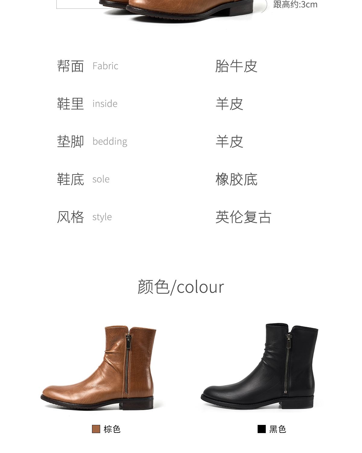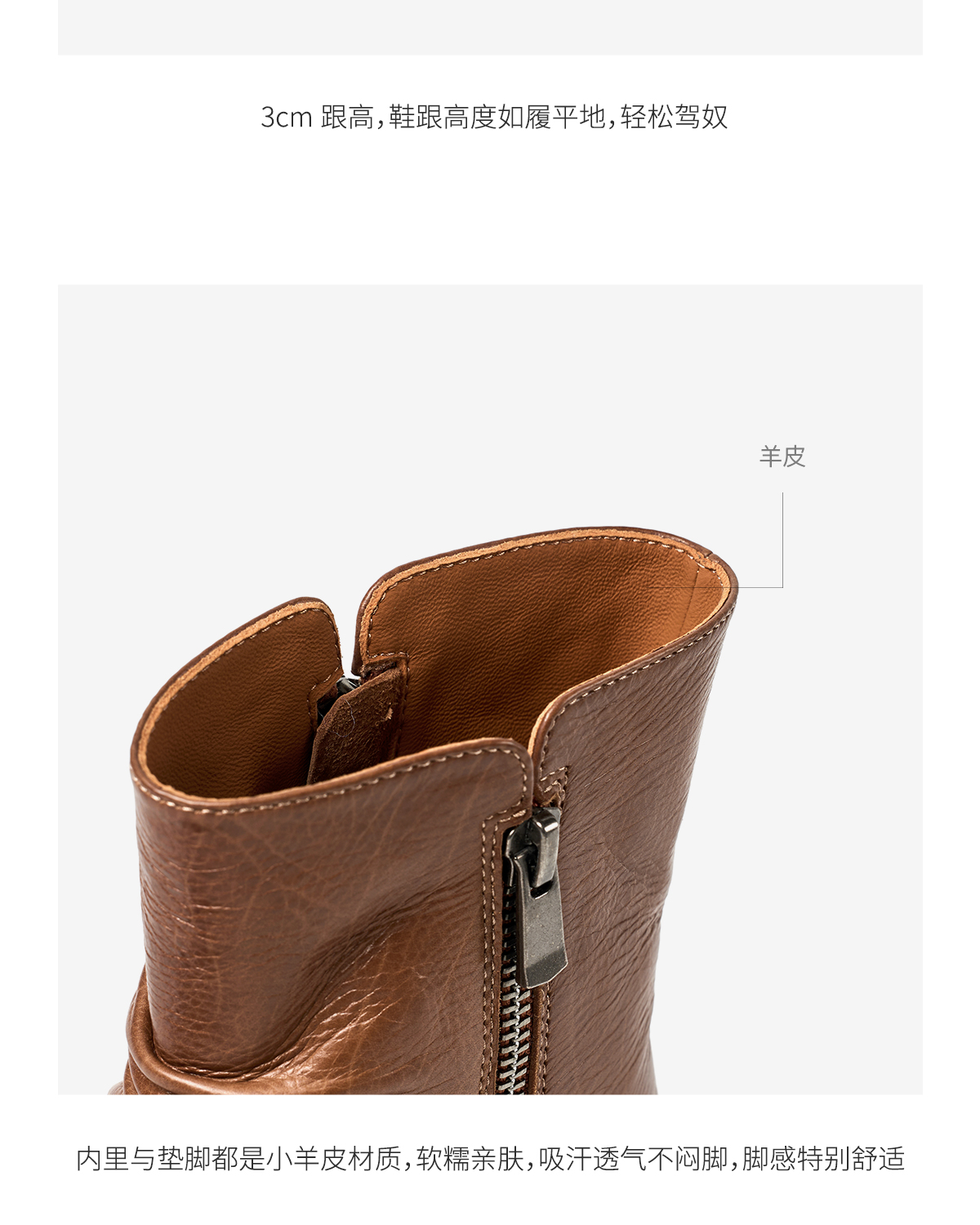 faytobe英伦风马丁靴秋时尚休闲复古胎牛皮褶皱粗跟短靴女士
