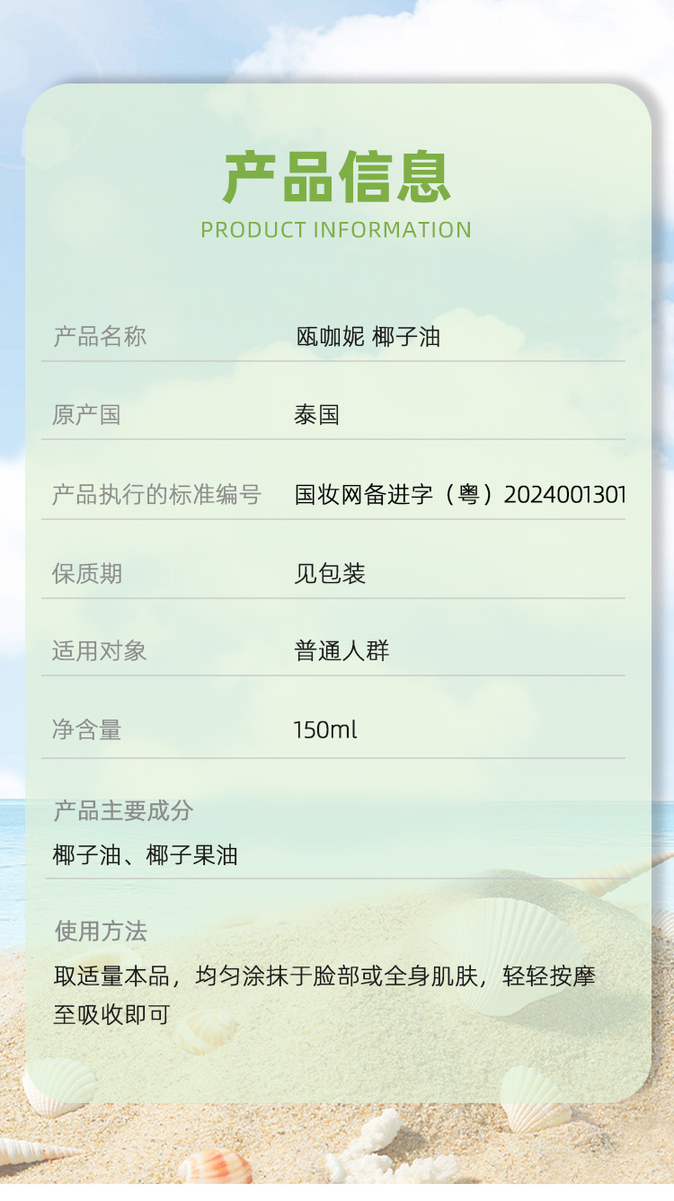 瓯咖妮泰国椰子油/1瓶(150ml)生产日期:25年8月补单专用