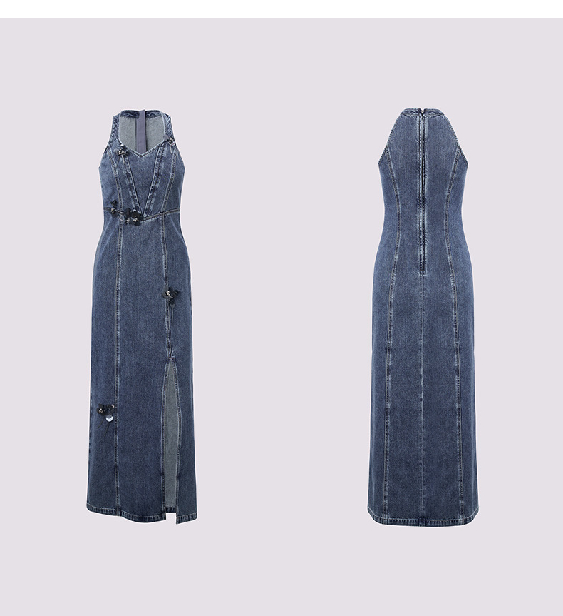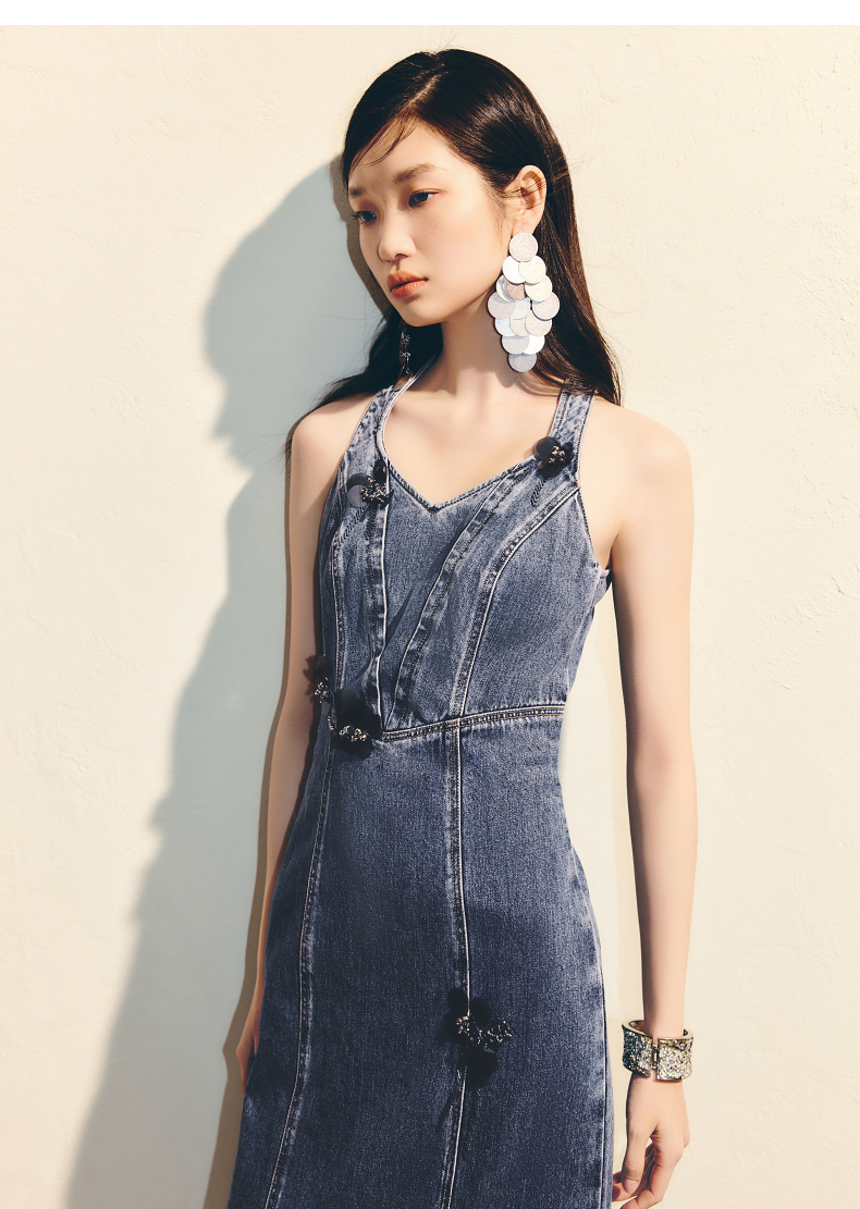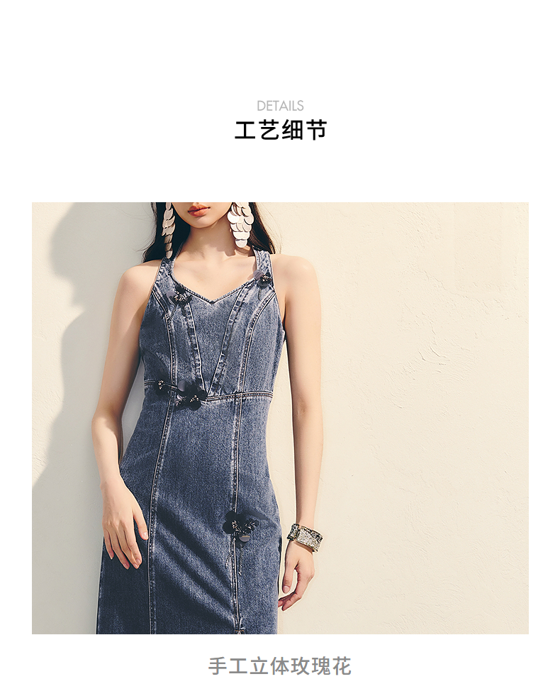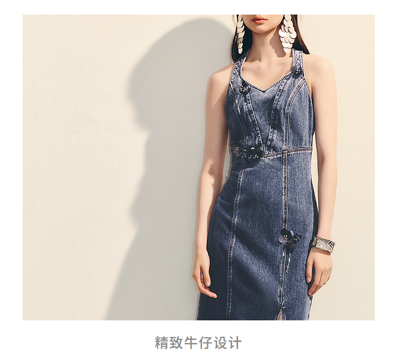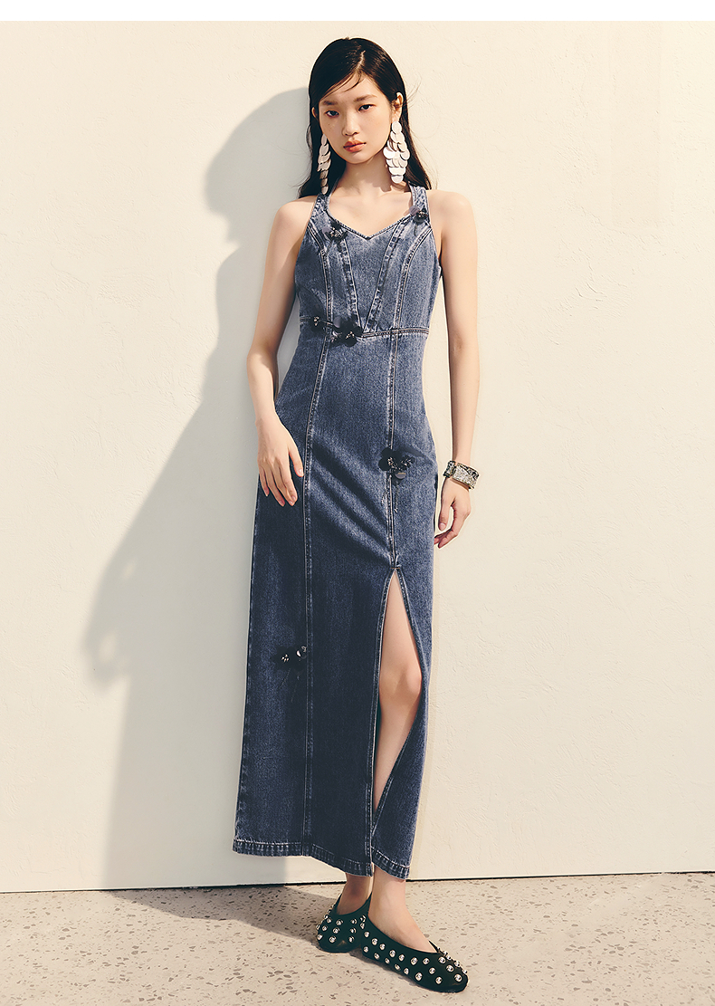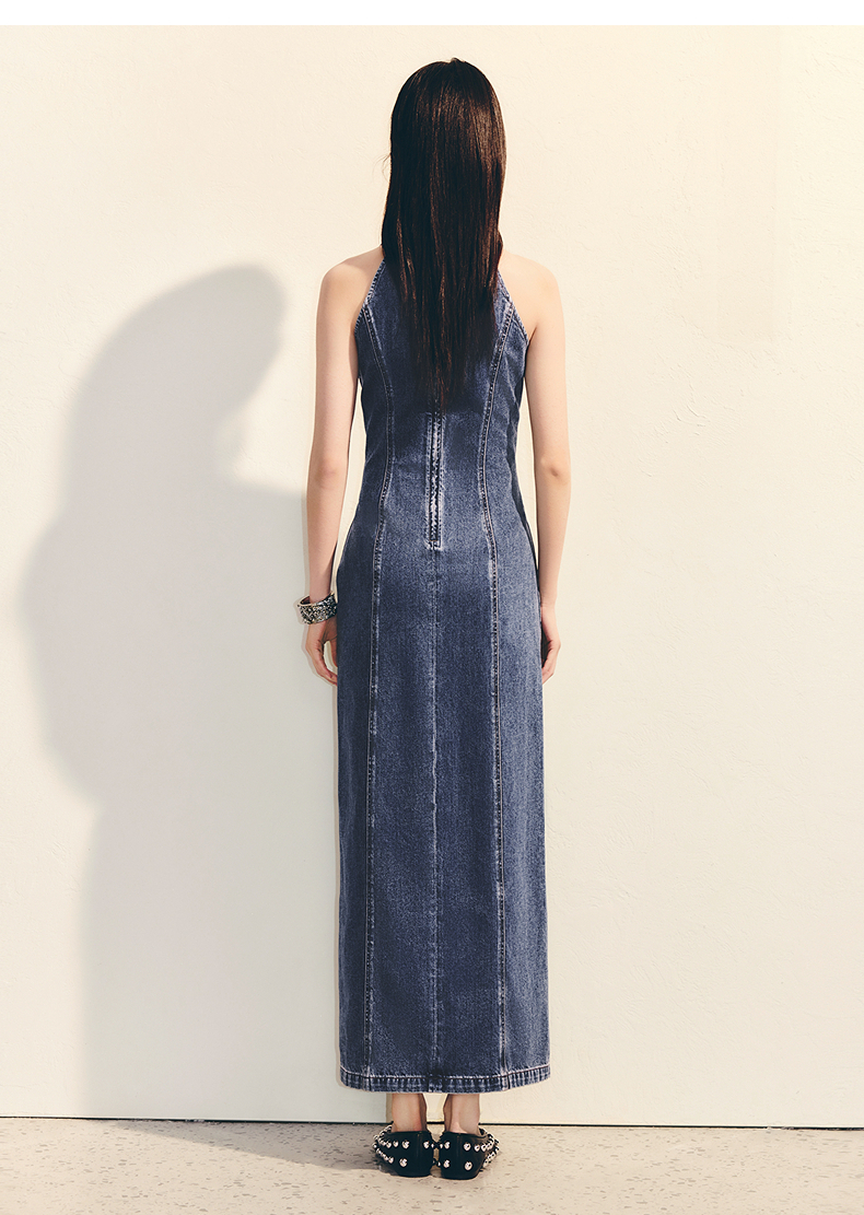 【商场同款-浅春系穿搭】MAXRIENY复古挂脖牛仔连衣裙开叉裙子春(货号:MC86DR074)