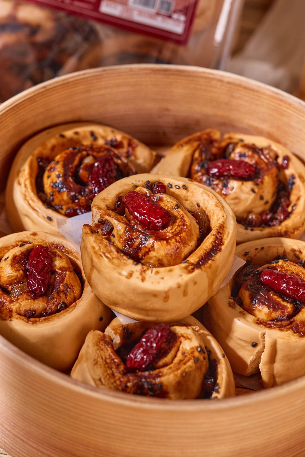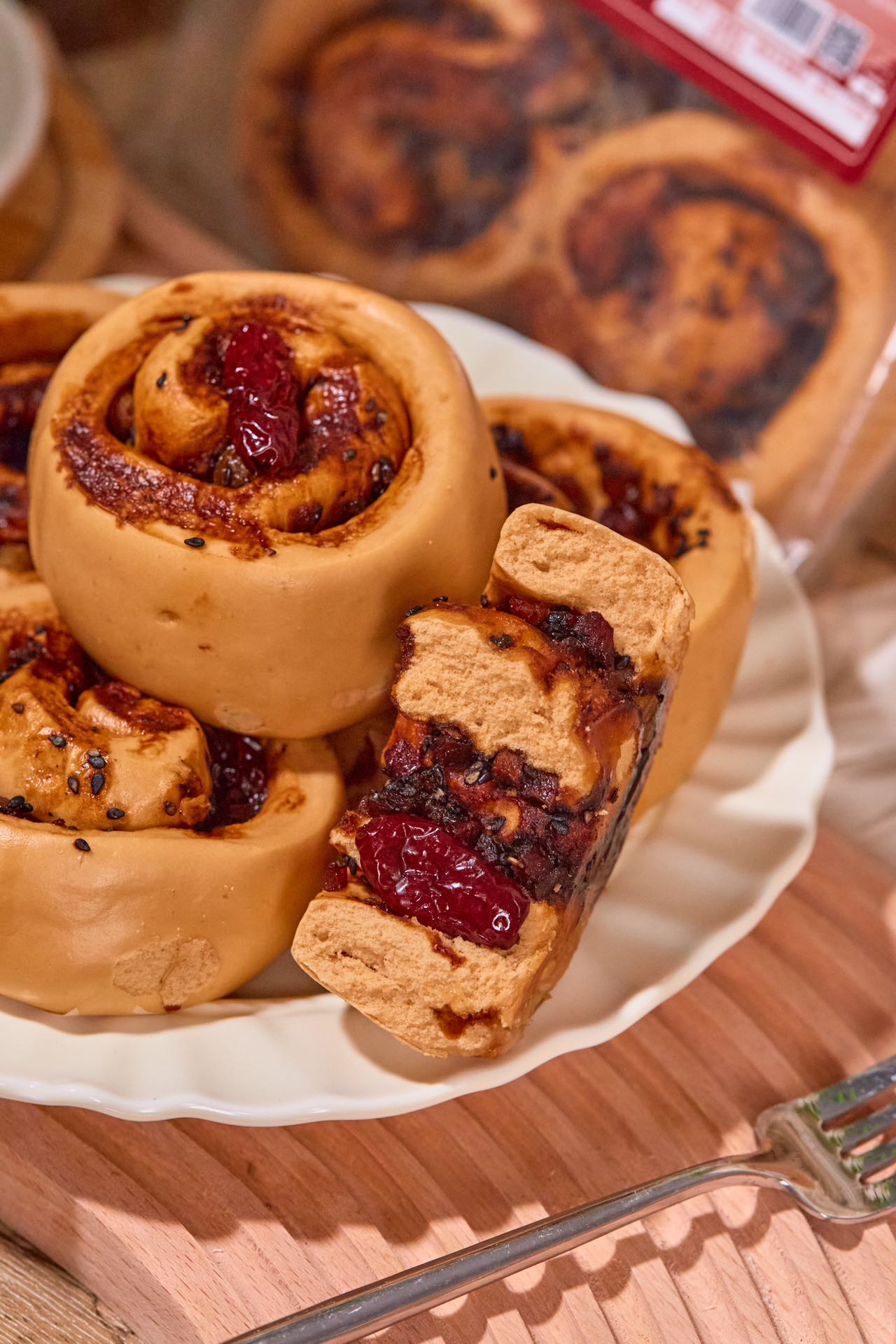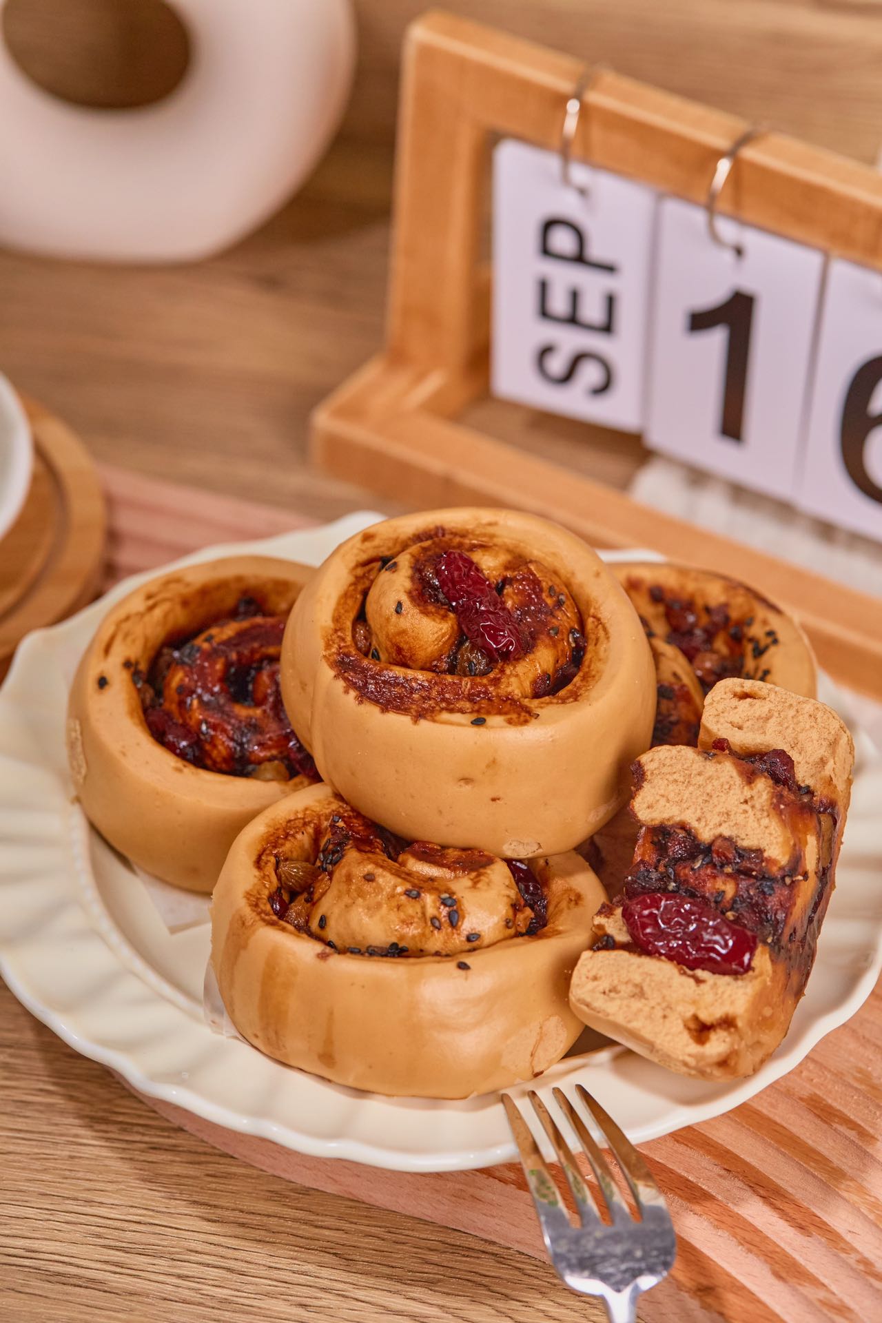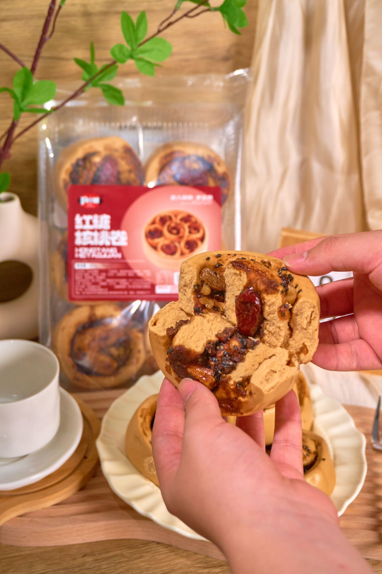 香软外皮裹挟着红枣、核桃、黑芝麻和葡萄干