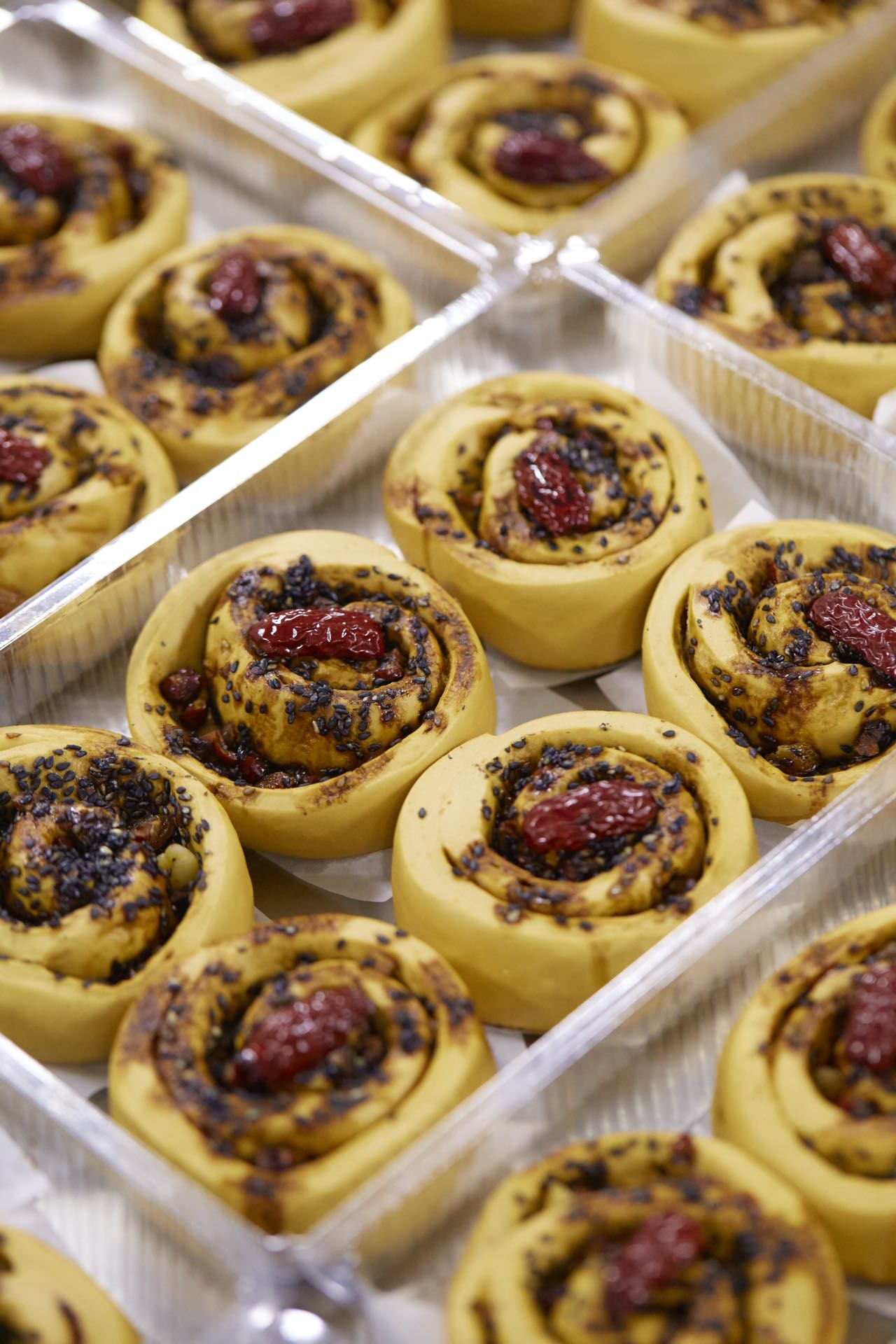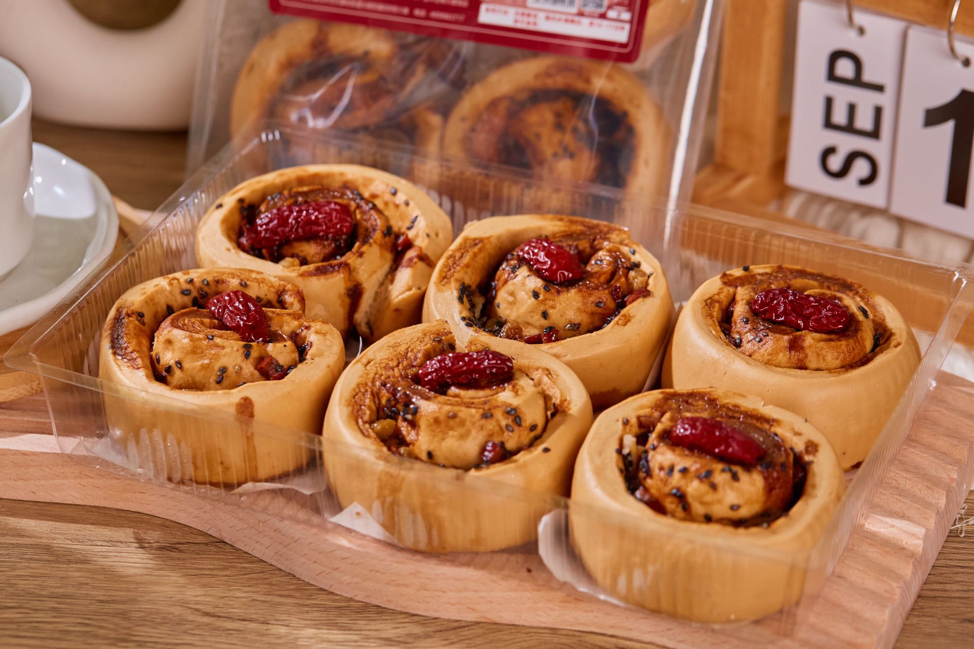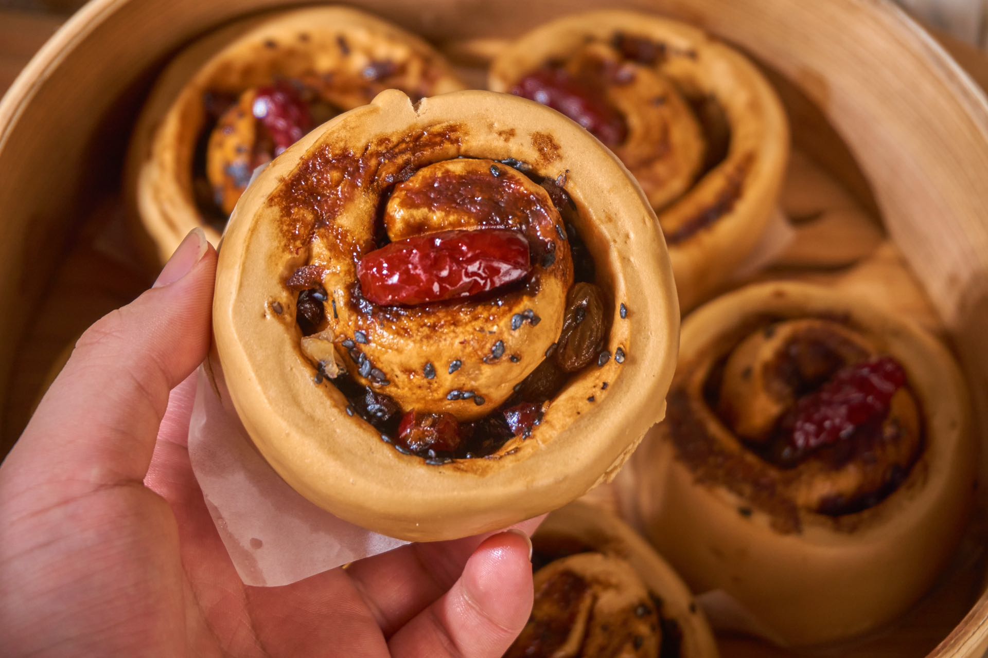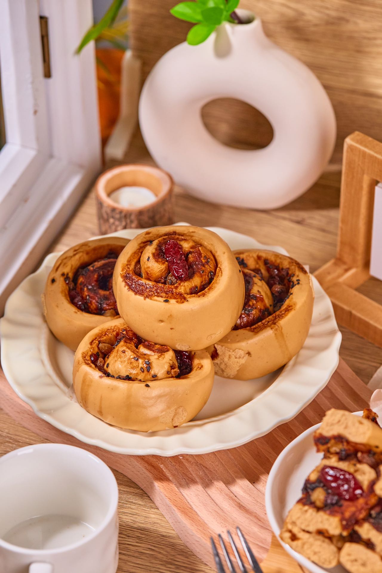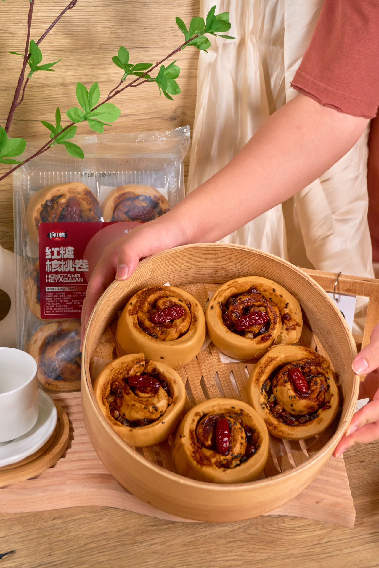 香软外皮裹挟着红枣、核桃、黑芝麻和葡萄干