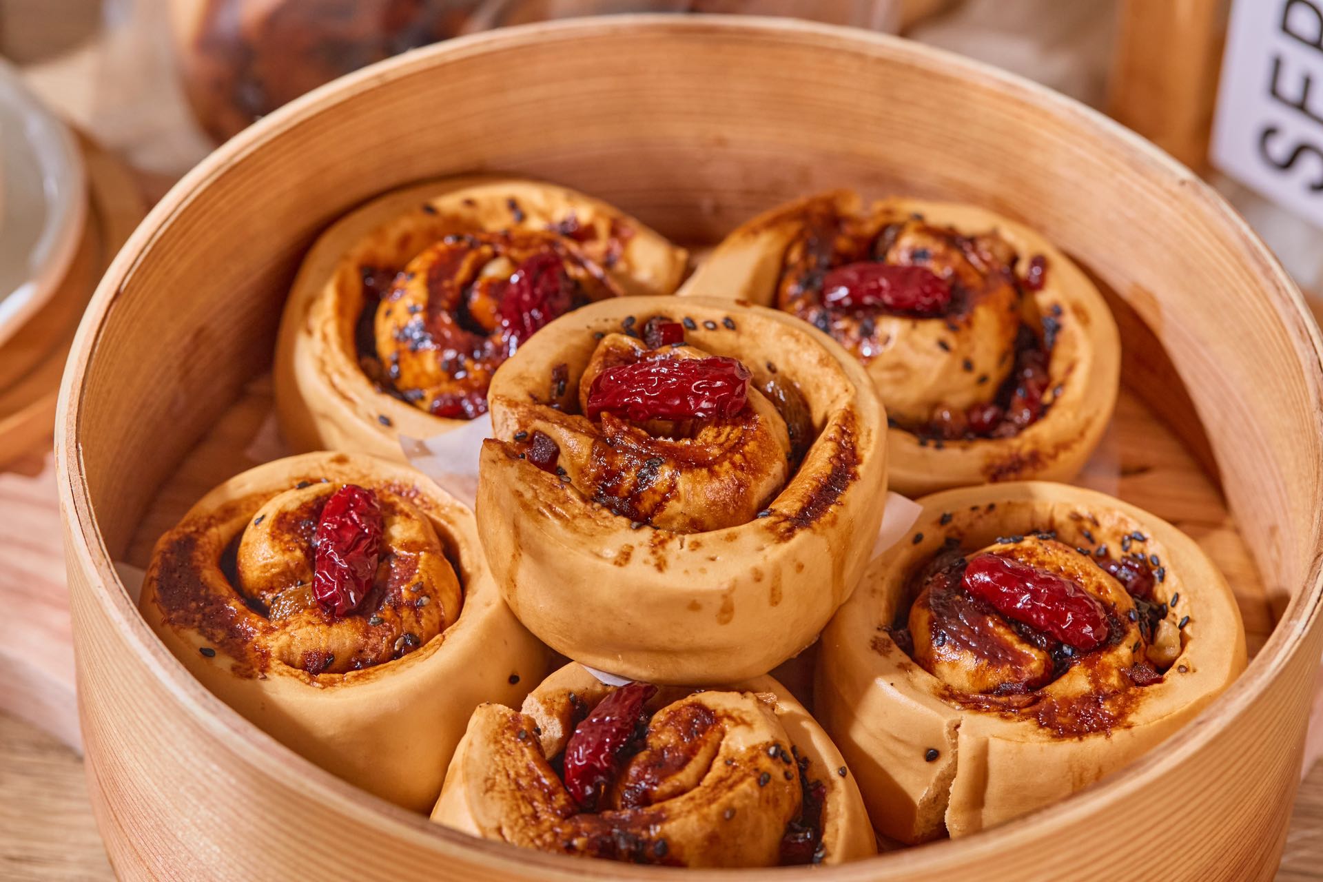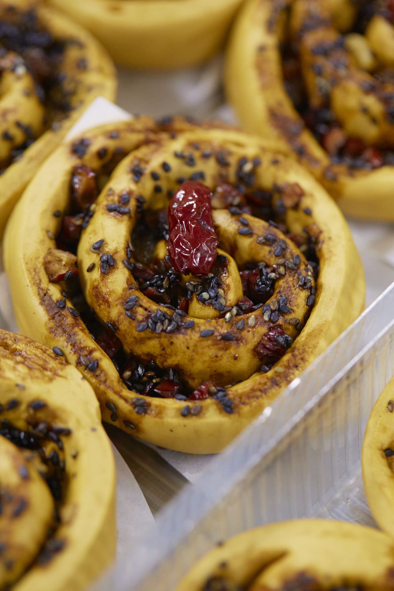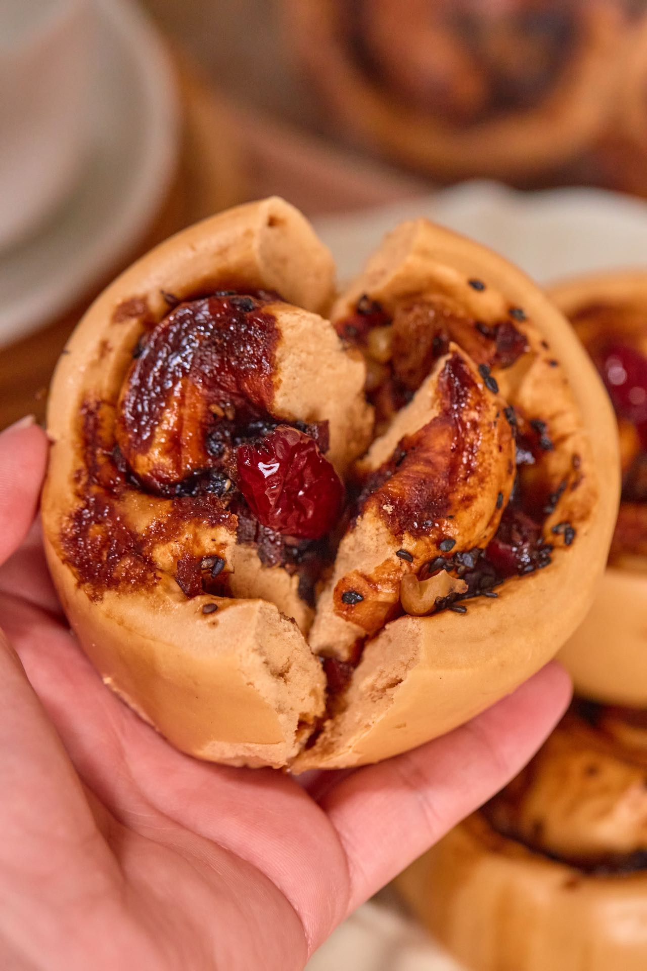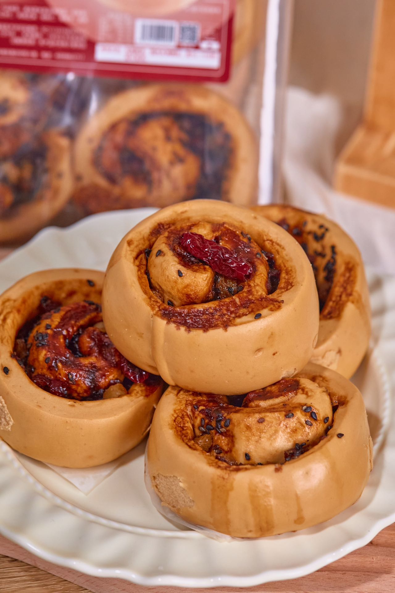 香软外皮裹挟着红枣、核桃、黑芝麻和葡萄干