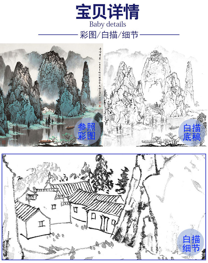 工笔画白描底稿-白雪石斗方山水-小品册页-BX39