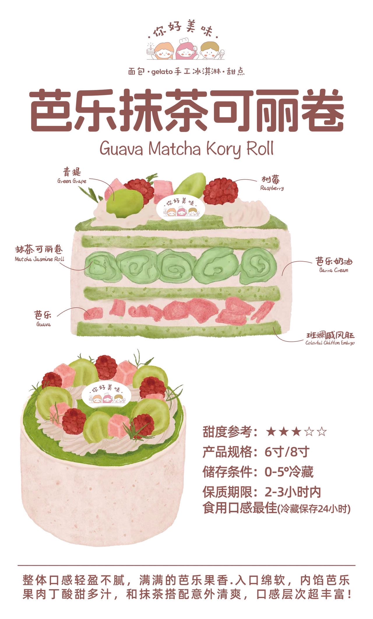产品介绍:芭乐抹茶可丽卷蛋糕,用特调的清甜的芭乐奶油,搭配柔软的抹茶戚风蛋糕胚+宇治抹茶可丽卷的清香,还有超多的芭乐果肉,口感清新不腻,非常好吃。