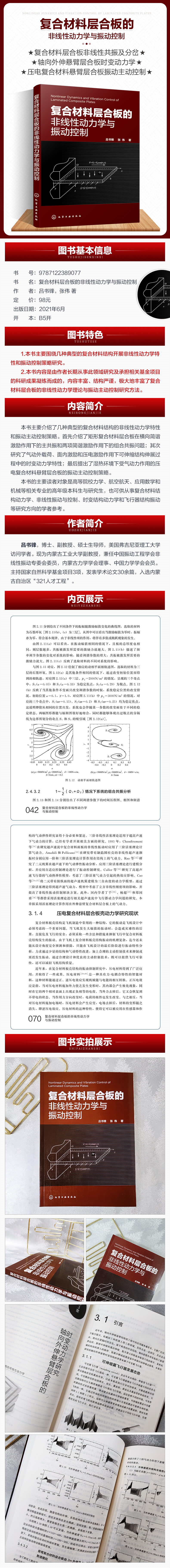 "复合材料层合板具有高比强度、高比刚度、抗疲劳性好等优势,还可以通过调整增强材料、基体材料、铺层数和几何参数等以适应不同的应用条件,被广泛应用于航空航天、机械加工和机器人等工程领域,已成为一类重要的工程结构元件。层合板材料常被制成薄壁轻质结构,例如多层板、夹层板和加筋板等。薄壁轻质结构在外部激励作用下极易发生大幅度的振动,呈现几何非线性,引起结构的振动疲劳破坏,造成难以挽回的损失。因此,对复合材料层合板进行非线性动力学特性与振动主动控制研究十分必要。