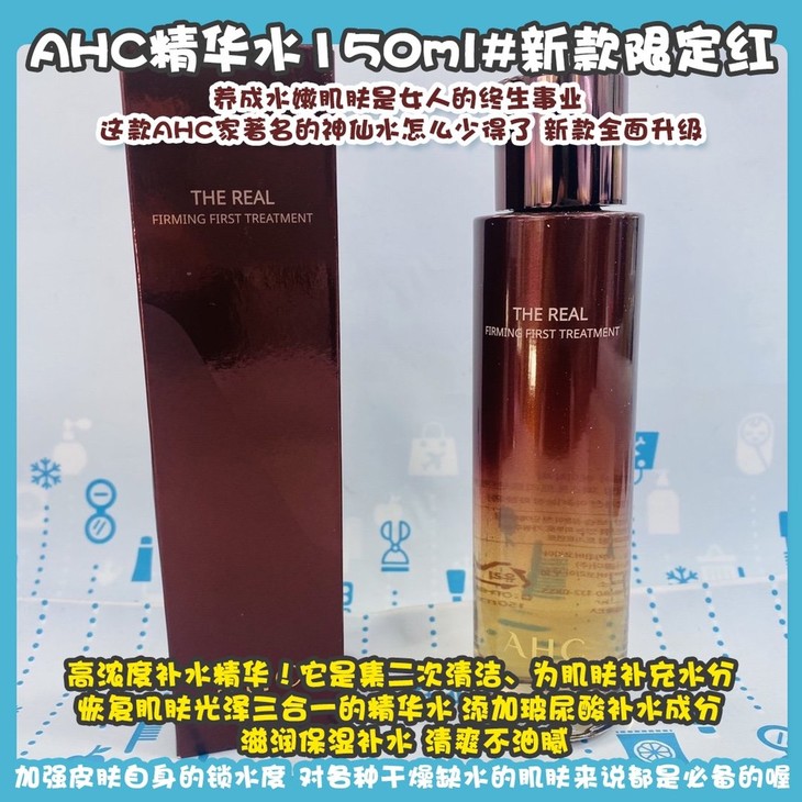 AHC精华水150ml#新款限定红👍养成水嫩肌肤是女人的终生事业👯,这款AHC家著名的神仙水怎么少得了!新款全面升级⬆,高浓度补水精华!它是集二次清洁、为肌肤补充水分💦、恢复肌肤光泽三合一的精华水💧。添加玻尿酸补水成分,滋润保湿补水,清爽不油腻🍃。修复毛孔,提高皮肤的保湿力,加强皮肤自身的锁水度,对各种干燥缺水的肌肤来说都是必备的喔😍!