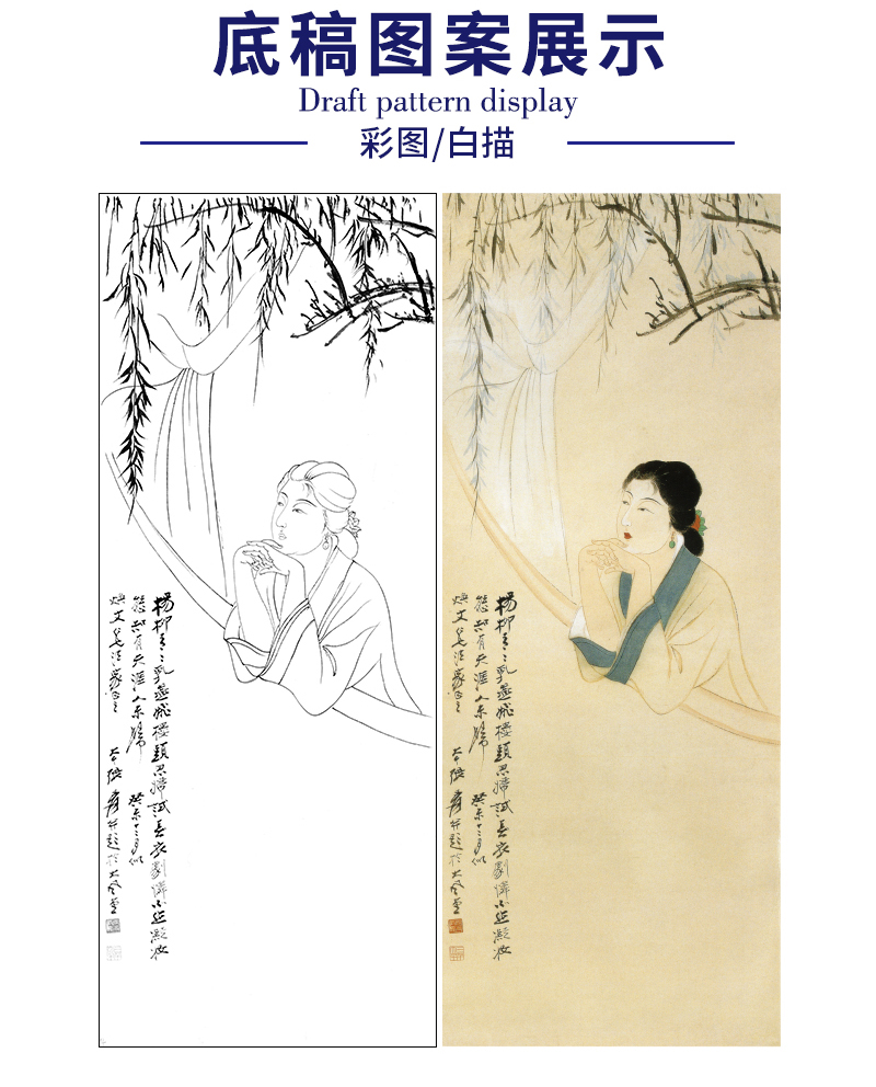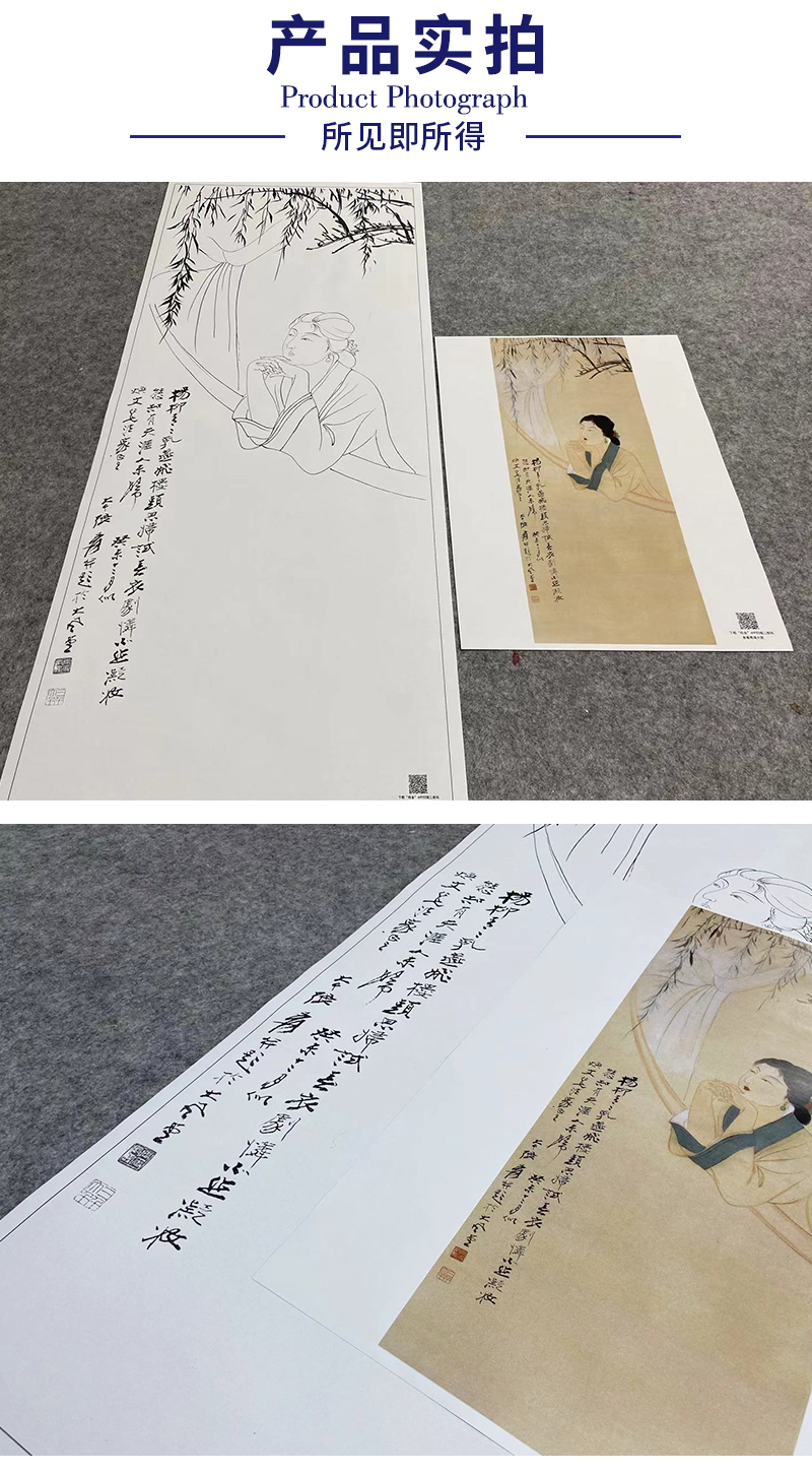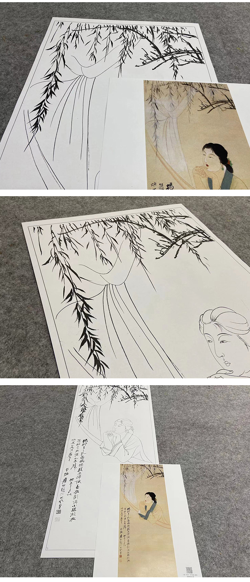 张大千竖幅工笔传统人物白描底稿-《翠楼远望仕女图》-多种白描尺寸可选-QD57