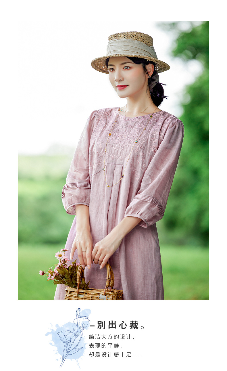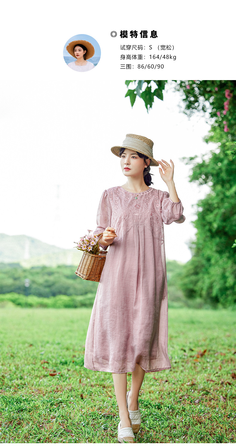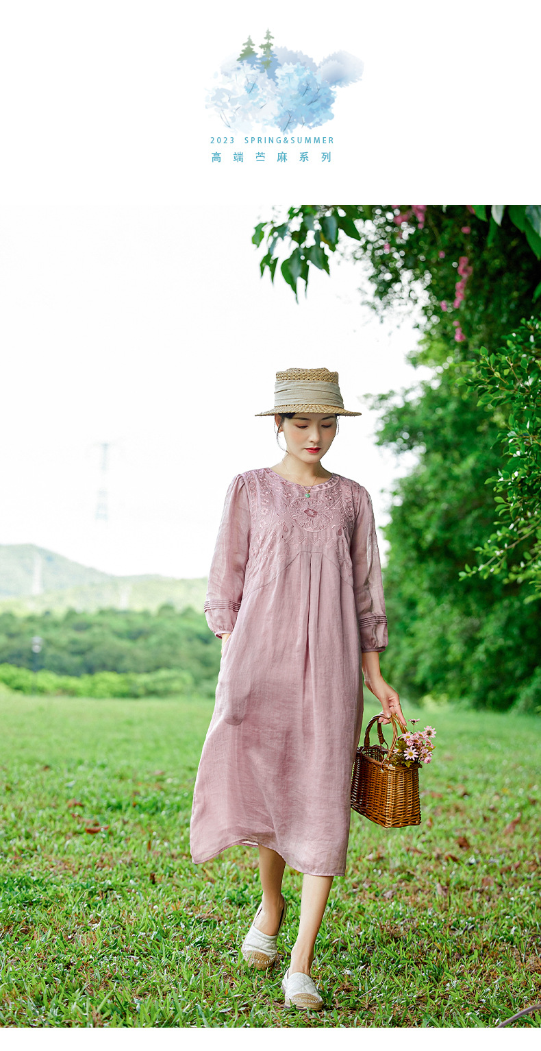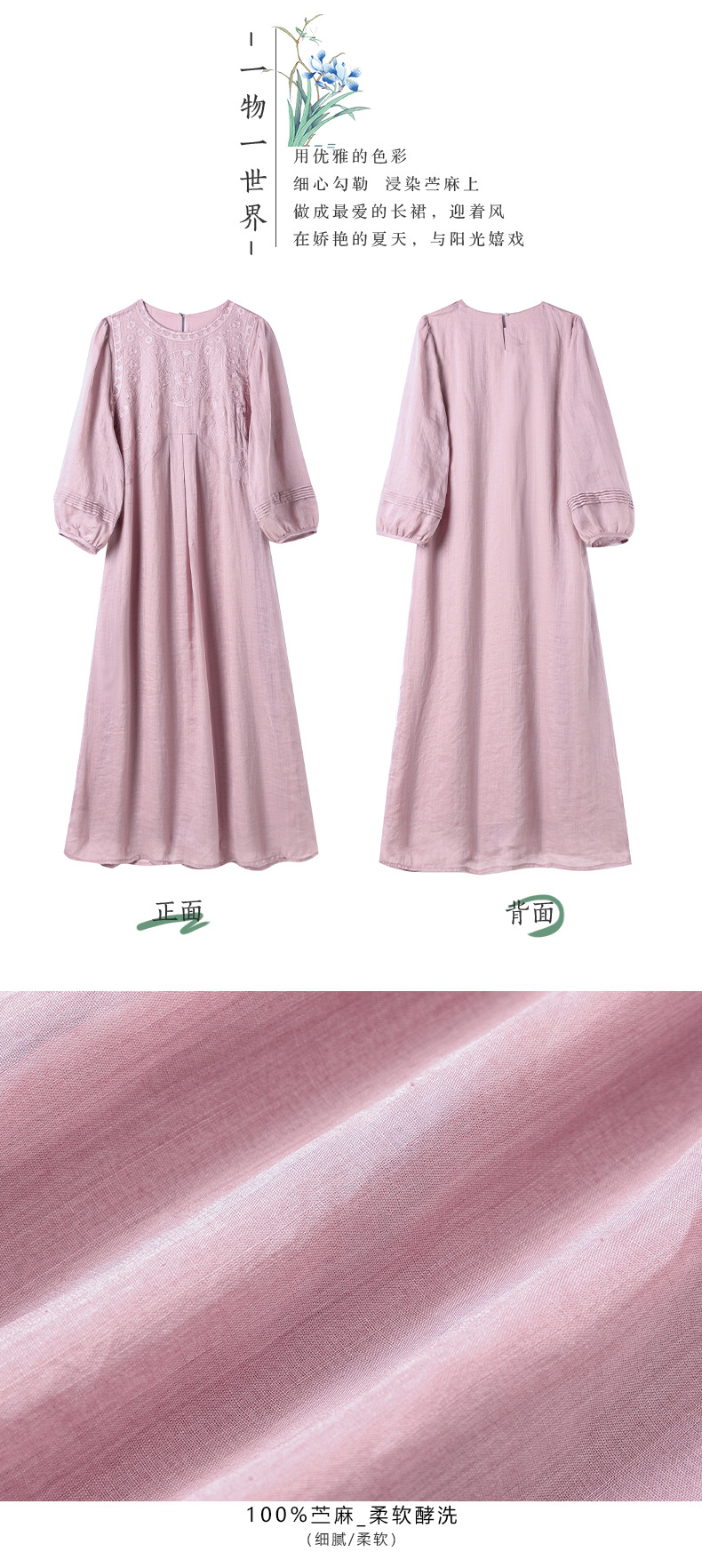 HM-S383夏季新款重工刺绣苎麻连衣裙国风文艺灯笼七分袖宽松显瘦袍子