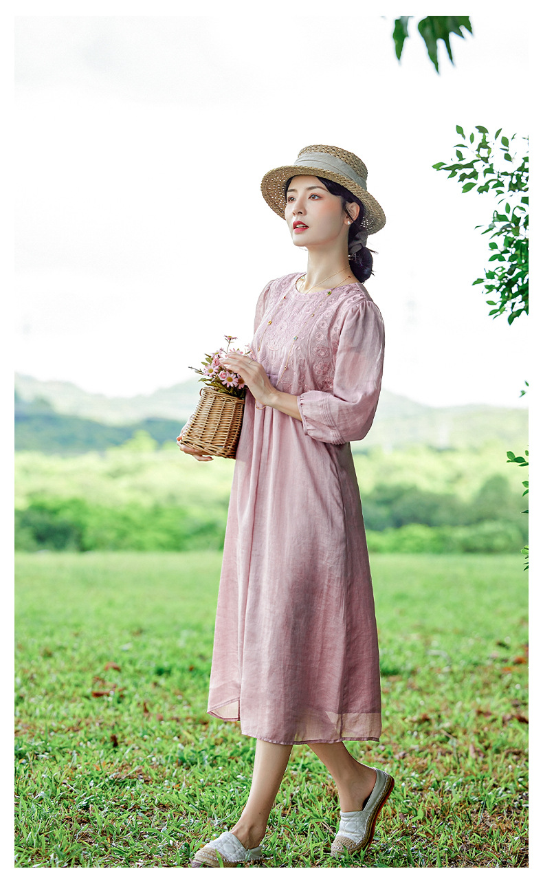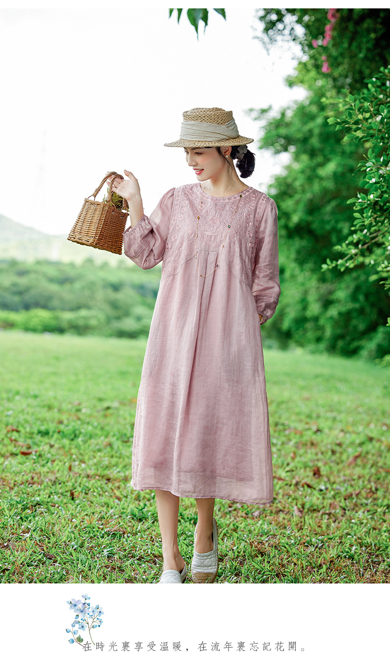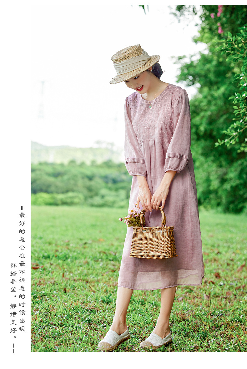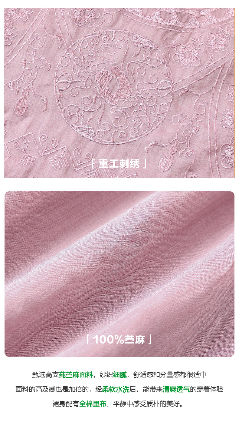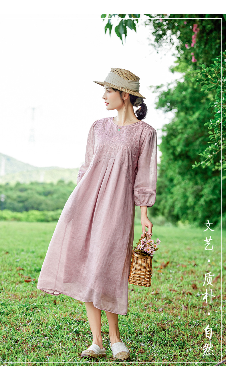 HM-S383夏季新款重工刺绣苎麻连衣裙国风文艺灯笼七分袖宽松显瘦袍子