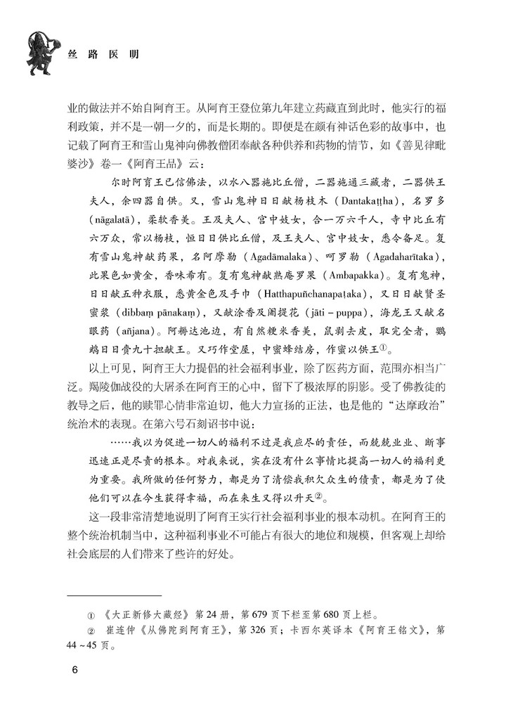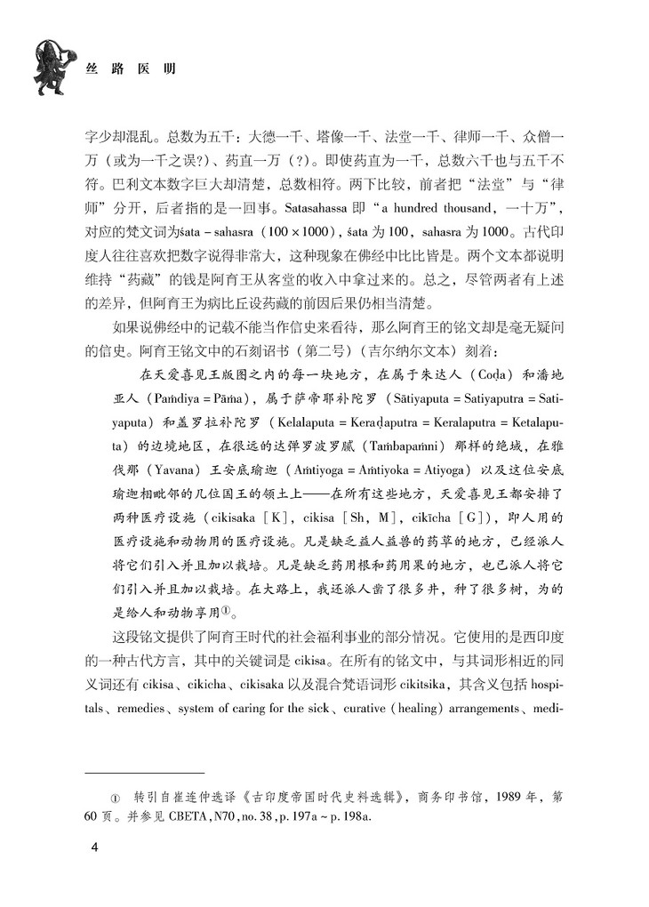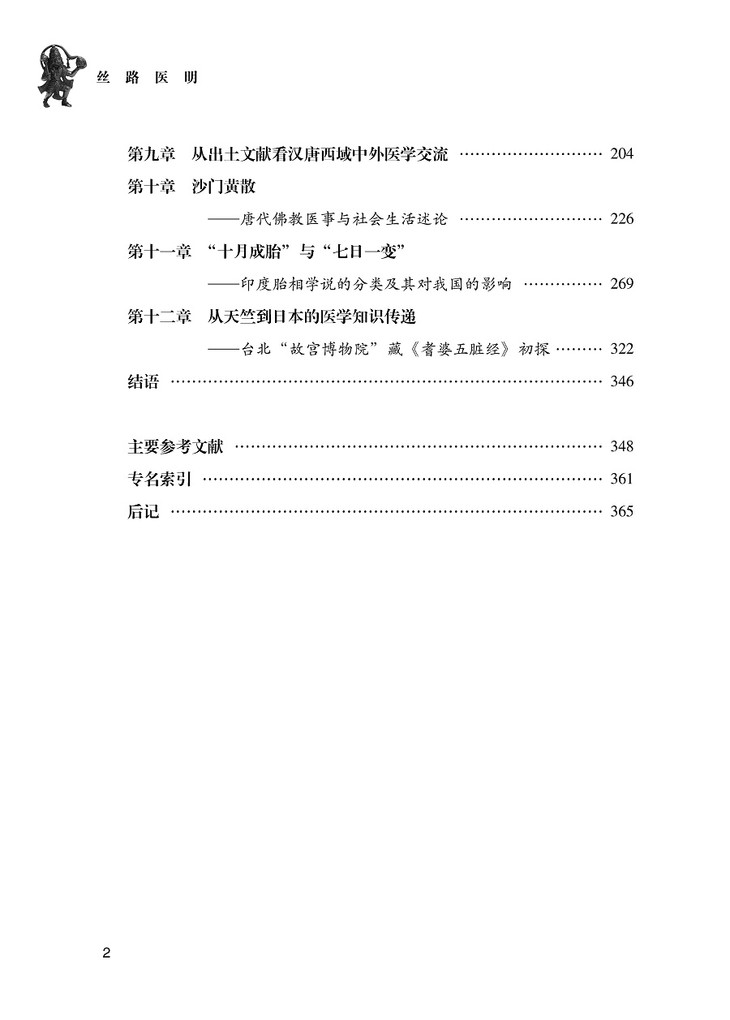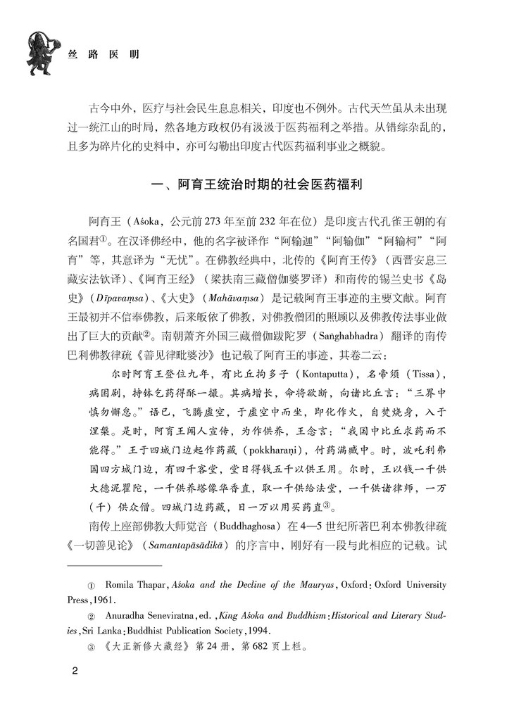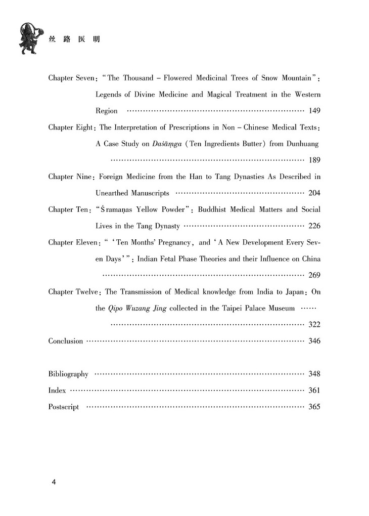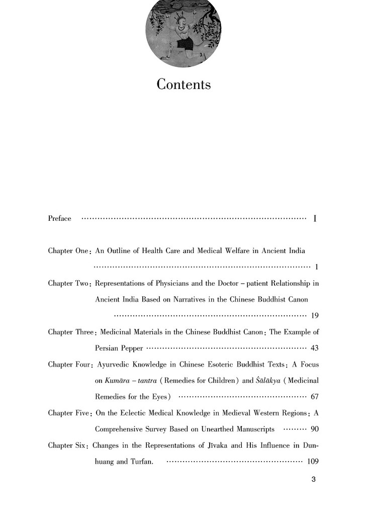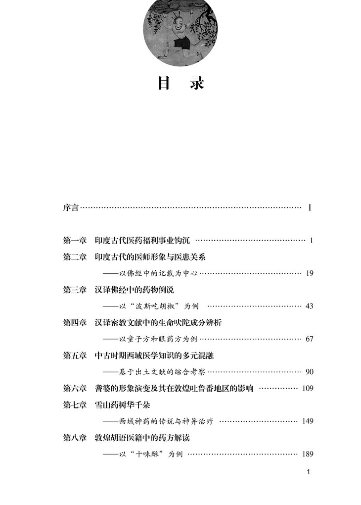 本书从宗教、社会和文化的角度,切入印度医学史的范畴,将十二个专题研究,大体上自西俎东,分为天竺篇、西域篇、交流篇三个板块。从内容上看,天竺篇涉及印度古代的医疗福利事业、医师形象、医患关系、常用药物(如胡椒等)、医疗方剂(童子方和眼药方等)。西域篇梳理出土医学文献、佛教医王耆婆(Jīvaka)形象演变及其流传、西域神药的传说以及胡语药方的解读。交流篇则探讨汉唐的外来文化、沙门黄散、胎相学说以及《耆婆五脏经》等典籍在中国和东亚的流传与影响。全书以医药和宗教(印度教、佛教)为两个支点,以文化交流为视域,梳理较为细碎的史料,将相关的知识流通如同网络般连接起来,从而为梳理印度医学文化和中印古代医学的互动情形奠定一定的基础。在史料的利用和处理方面,利用出土史料(以敦煌、吐鲁番和丝绸之路沿线的出土写卷为主)、传世典籍(汉译佛经与中土撰述)、域外文献(印度、波斯或东南亚的非汉语史料)的结合,将这些文字文本(包含写本与刻本等形态)与相关的考古资料、图像史料等融为一炉,使之尽量呈现出整体性的观照和考察。