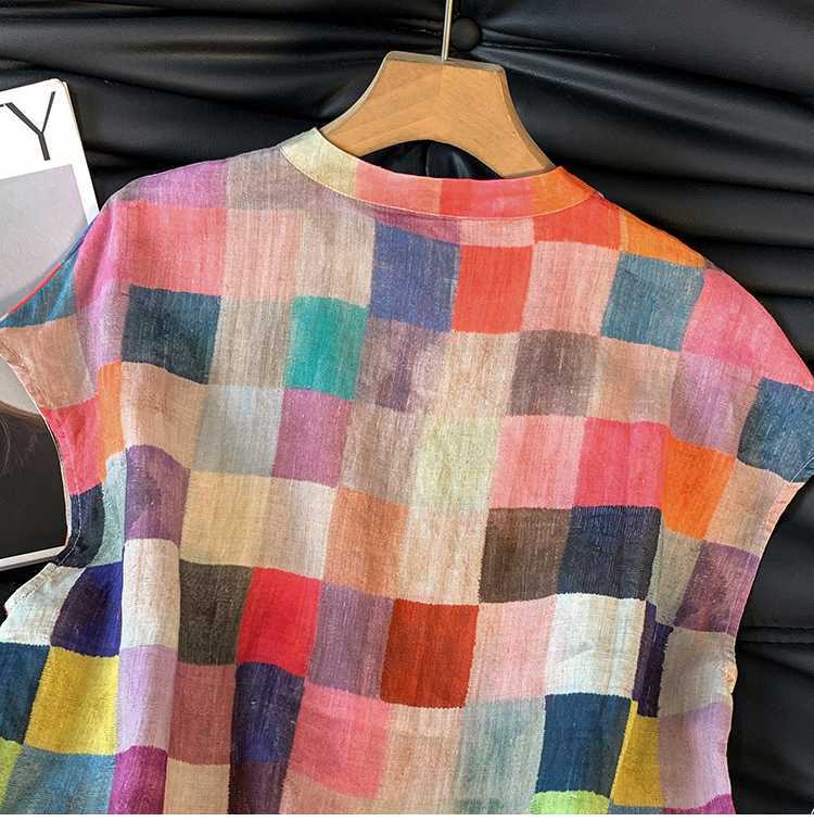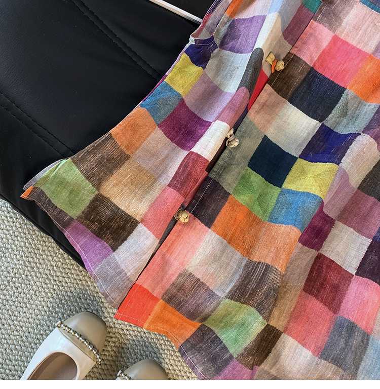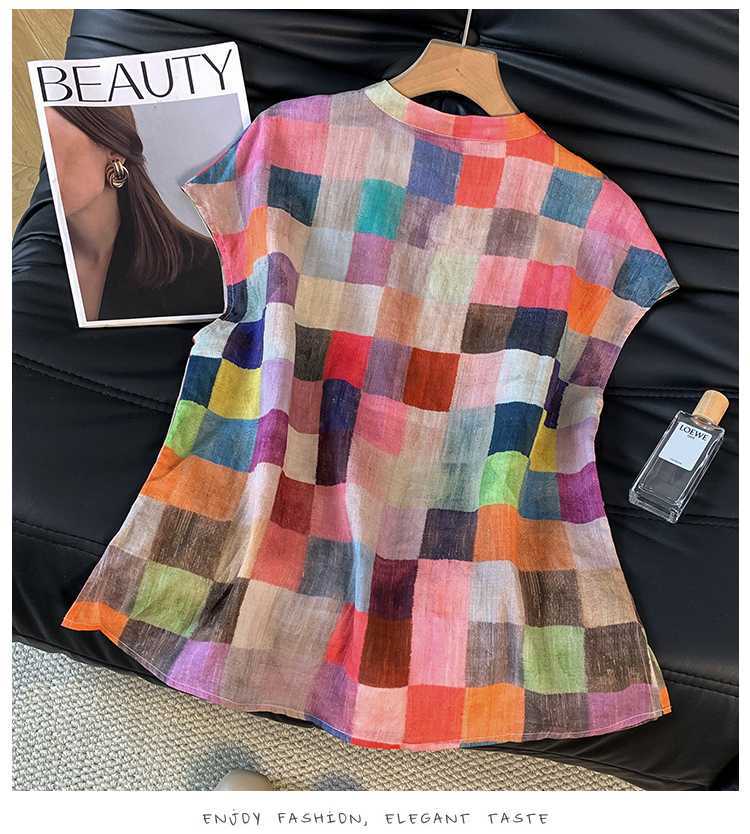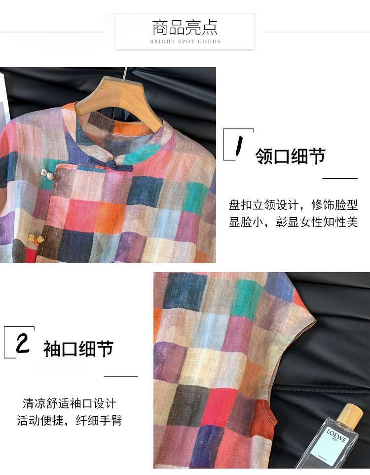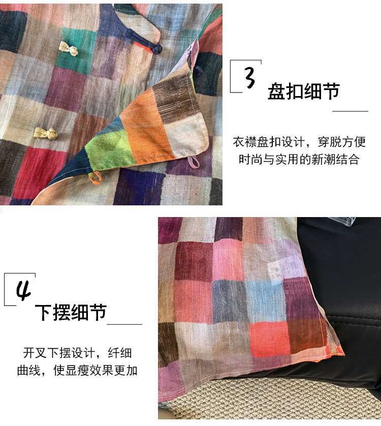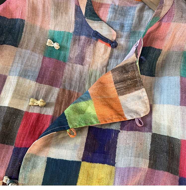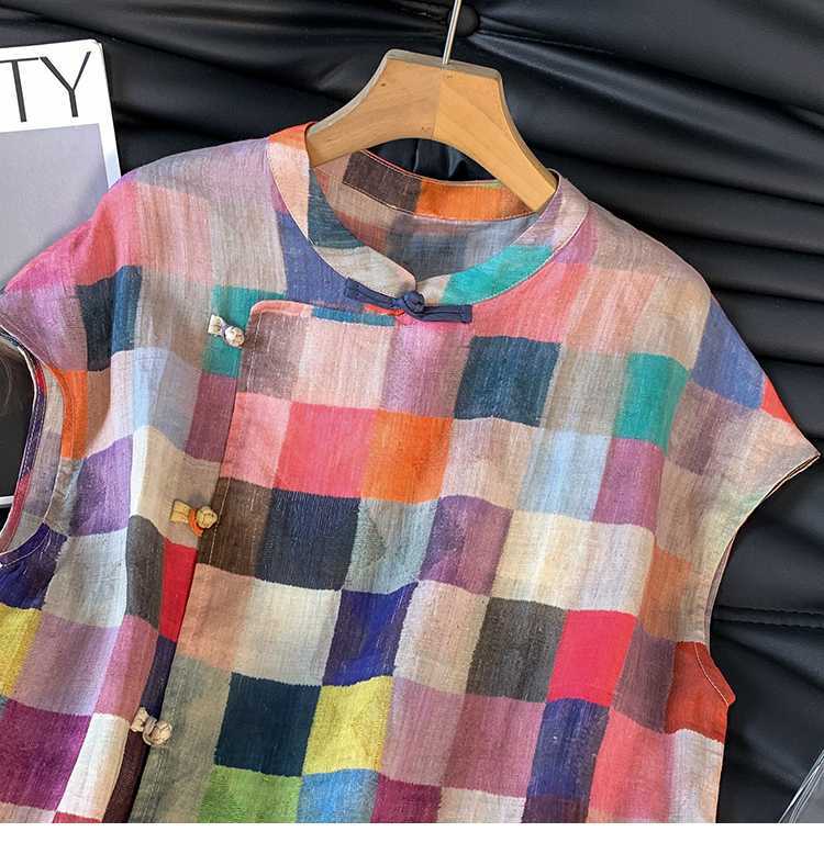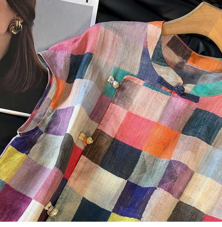 雀说新款苎麻改良旗袍上衣国风水墨彩格盘扣小衫AL6296