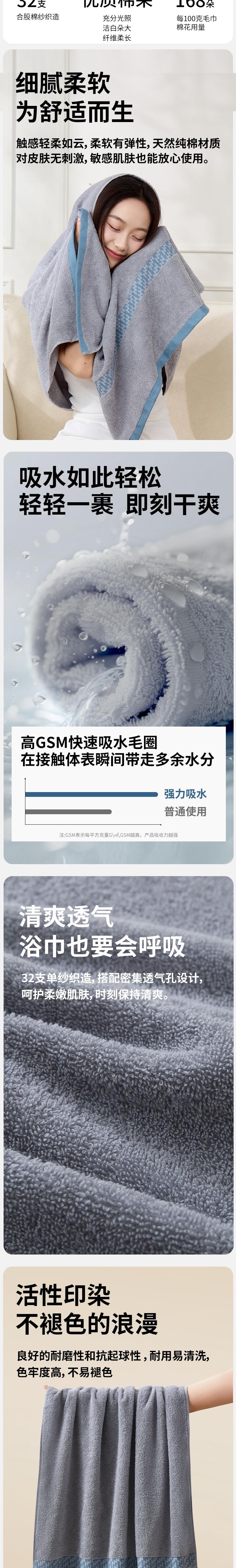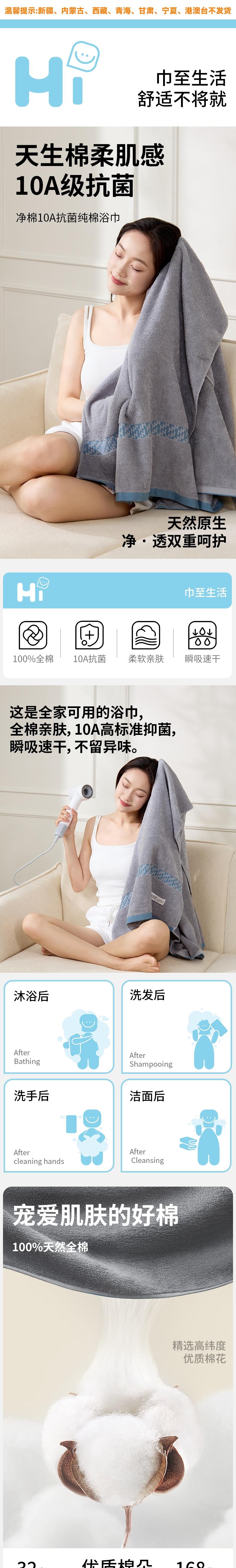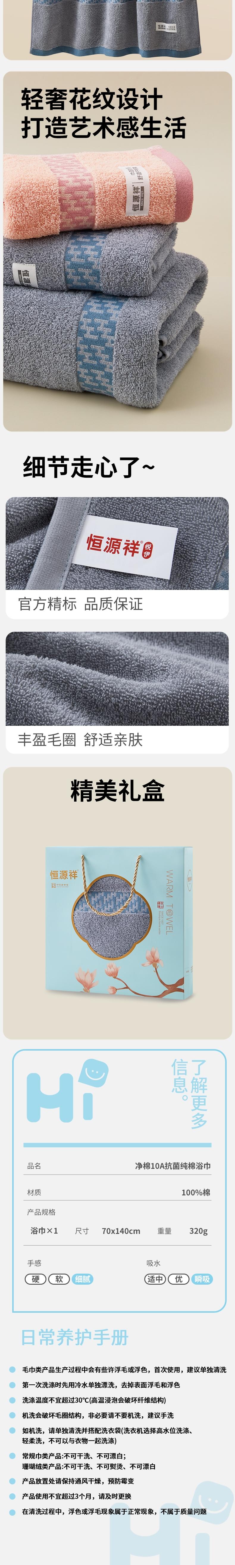 恒源祥 净棉10A抗菌纯棉浴巾单条装70*140cm HYX118MJ