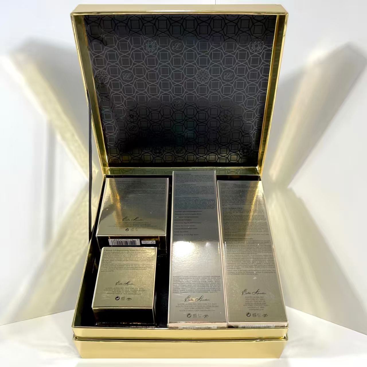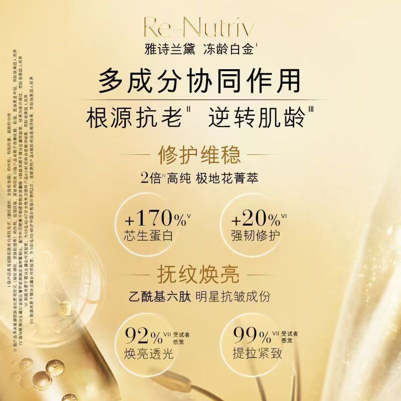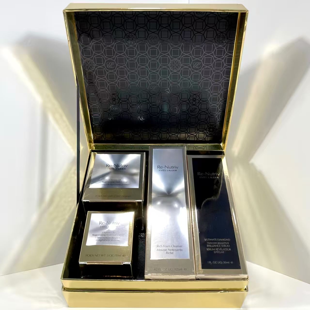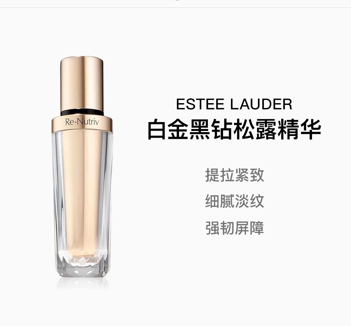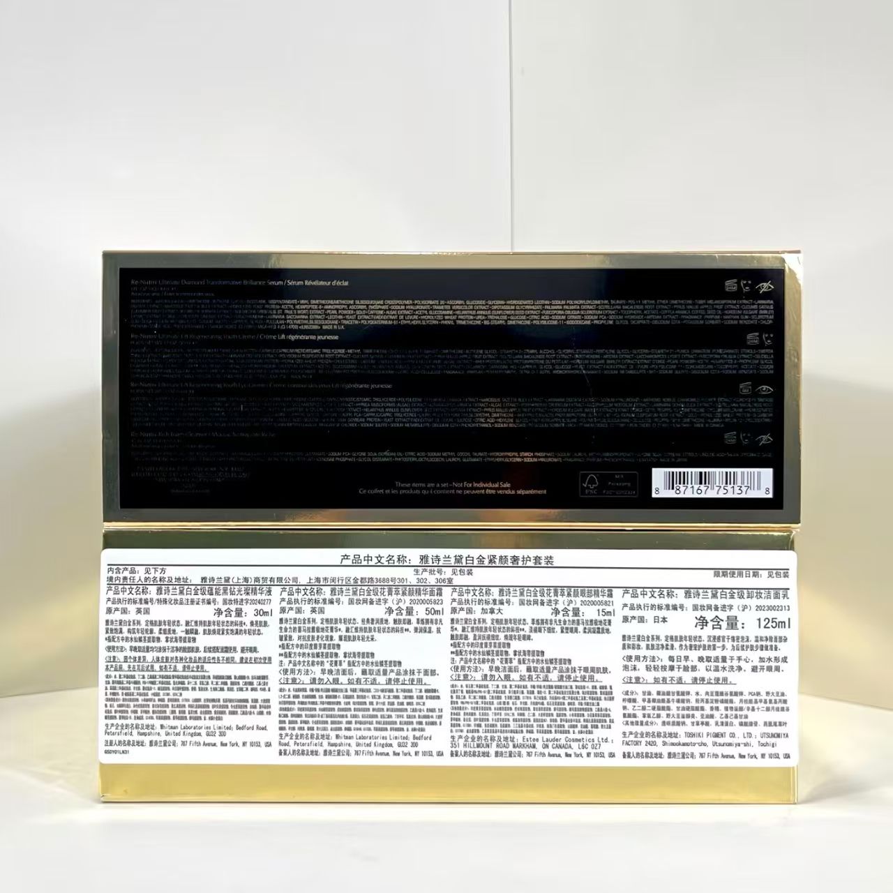 雅诗兰黛白金四件套!内含:黑松露精华30ml+白金眼霜15ml,白金面霜50ml+白金洗面奶125ml。