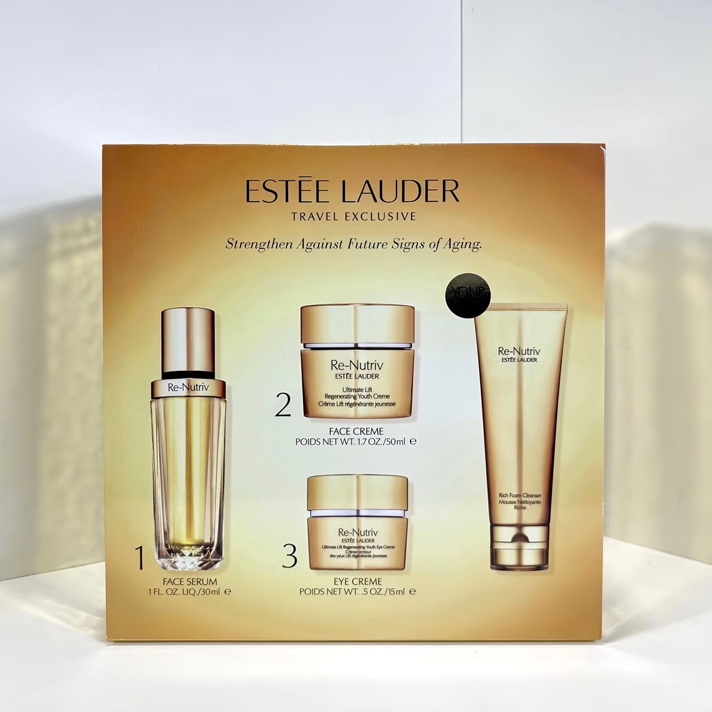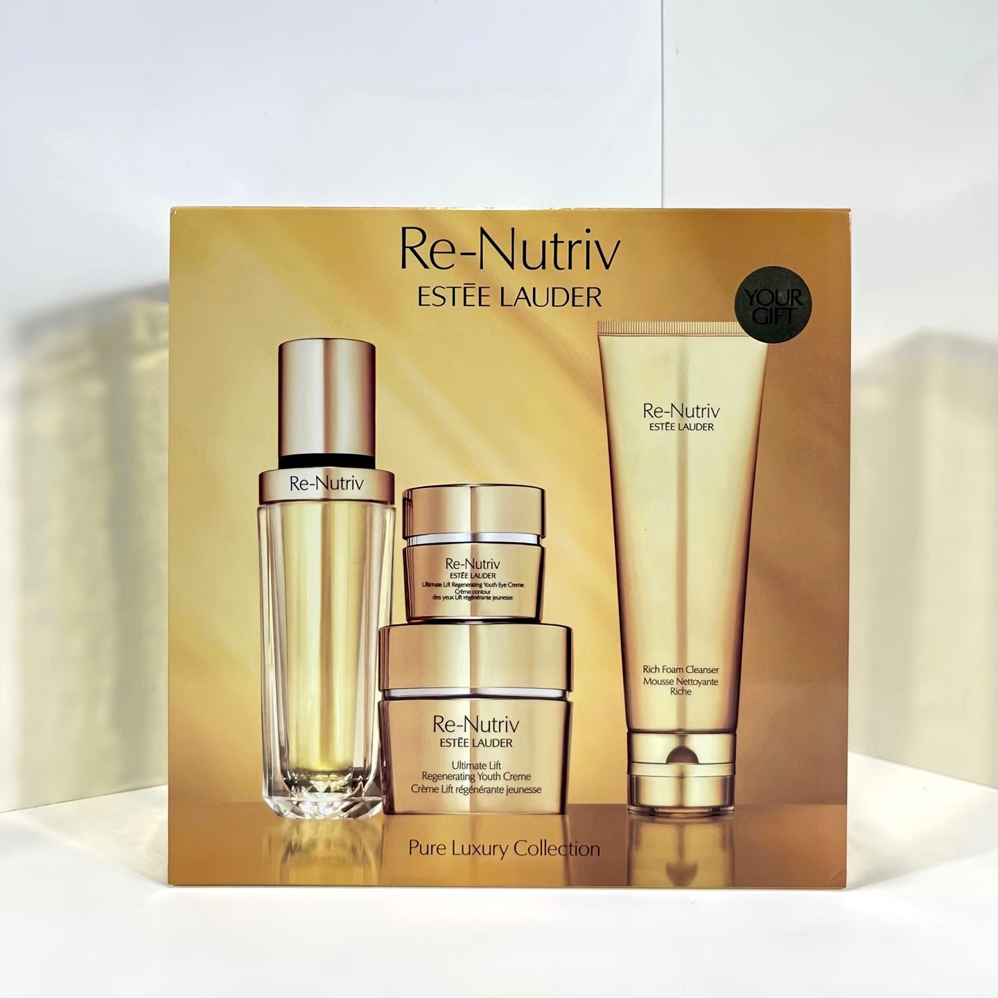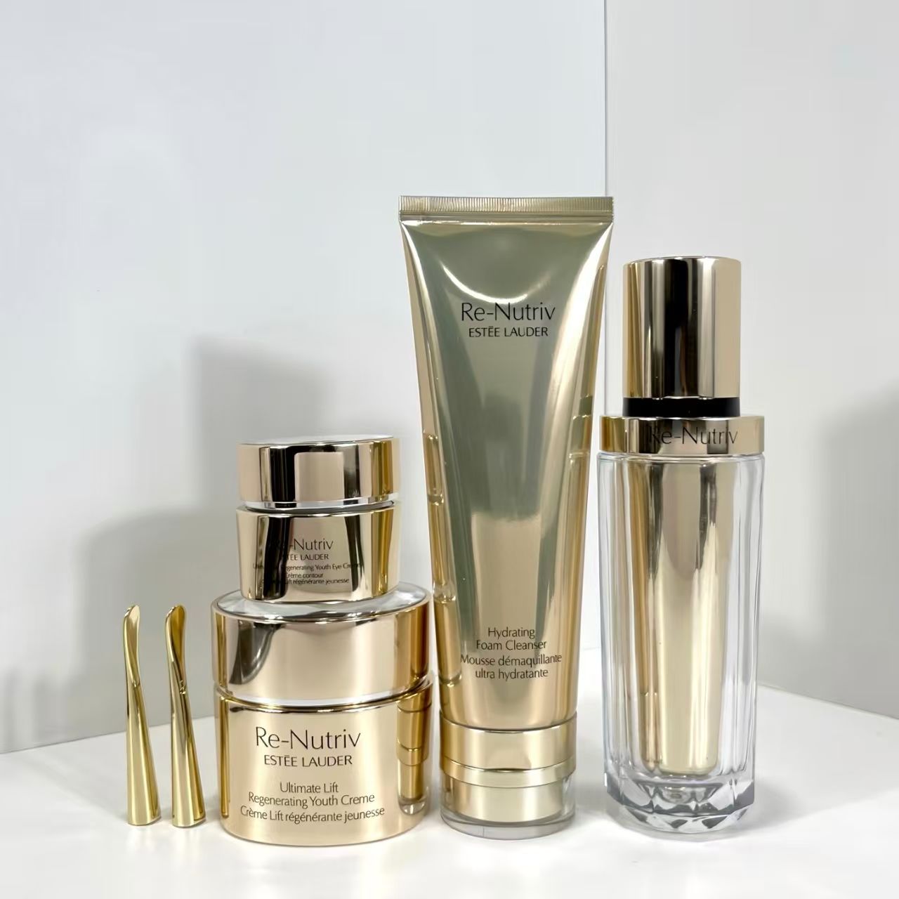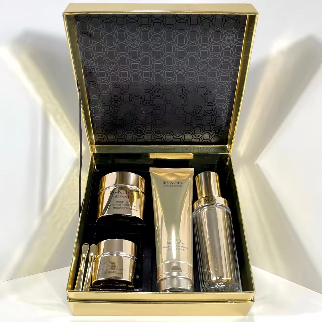 雅诗兰黛白金四件套!内含:黑松露精华30ml+白金眼霜15ml,白金面霜50ml+白金洗面奶125ml。
