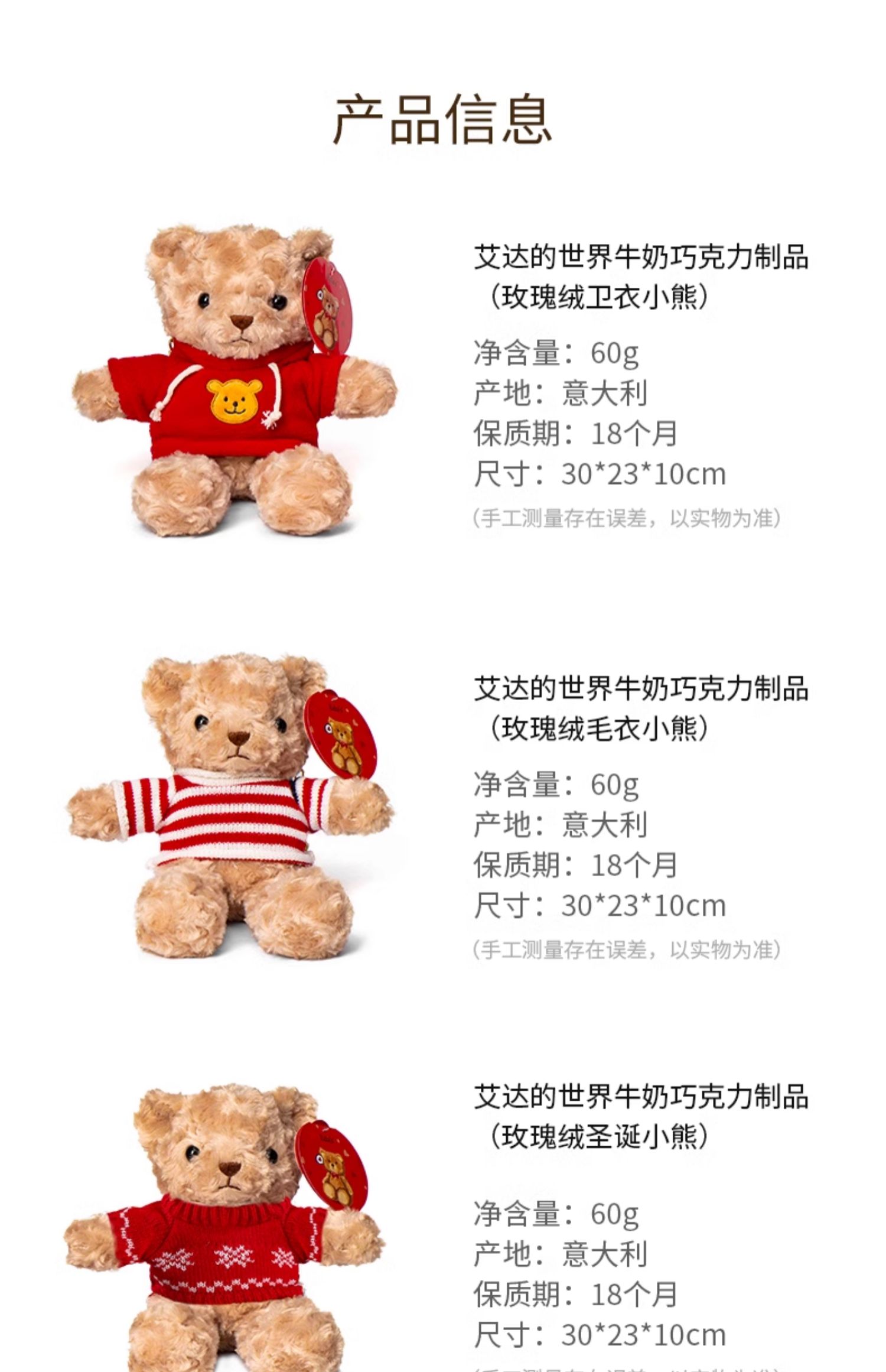 艾达的世界牛奶巧克力制品小熊60g/040963 口感丝滑毛绒玩具小熊可手拿可背挎