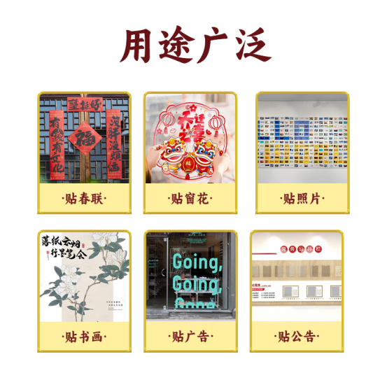 持久耐用 不起皱粘贴牢固拒绝脱落附着力强, 抗风吹雨淋不脱落无波浪痕迹,不起皱▪快干型粘剂浓稠度高涂刷春联胶后, 应在10分钟之内进行粘贴▪适用多种粘贴面玻璃门 /木门 /磁砖墙水泥墙/红砖墙/白灰墙