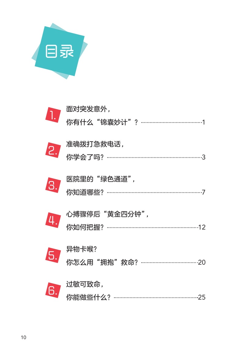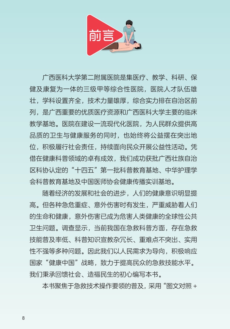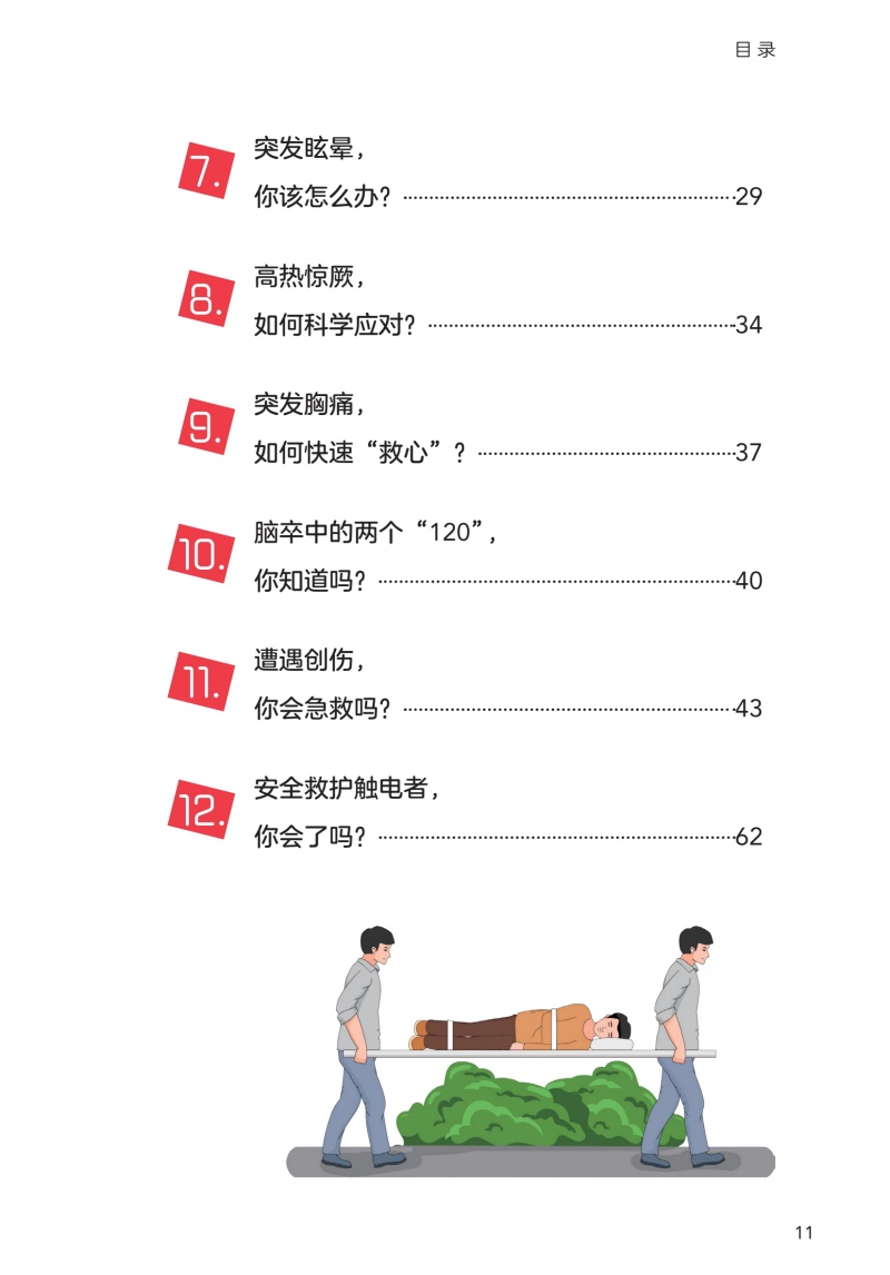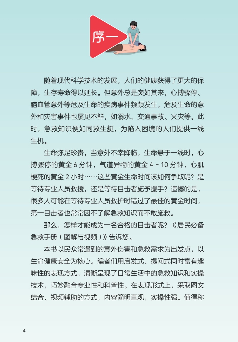 看得懂,学得会,能掌握,正确救护,危急之际救人一命。 本书以我国居民生活常遇到的意外伤害及急救需求为参考依据,从基础急救知识、常见急症、常见事故以及重大突发事件等角度入手,共设计了近20个急救场景的应急处理与预防,包括心脏骤停、异物卡喉、高热惊厥、触电、溺水、烧伤等,标题直接明了,可方便读者快速查找学习。 每个情景按情景导入、急救要点(口诀)、急救说明及注意事项编写,以场景模拟插画为主,简明文字为辅,均搭配有直观立体的急救技能教学视频,旨在为民众打造一本实用性强的急救科普手册。