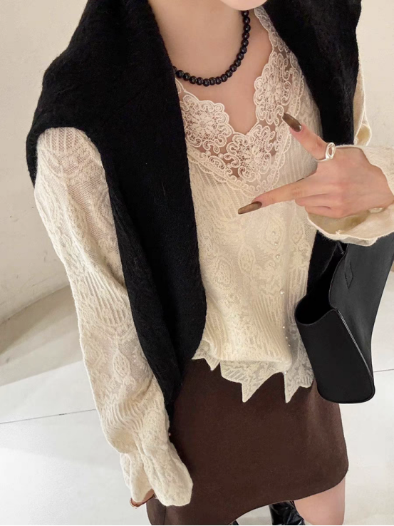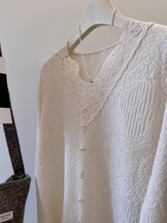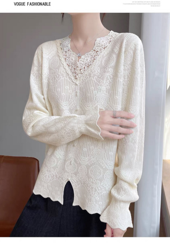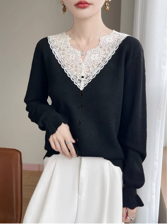 🔥这件「小香风欧根纱拼接花边羊毛混纺针织衫」火了👍小香风欧根纱花边拼接的设计,轻松穿出高级感❗️ ✨秋冬叠穿王者来了❗️ 「V领针织衫」完美解决搭配烦恼!