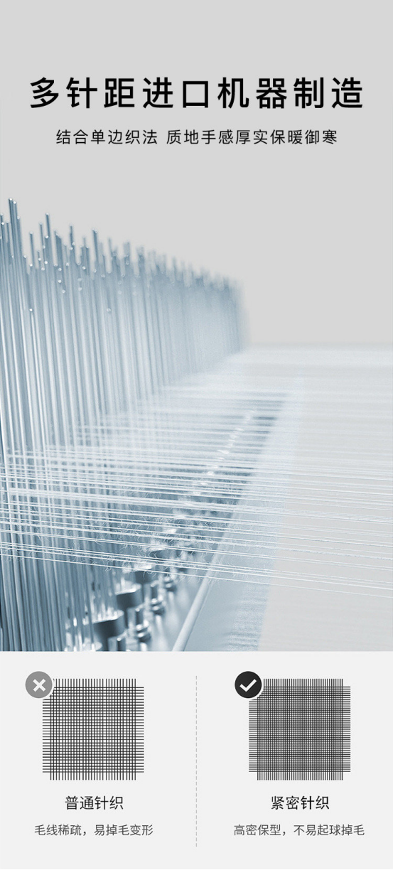 羊毛混纺针织提花面料 结合了羊毛和其他纤维的特性,柔软、保暖 具有良好弹性的同时,增加了面料的强度和耐磨性 针织工艺具有舒适的弹力和贴身感 提花设计赋予了丰富的立体感 (白色微透需穿内搭)