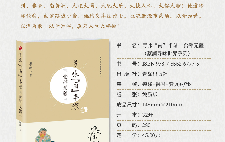 图书:这是一套看着看着馋虫会叫的书,这是一套读着读着心向往之的书。书中,蔡澜以寻味为目的,开启全球美食之旅。人间百味,非酸甜苦辣可以概括;世态万千,岂INTERNET可以尽览。若是不能亲历,那么自是翻开这套书,看蔡澜说说也好。