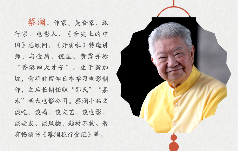 蔡澜,作家、美食家、旅行家、电影人,《舌尖上的中国》总顾问,《开讲啦》特邀讲师,