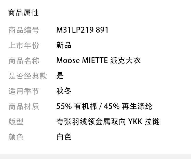 MOOSE KNUCKLES 长款带帽无毛领 女士羽绒服 白色 M31LP219 891