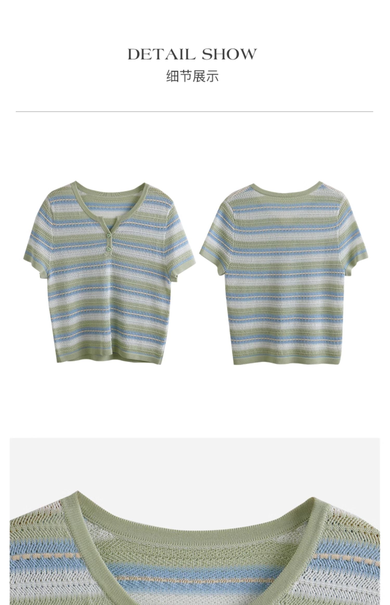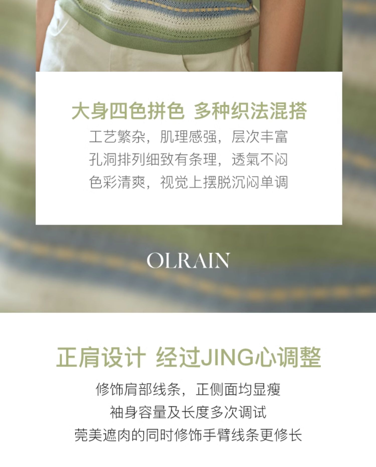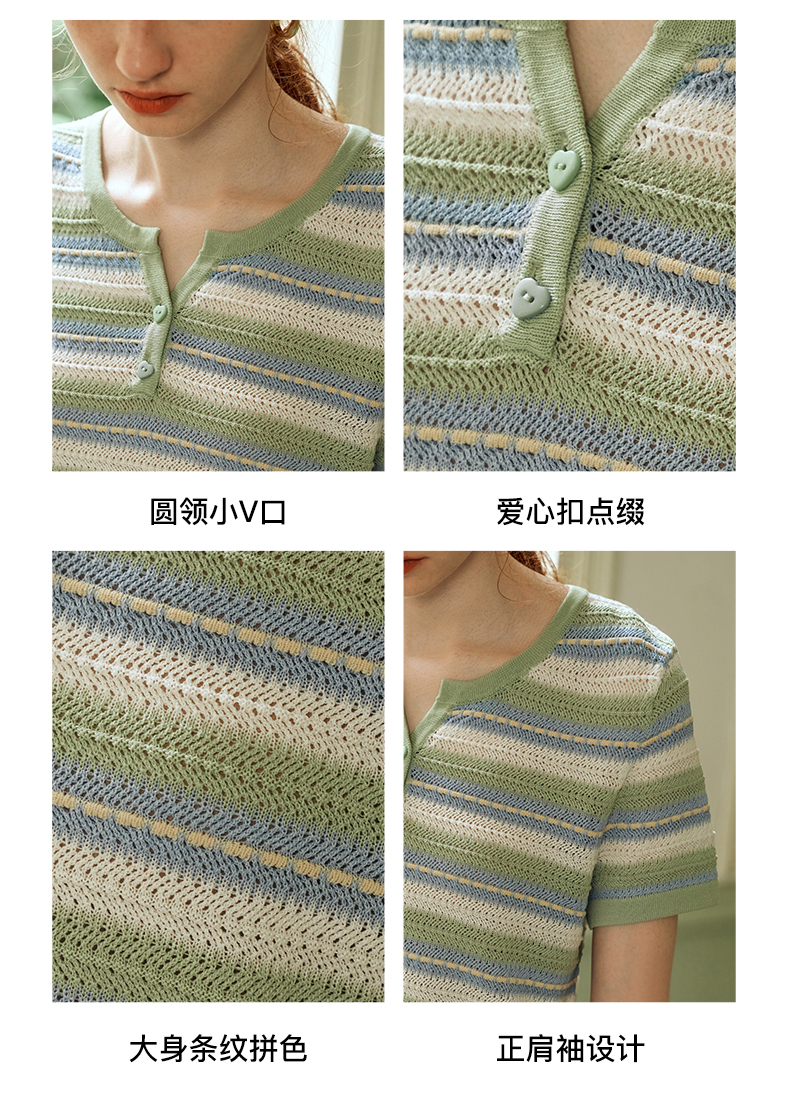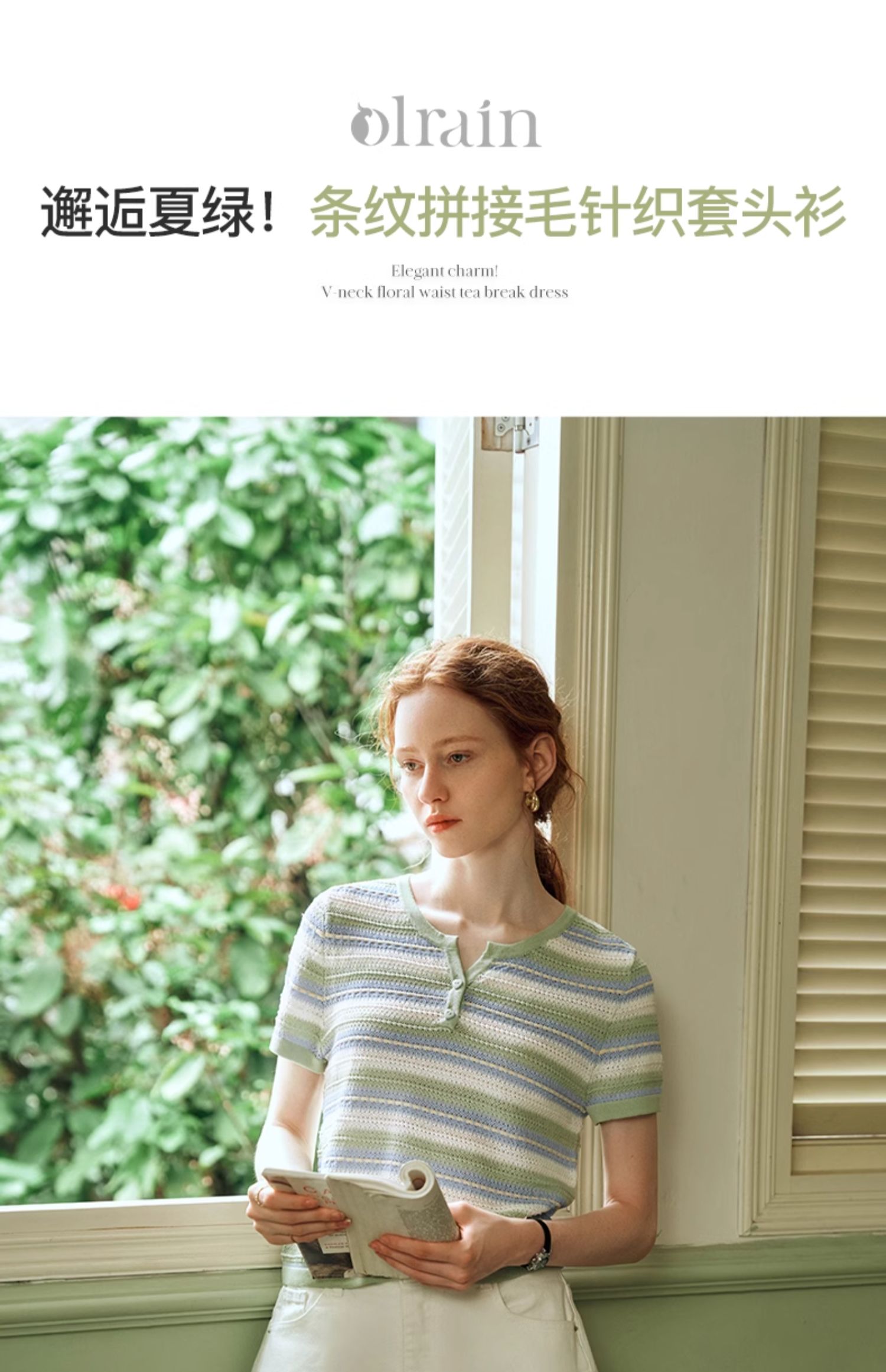 OLrain欧芮儿条纹V领针织衫女夏季2024年新款时尚镂空短袖上衣