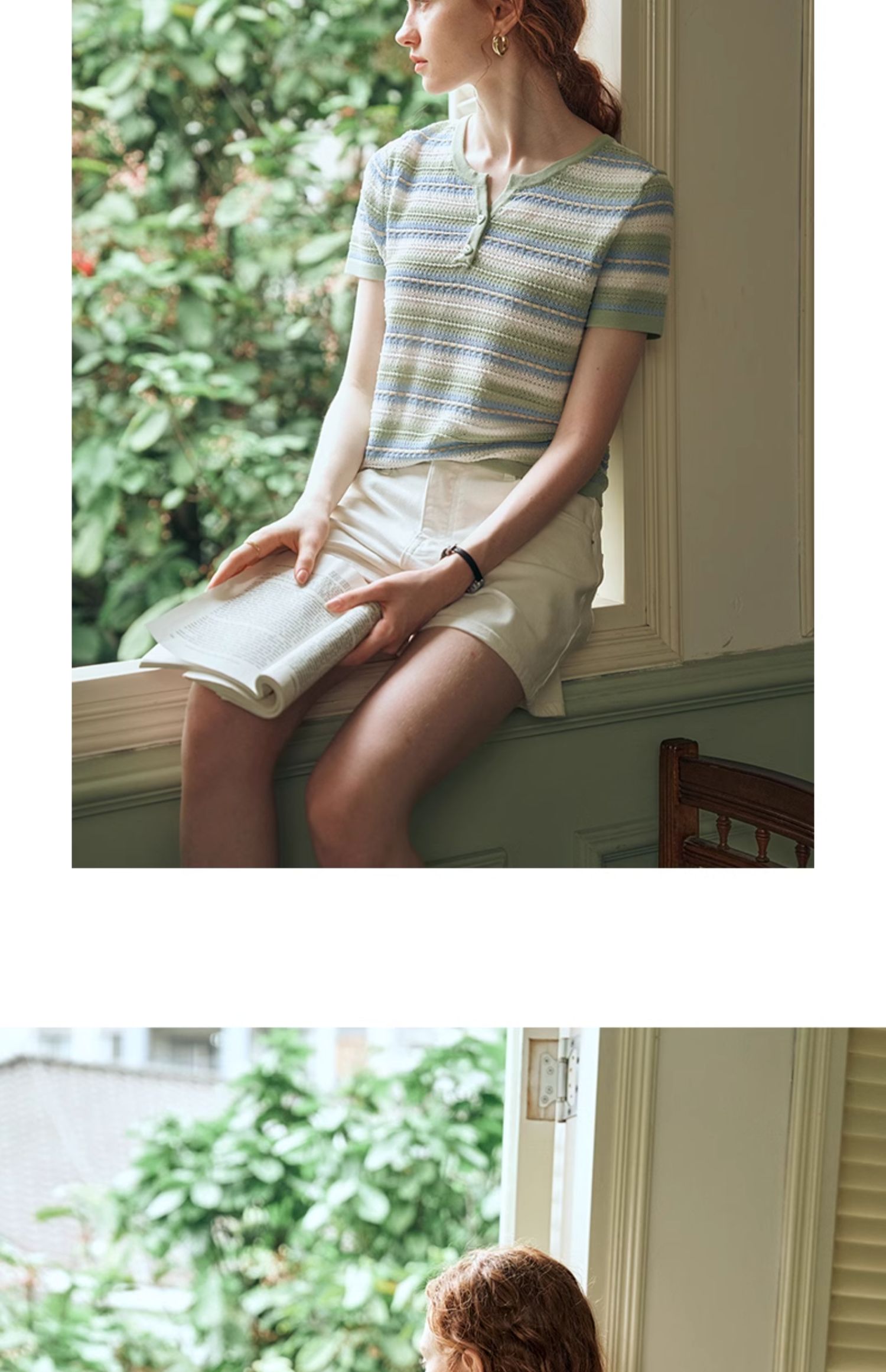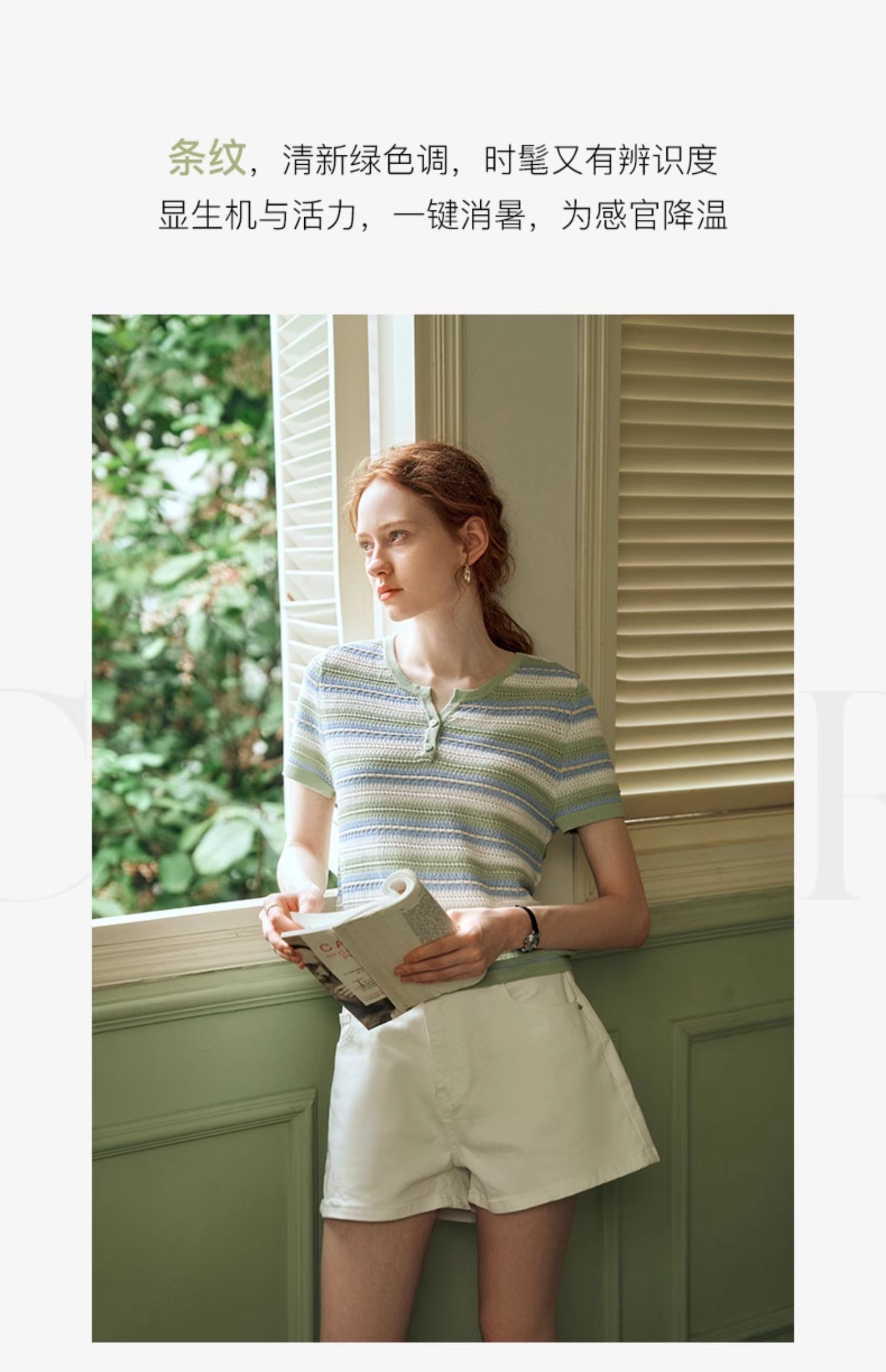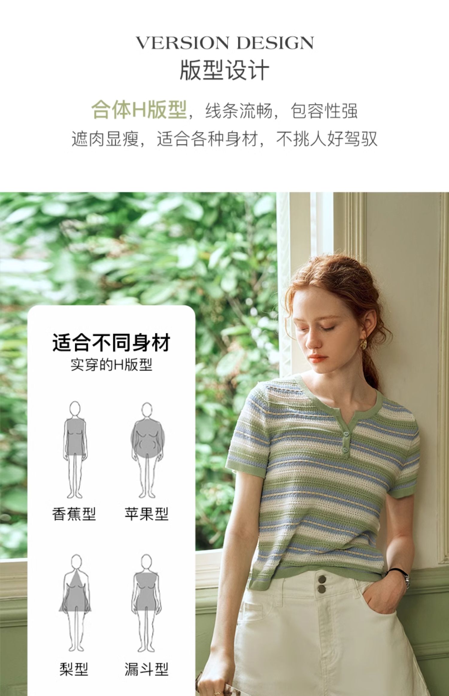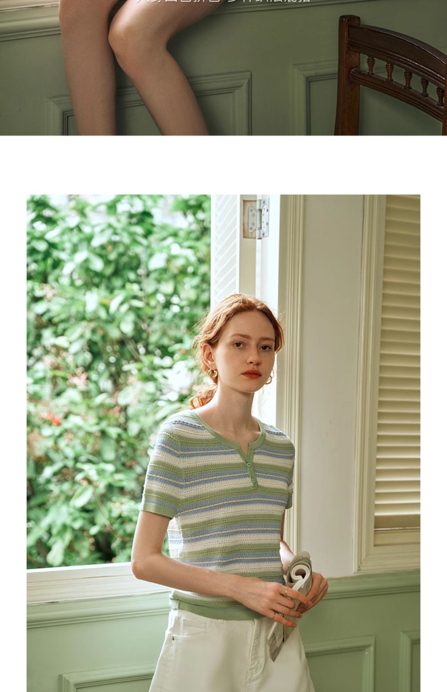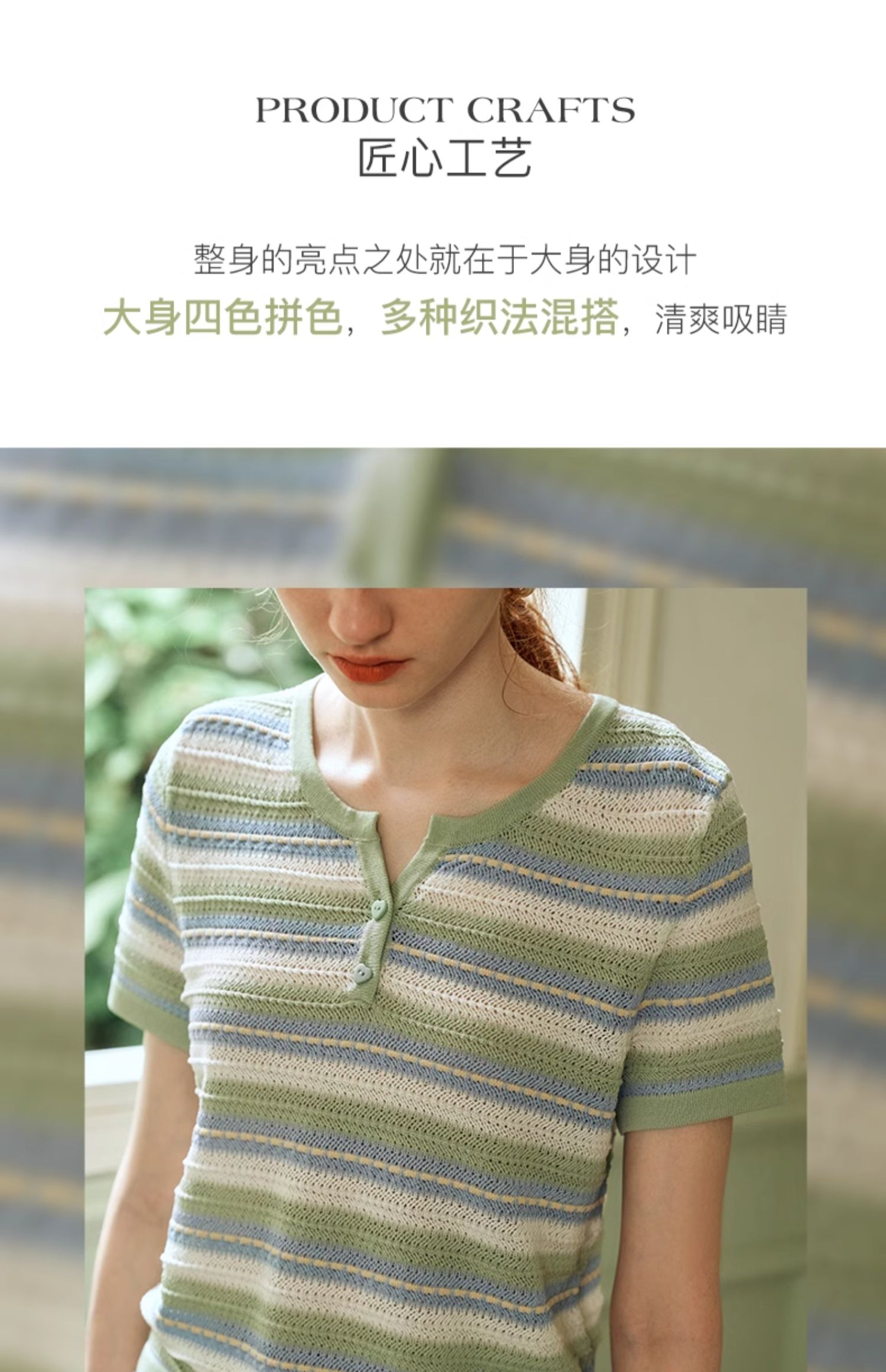 OLrain欧芮儿条纹V领针织衫女夏季2024年新款时尚镂空短袖上衣