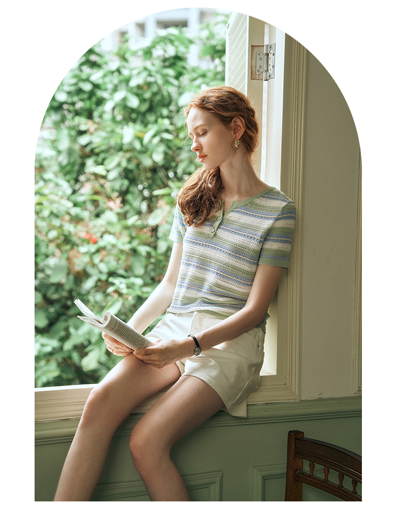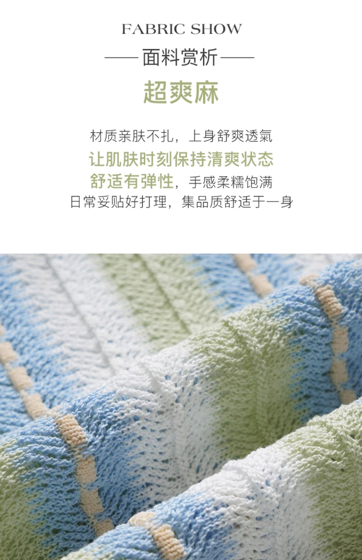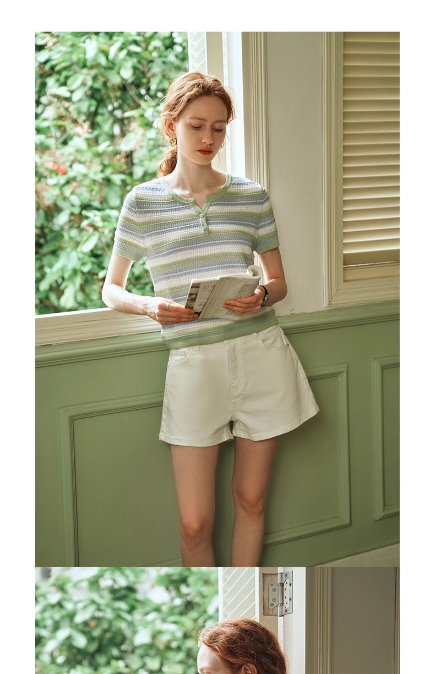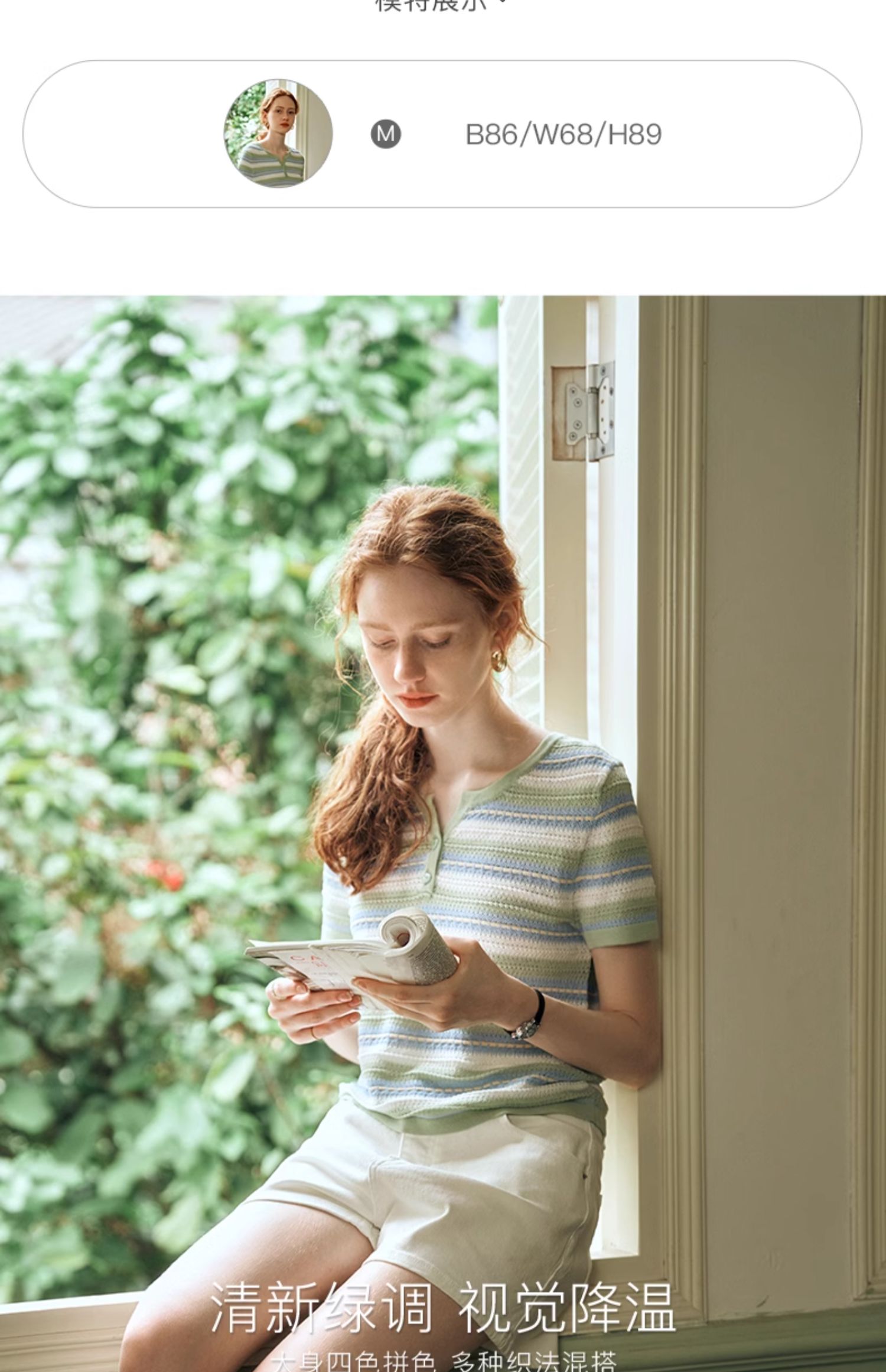 OLrain欧芮儿条纹V领针织衫女夏季2024年新款时尚镂空短袖上衣