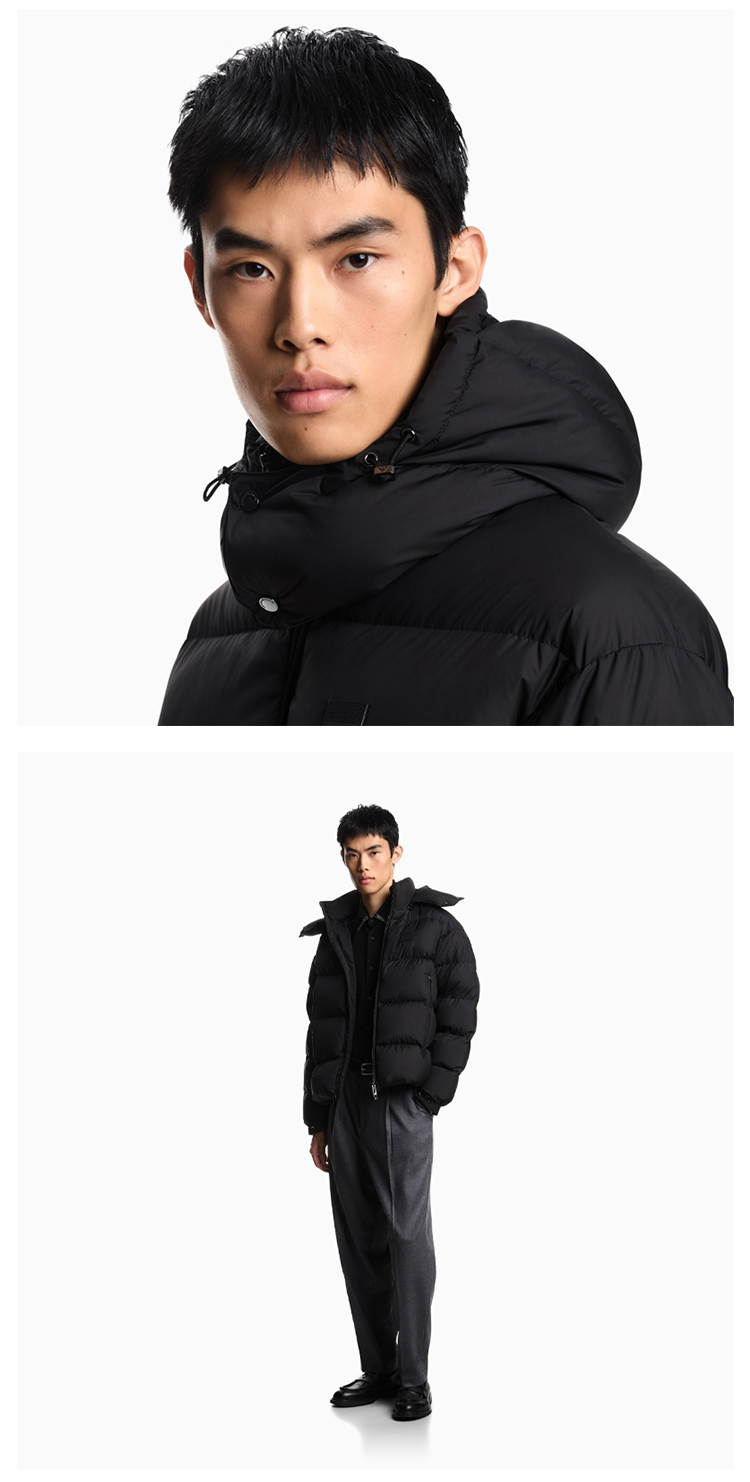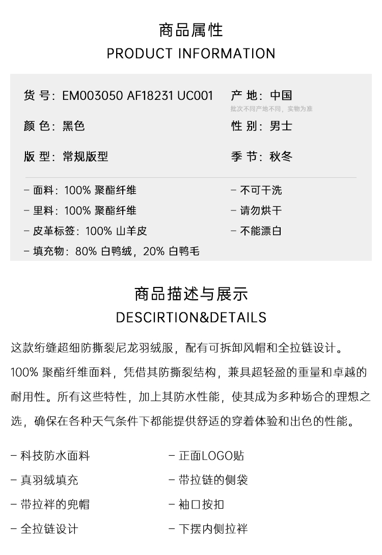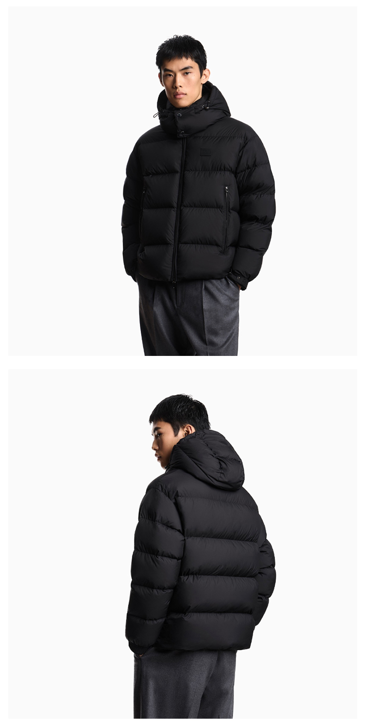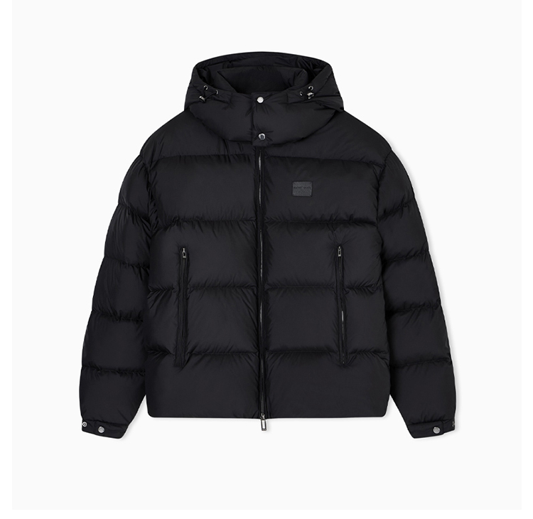 EMPORIO ARMANI 阿玛尼 男士徽标贴片防水绗缝防撕裂尼龙连帽羽绒服 黑色 EM003050 AF18231 UC001