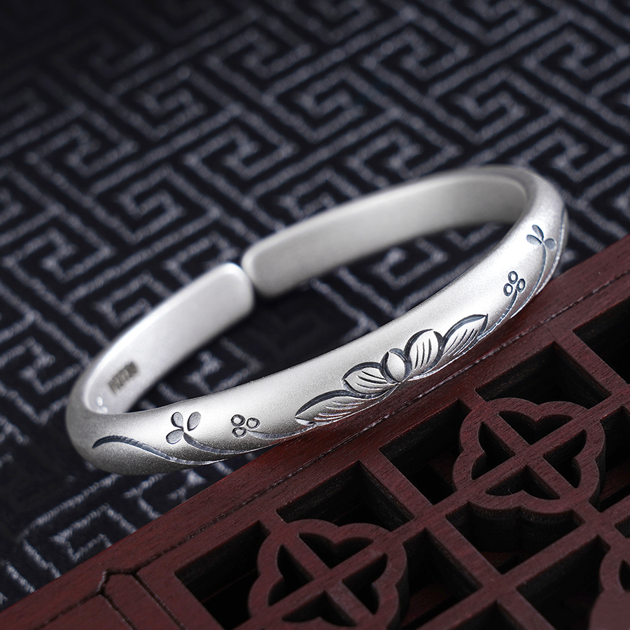 【寓意】:纯银开口手镯,镯面錾刻莲花图案。经仿古做旧处理,似时光轻抚过的诗篇。寓意心守澄明,福泽绵长。