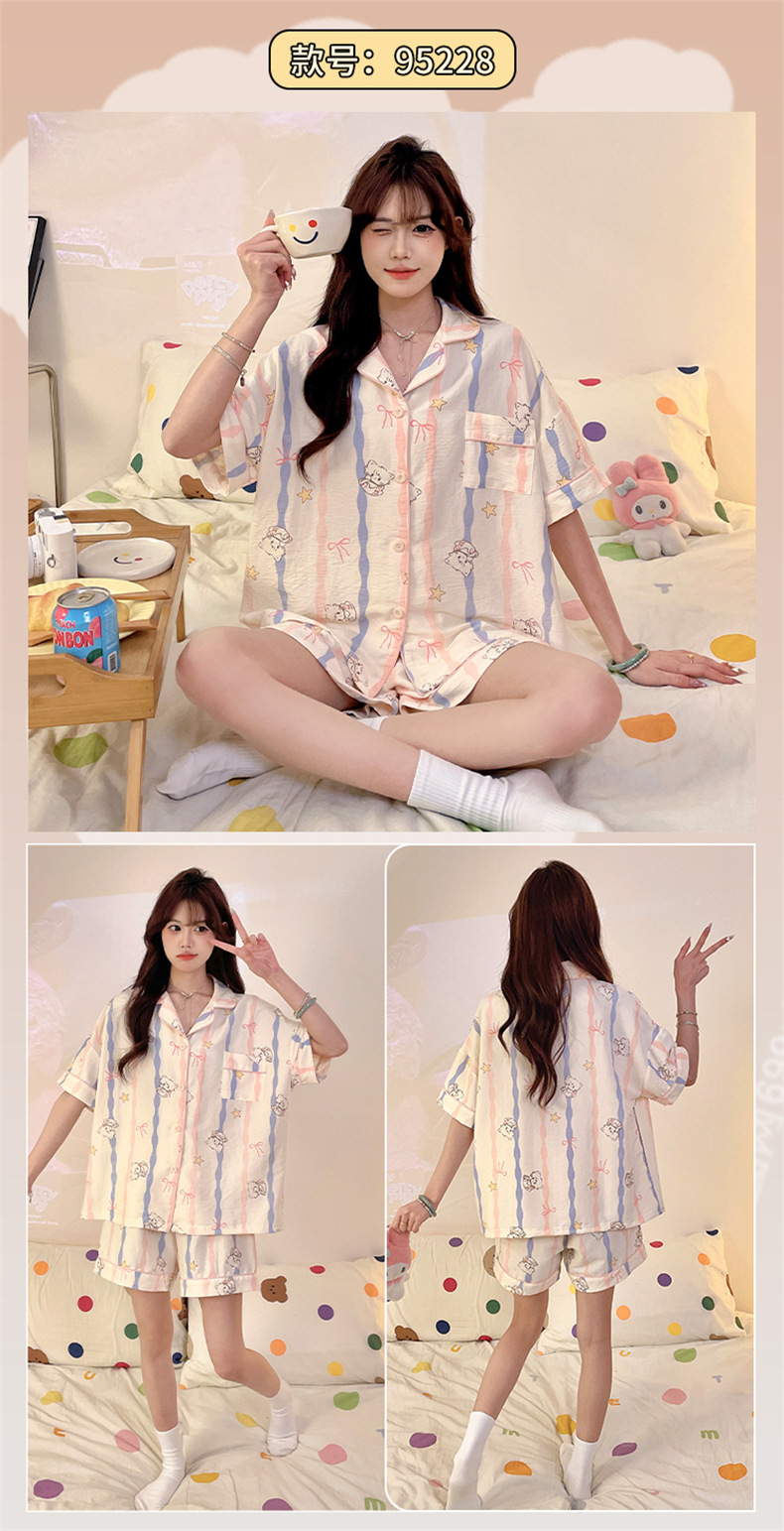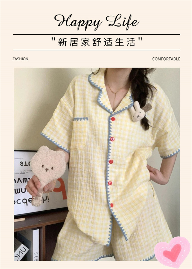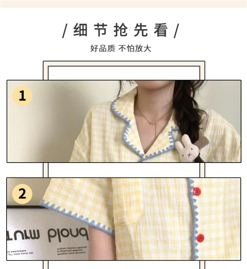 夏季家居秒杀59元【可爱舒适云朵棉睡衣】夏天新款短袖套装 撞色格子开衫家居服