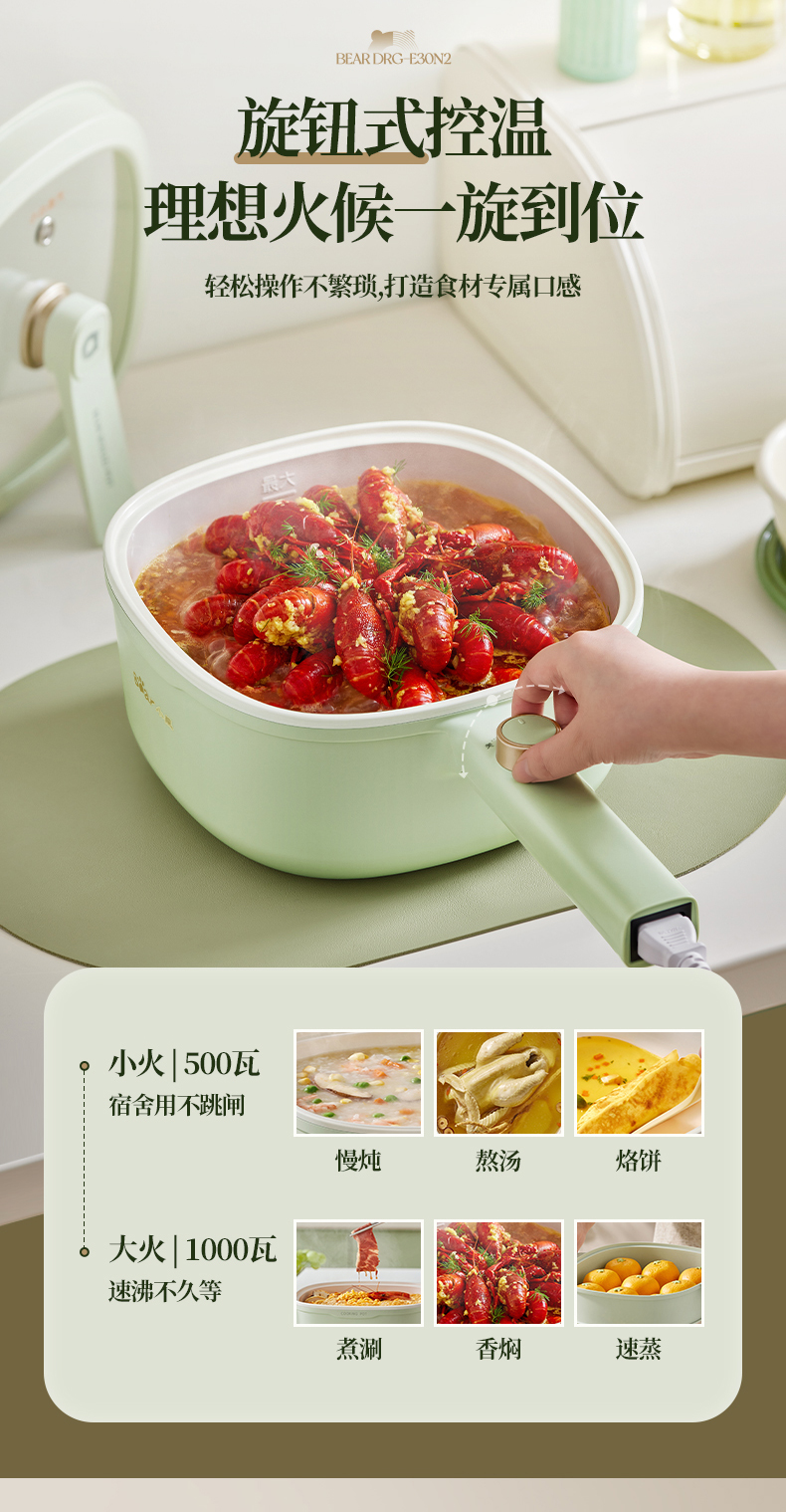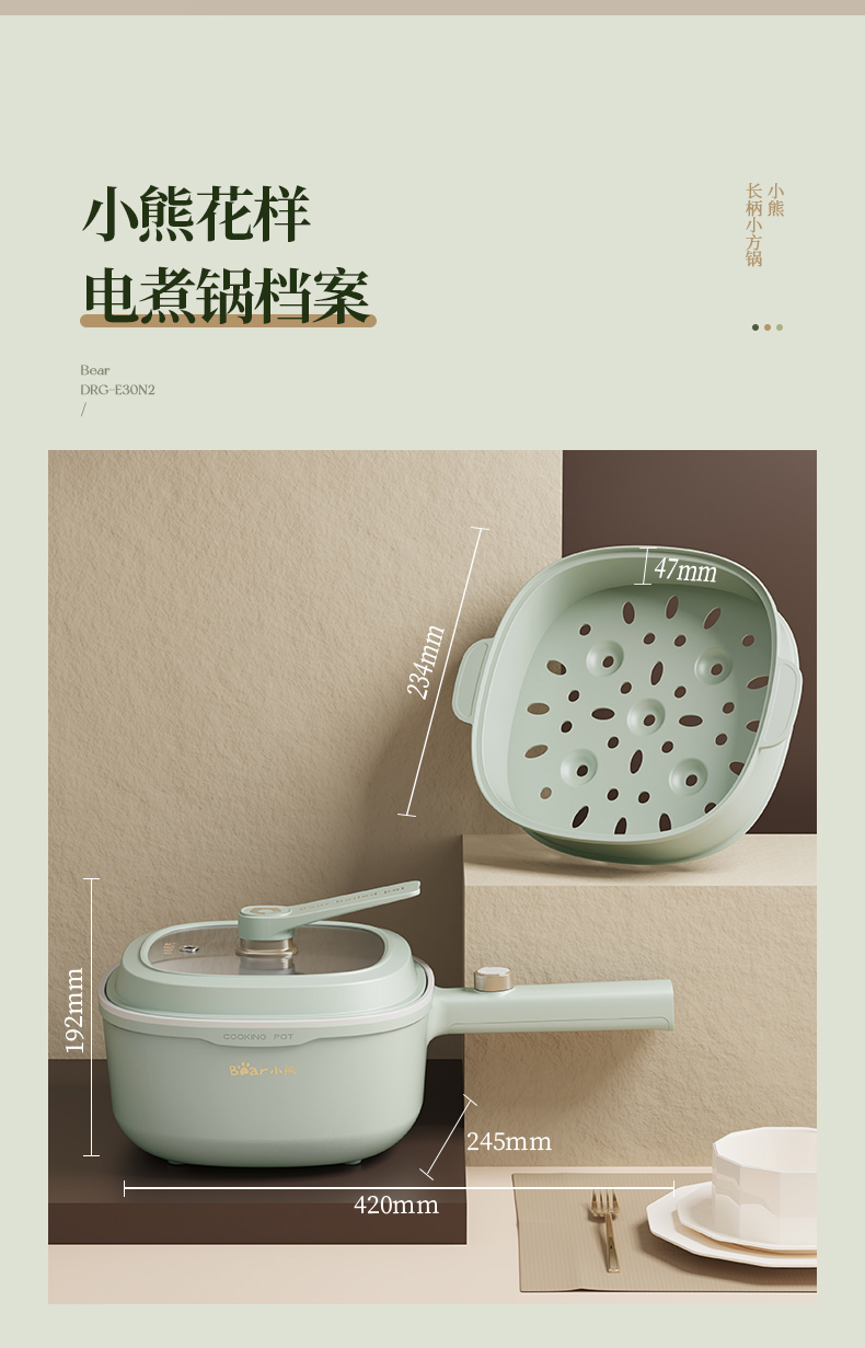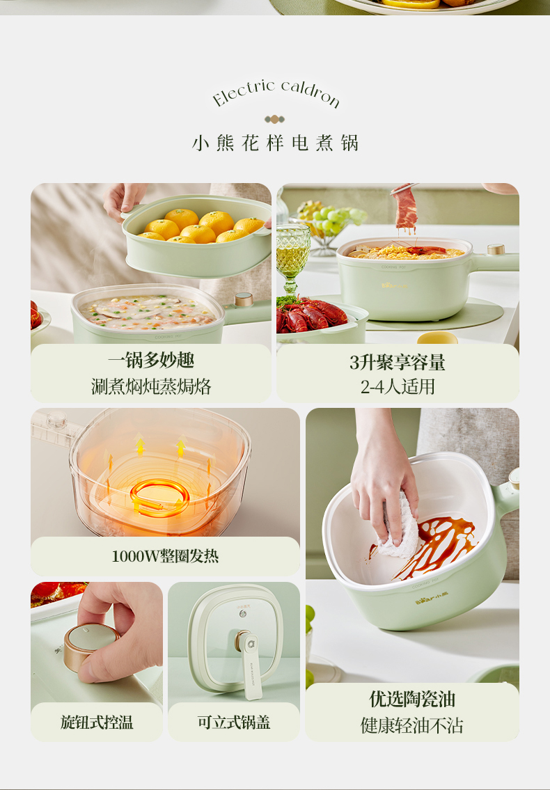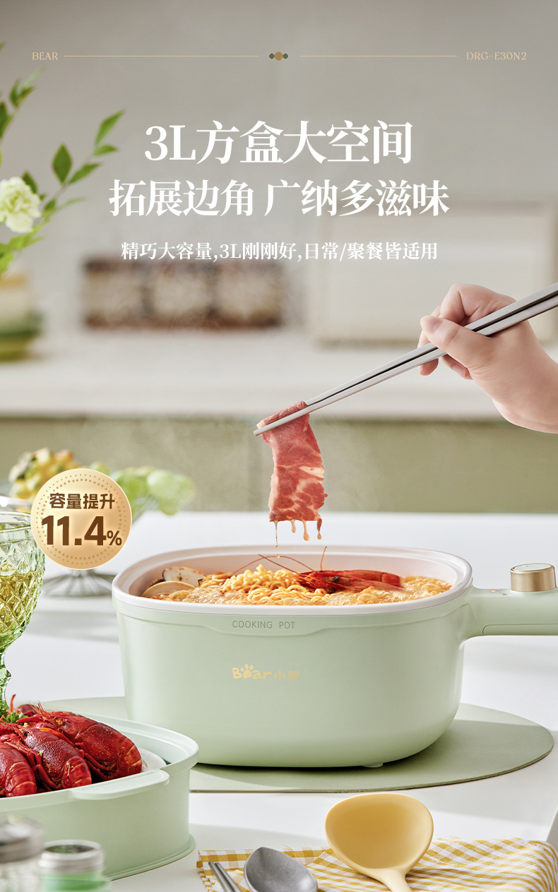 【小程序】小熊(Bear)电煮锅 电火锅 小电锅 电热锅 3L多功能电蒸锅 电炒锅一体 学生宿舍泡面火锅 配蒸笼丨DRG-E30N2