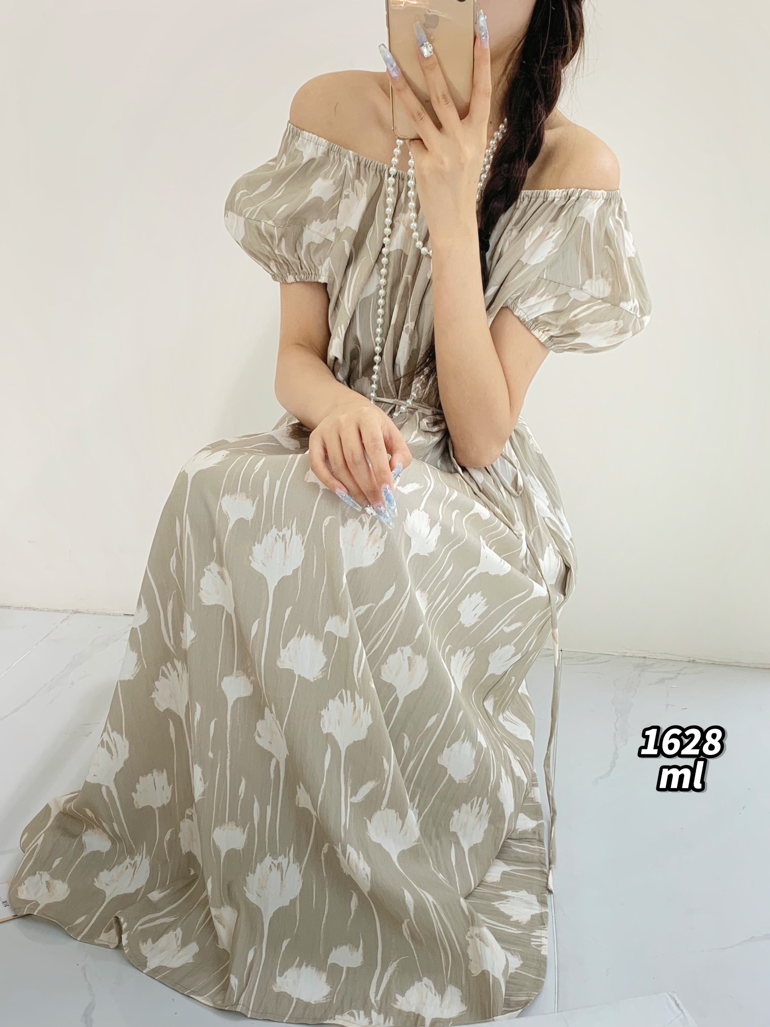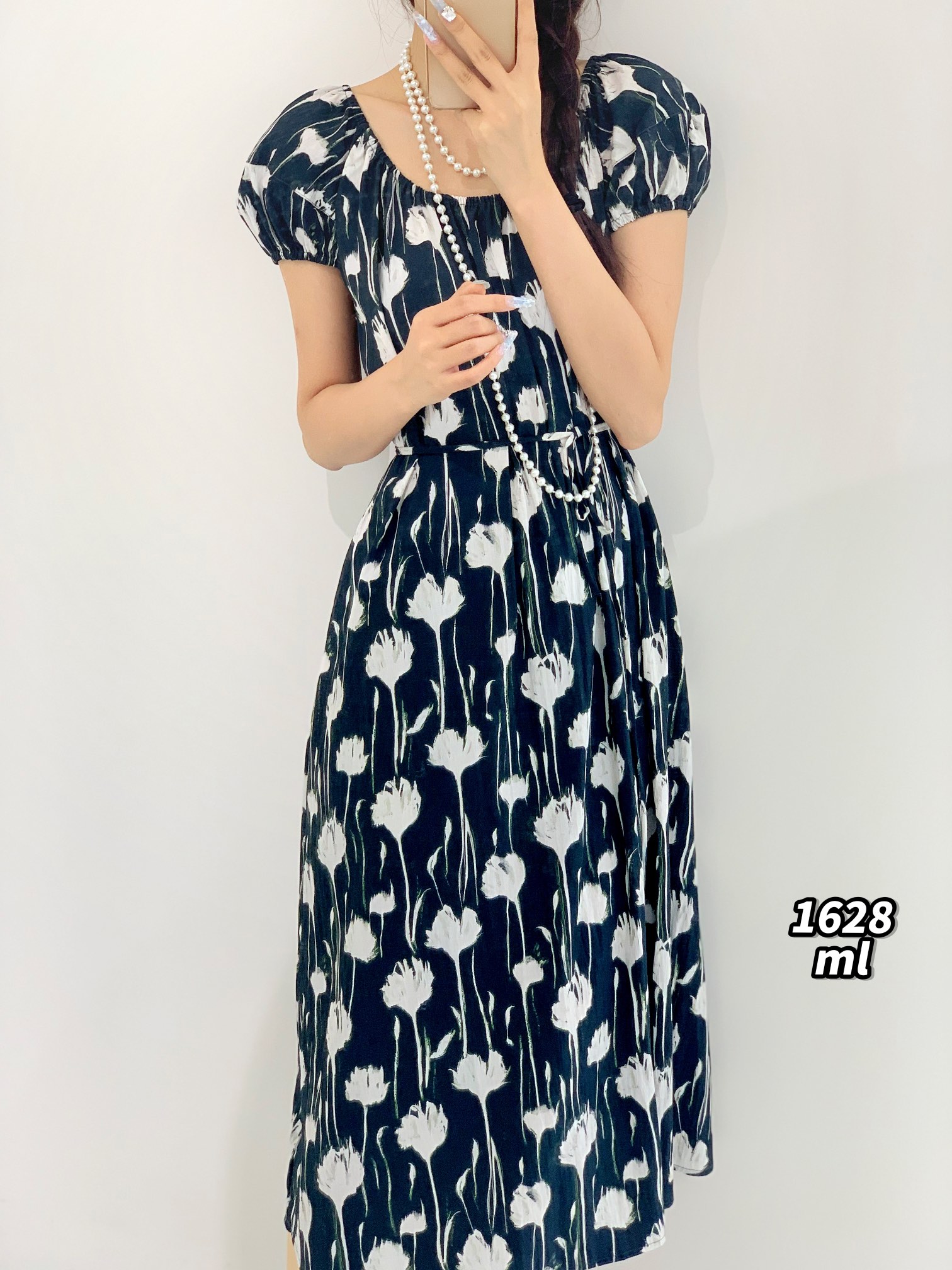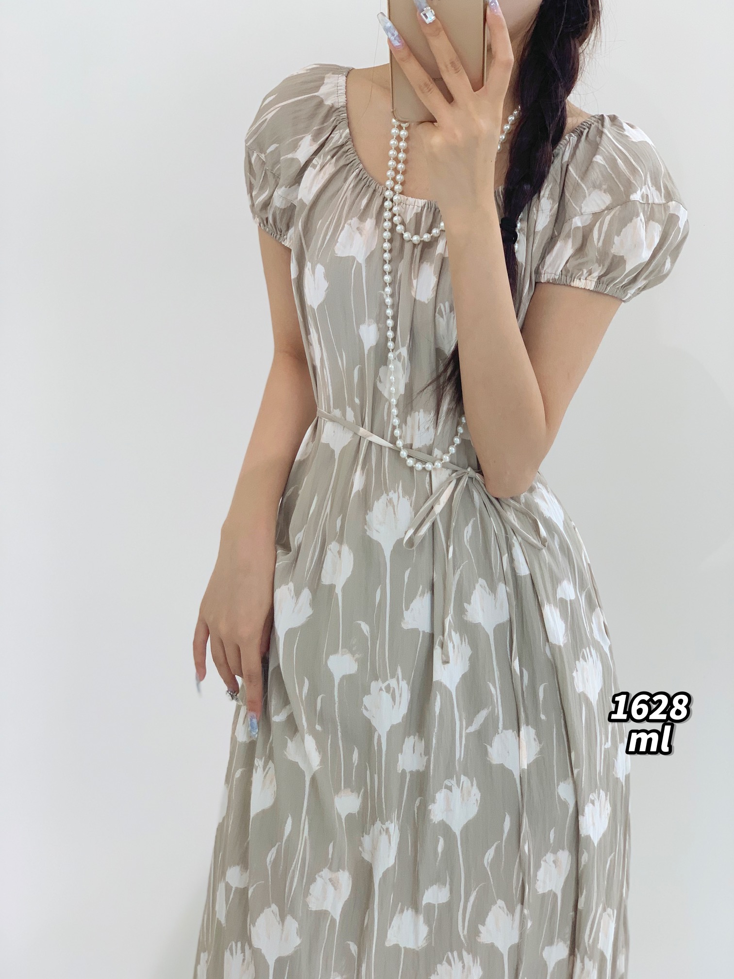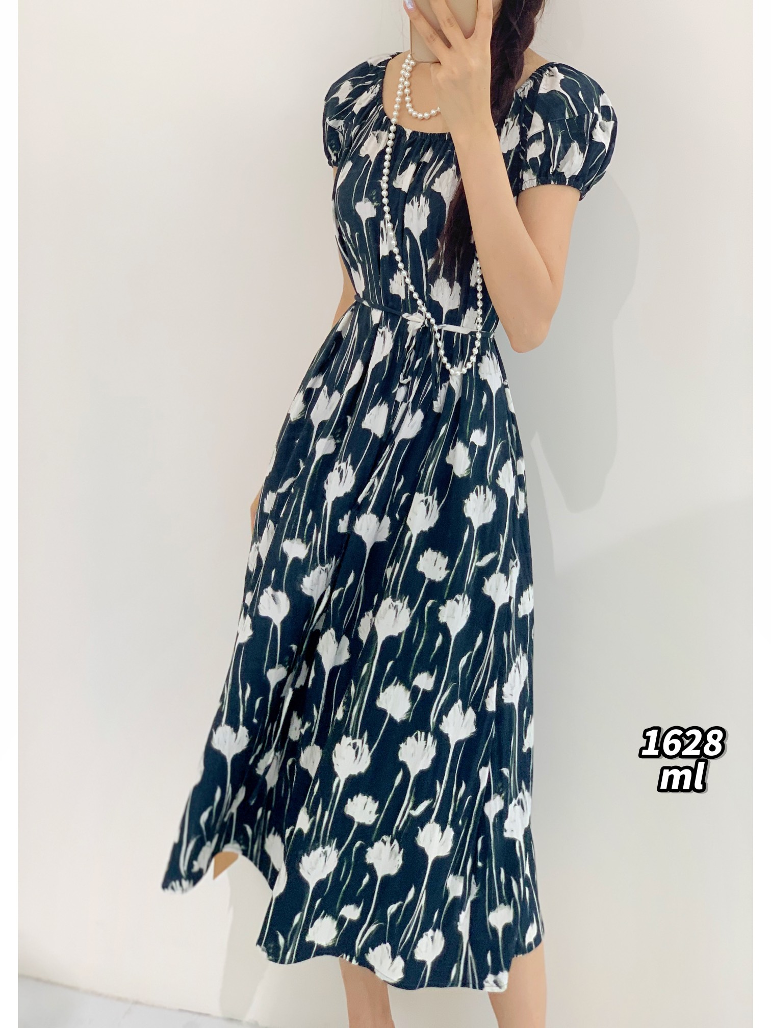34GAR071628#韩系温柔风灯笼袖印花绑带收腰连衣裙