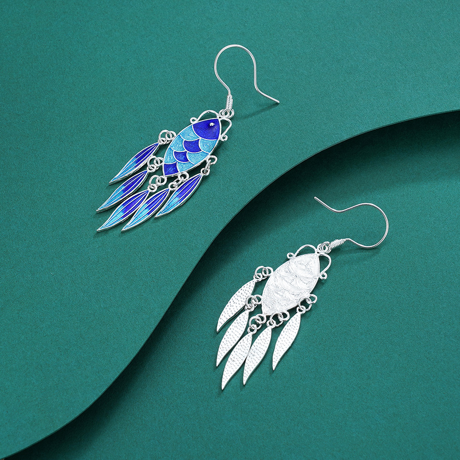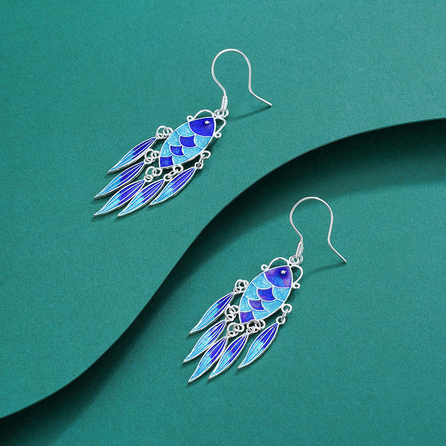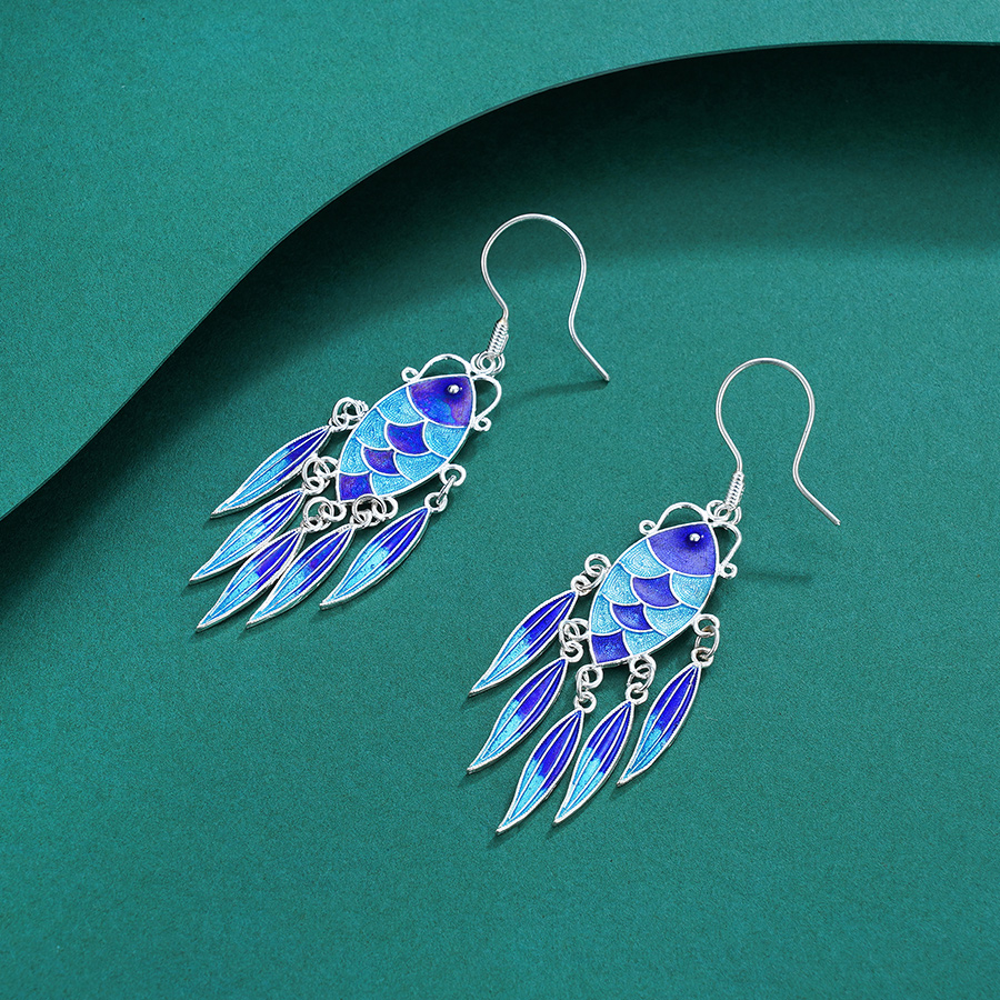【寓意】:耳饰以逐风而舞的鱼旗为灵感设计,花丝工艺勾勒层叠交错的立体构造,辅以景泰蓝填色工艺点染珐琅彩韵,于耳畔绽现流动美韵。