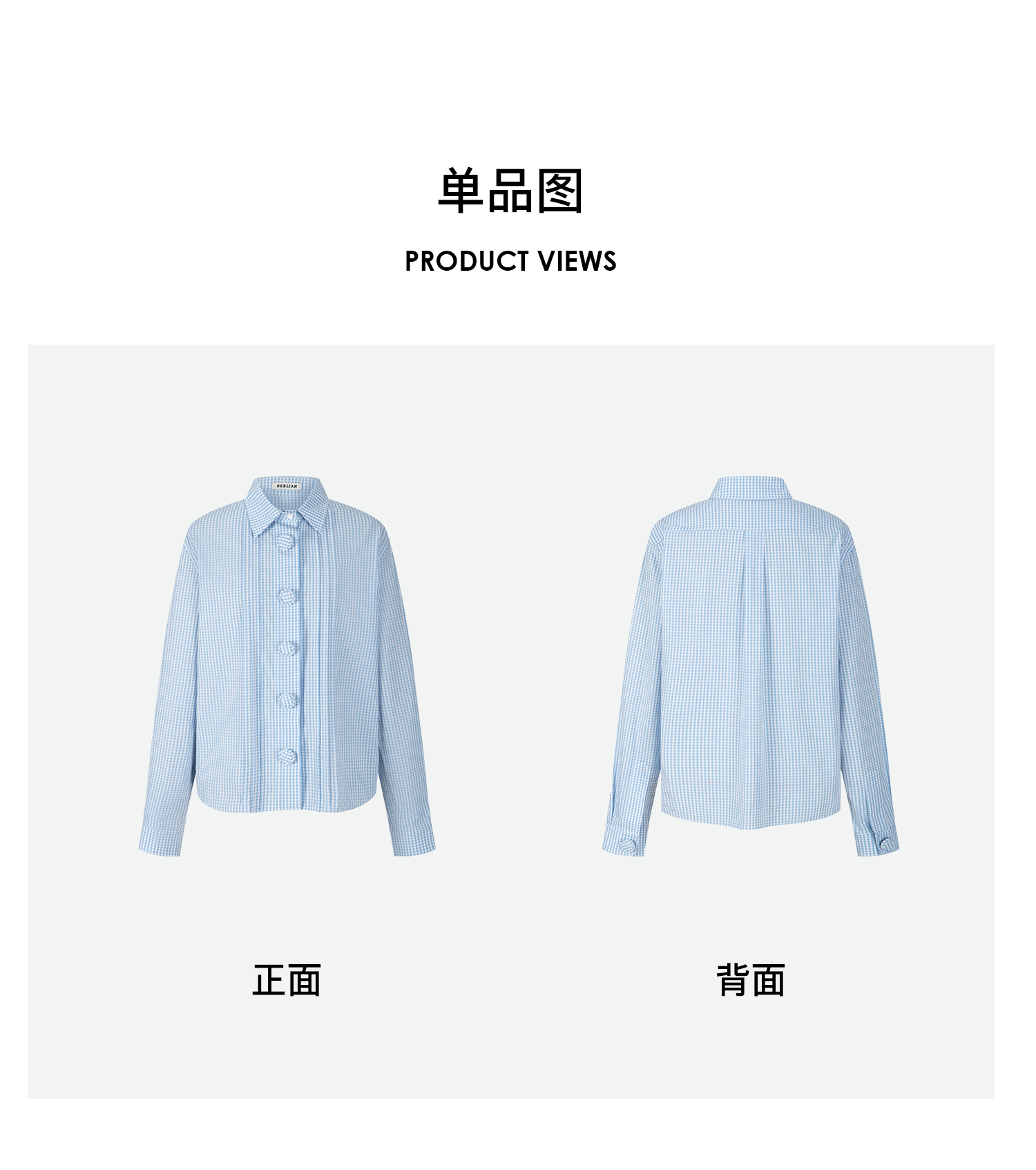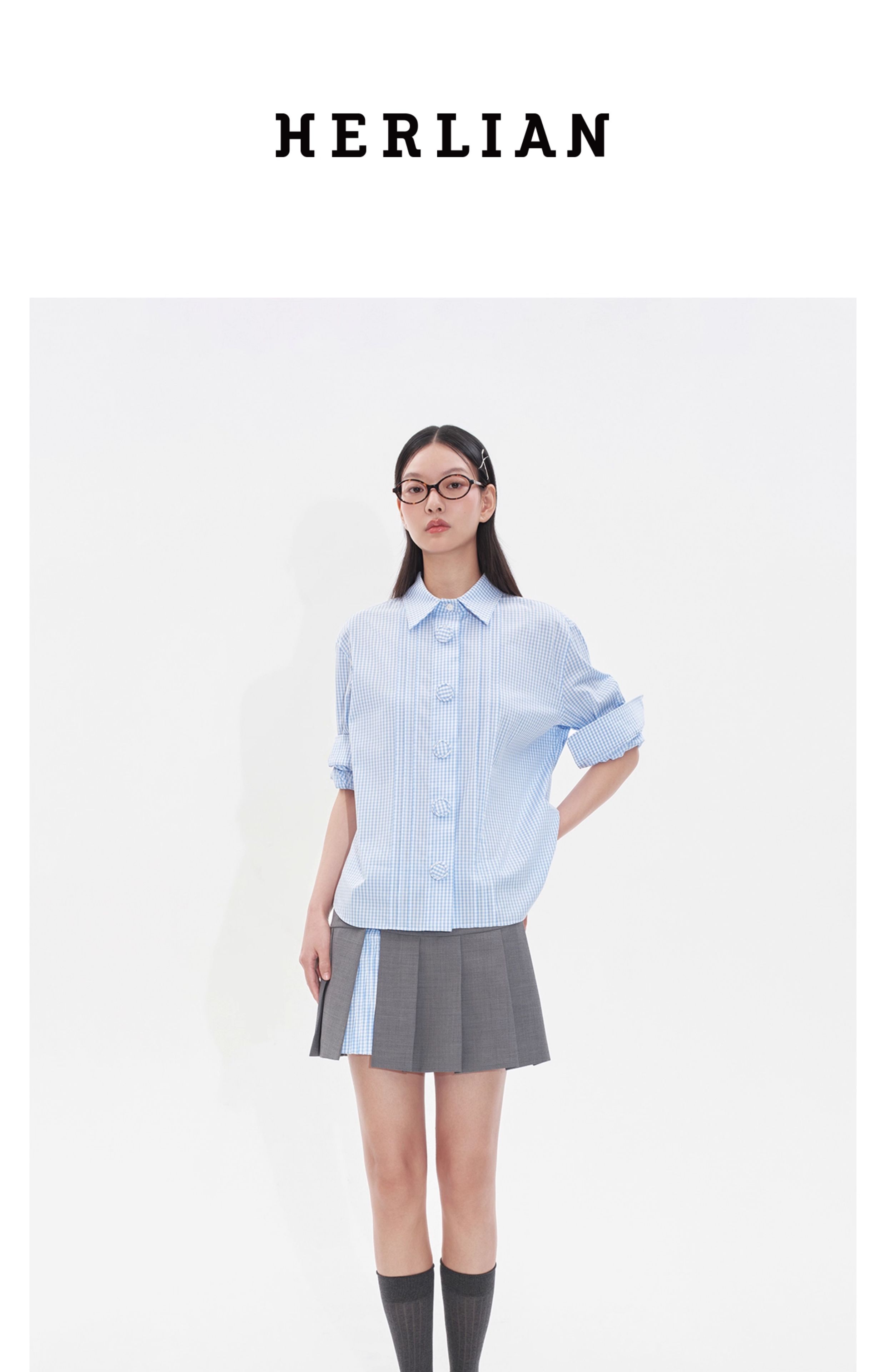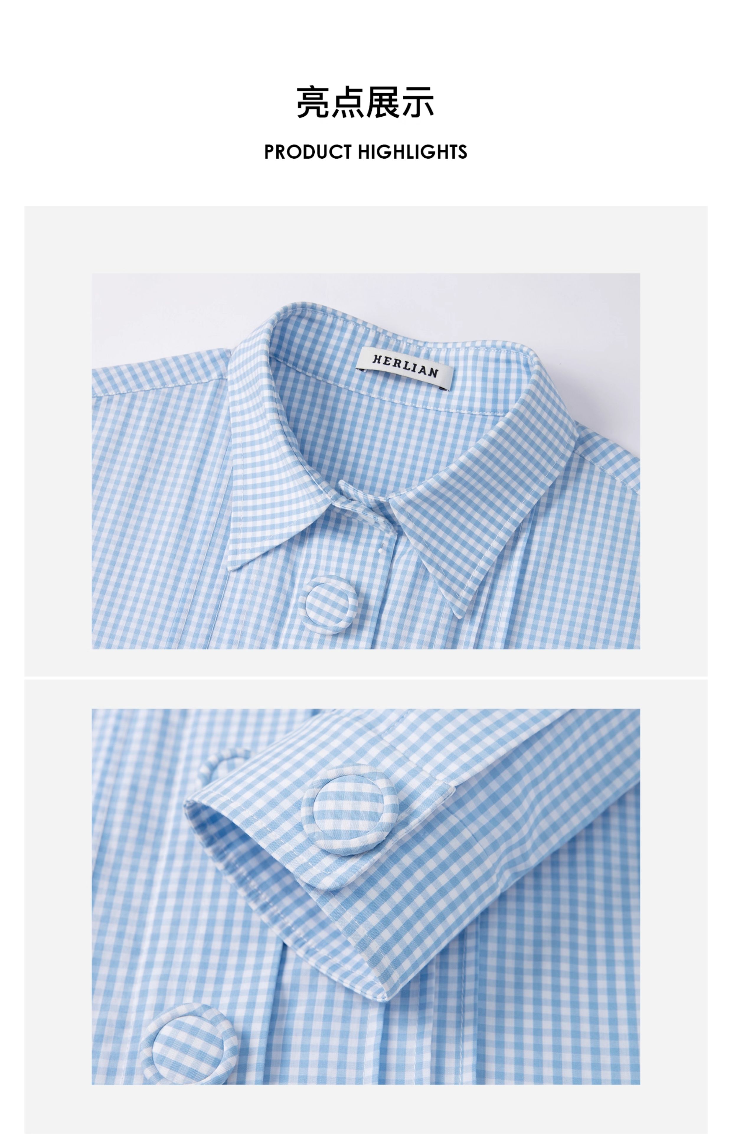 HERLIAN2025年秋季新品女士蓝白格纹衬衫包扣装饰上衣