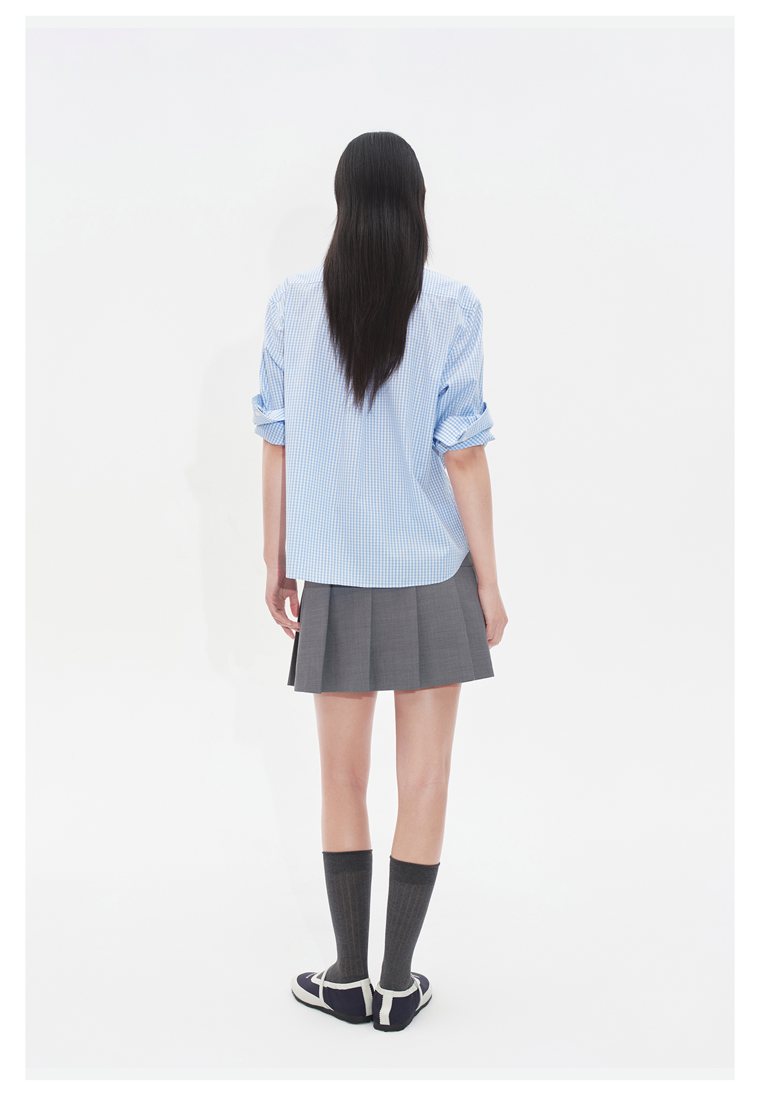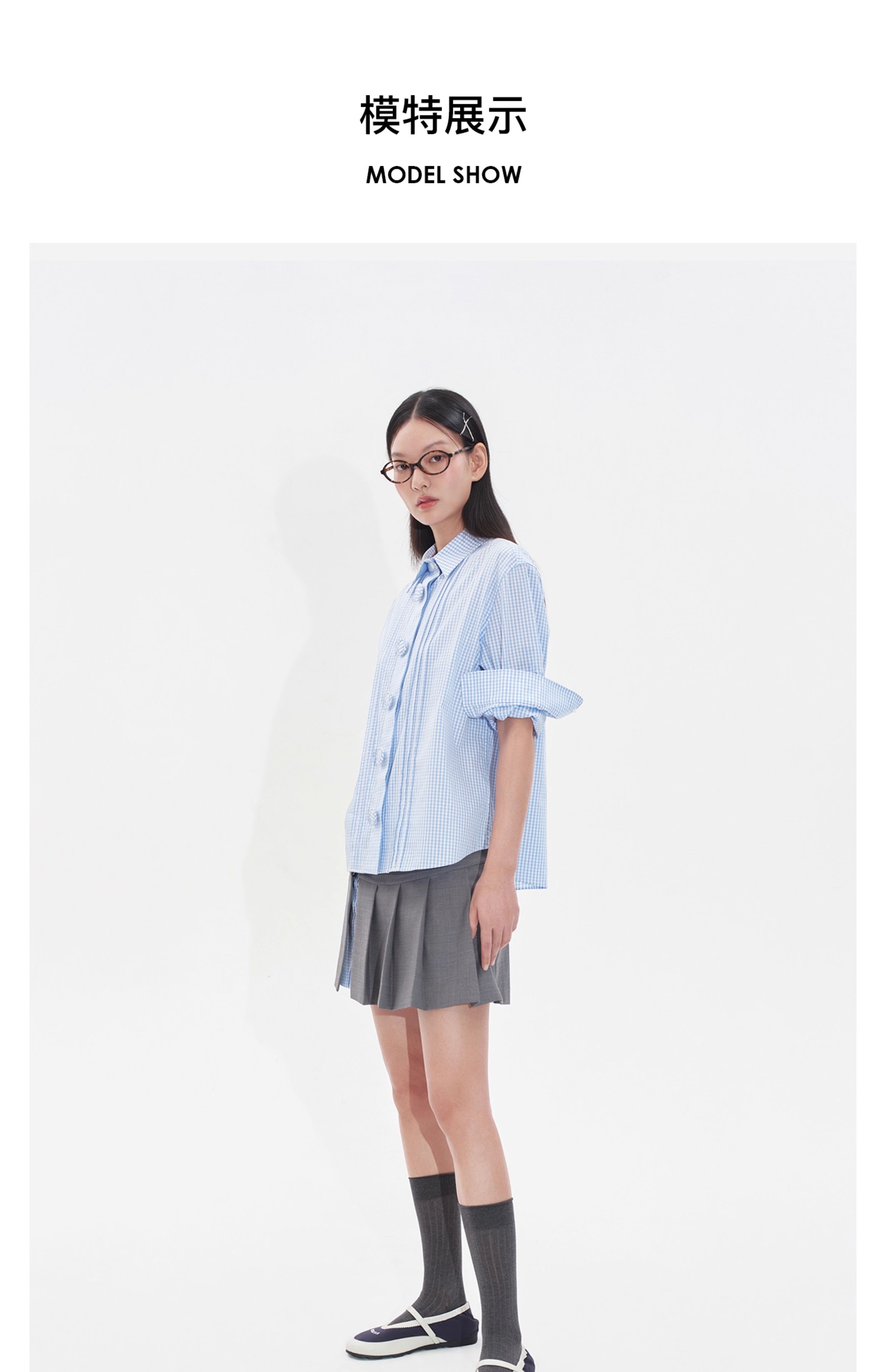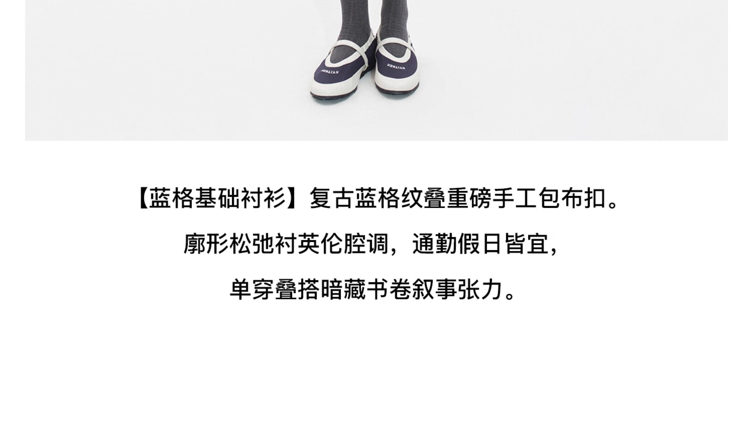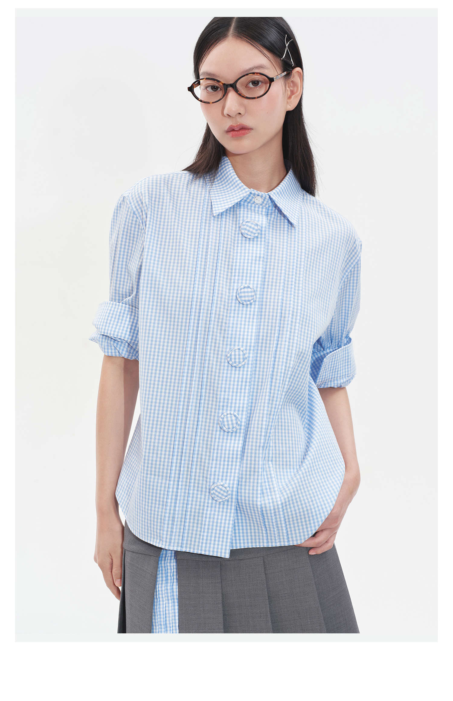 HERLIAN2025年秋季新品女士蓝白格纹衬衫包扣装饰上衣