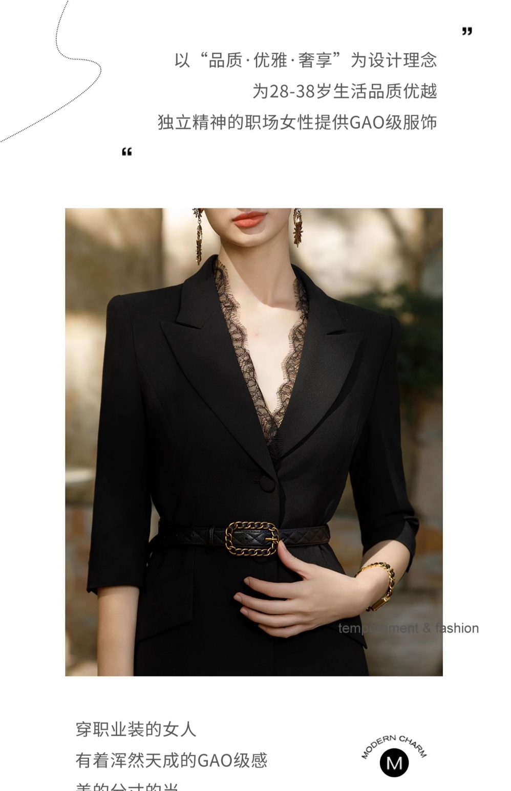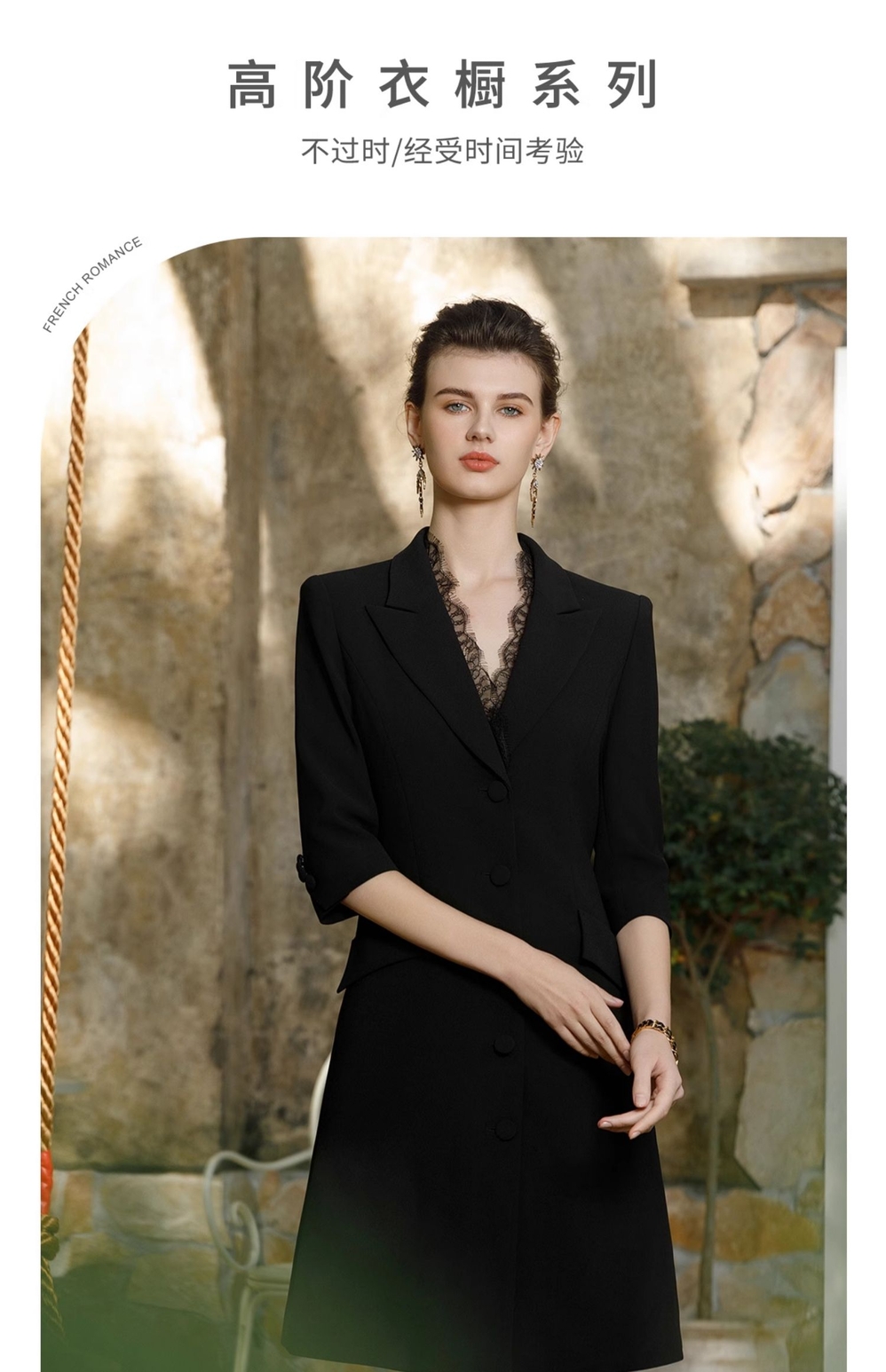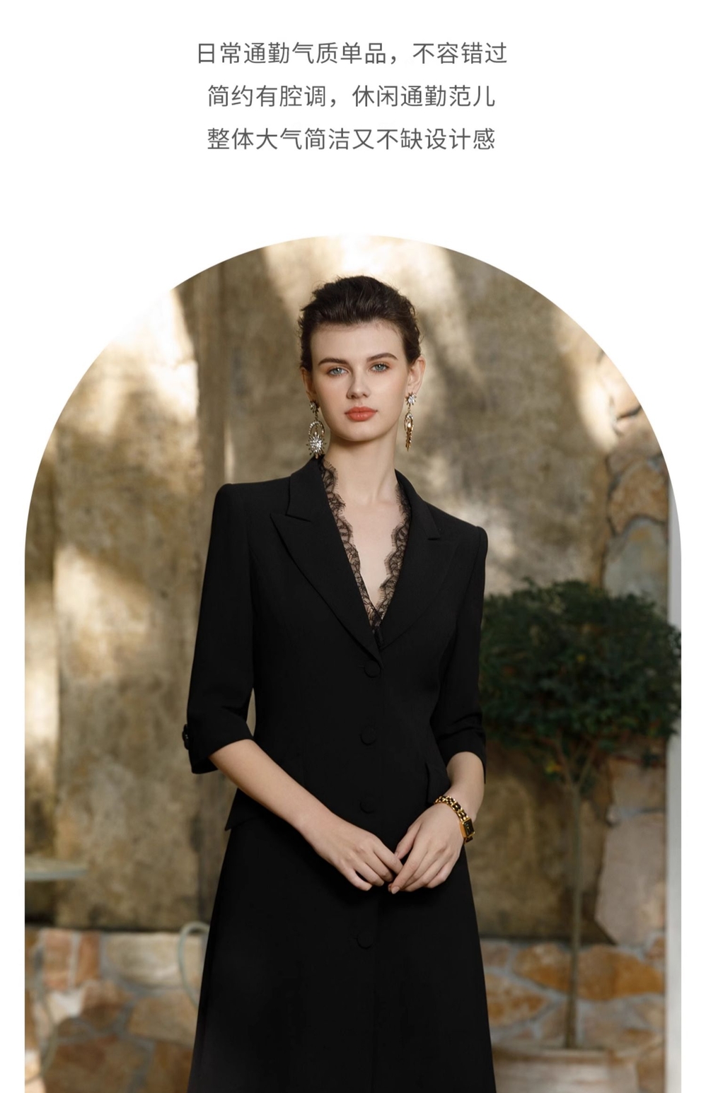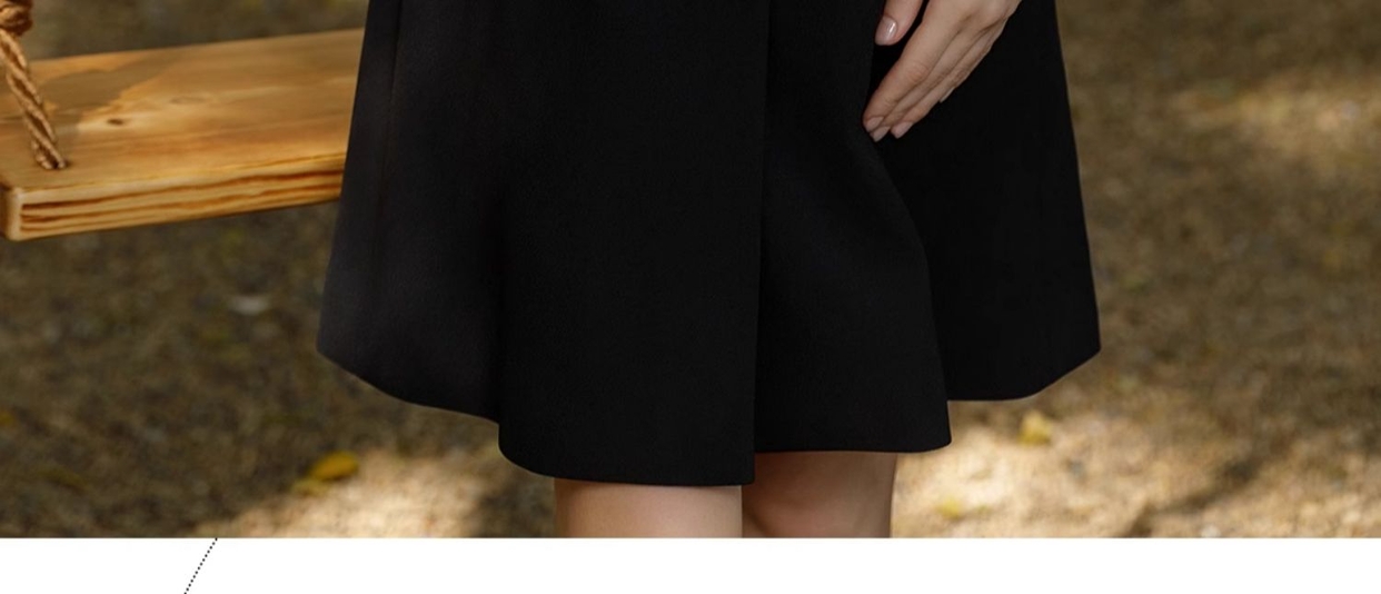 IWY/黑色正式场合连衣裙女七分袖蕾丝装饰设计西装裙双排扣气质职场裙Q1057
