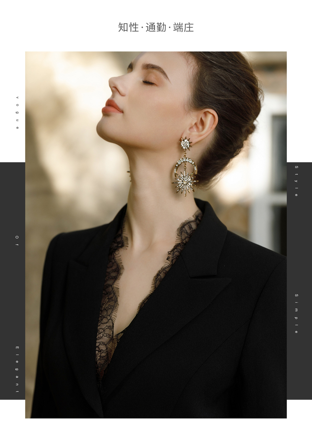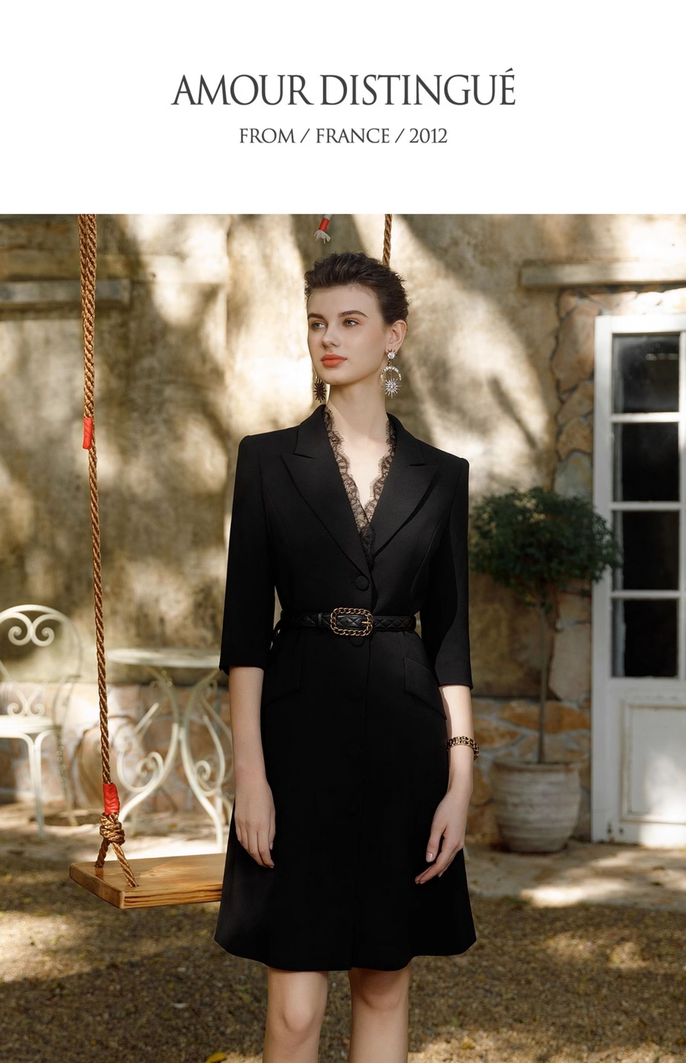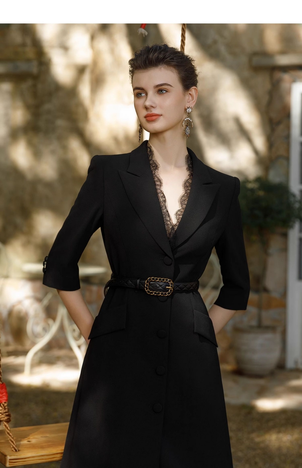 IWY/黑色正式场合连衣裙女七分袖蕾丝装饰设计西装裙双排扣气质职场裙Q1057