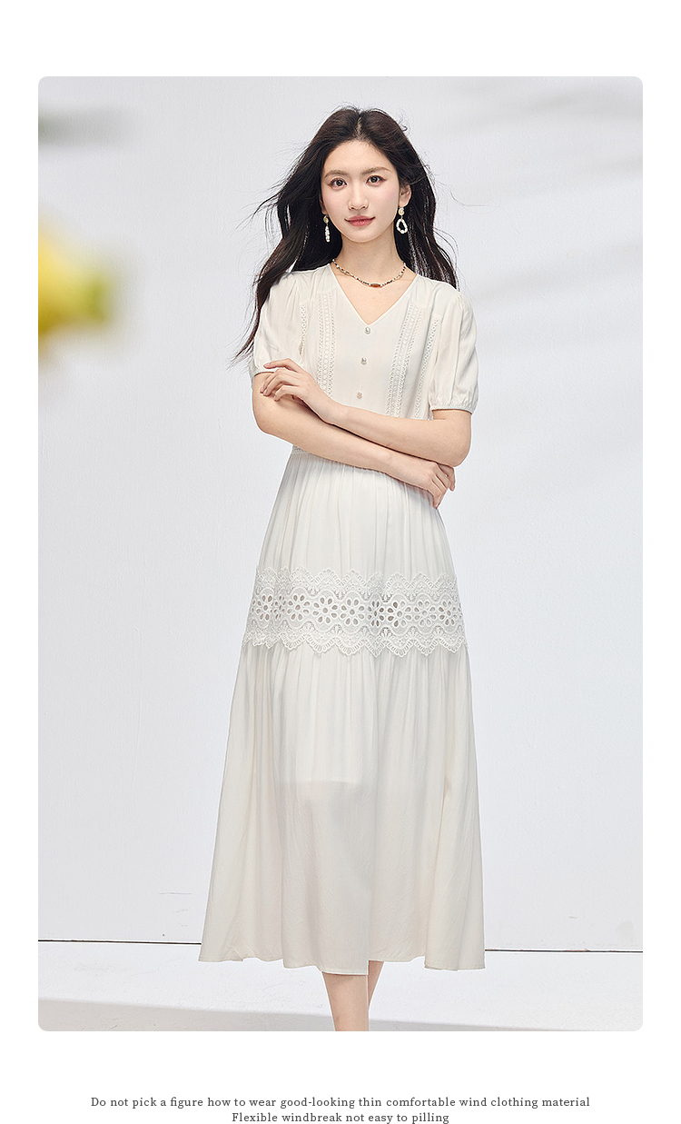 【专属特价】熙世界法式白色连衣裙女2025夏季新款气质高腰绣花泡泡袖V领长裙