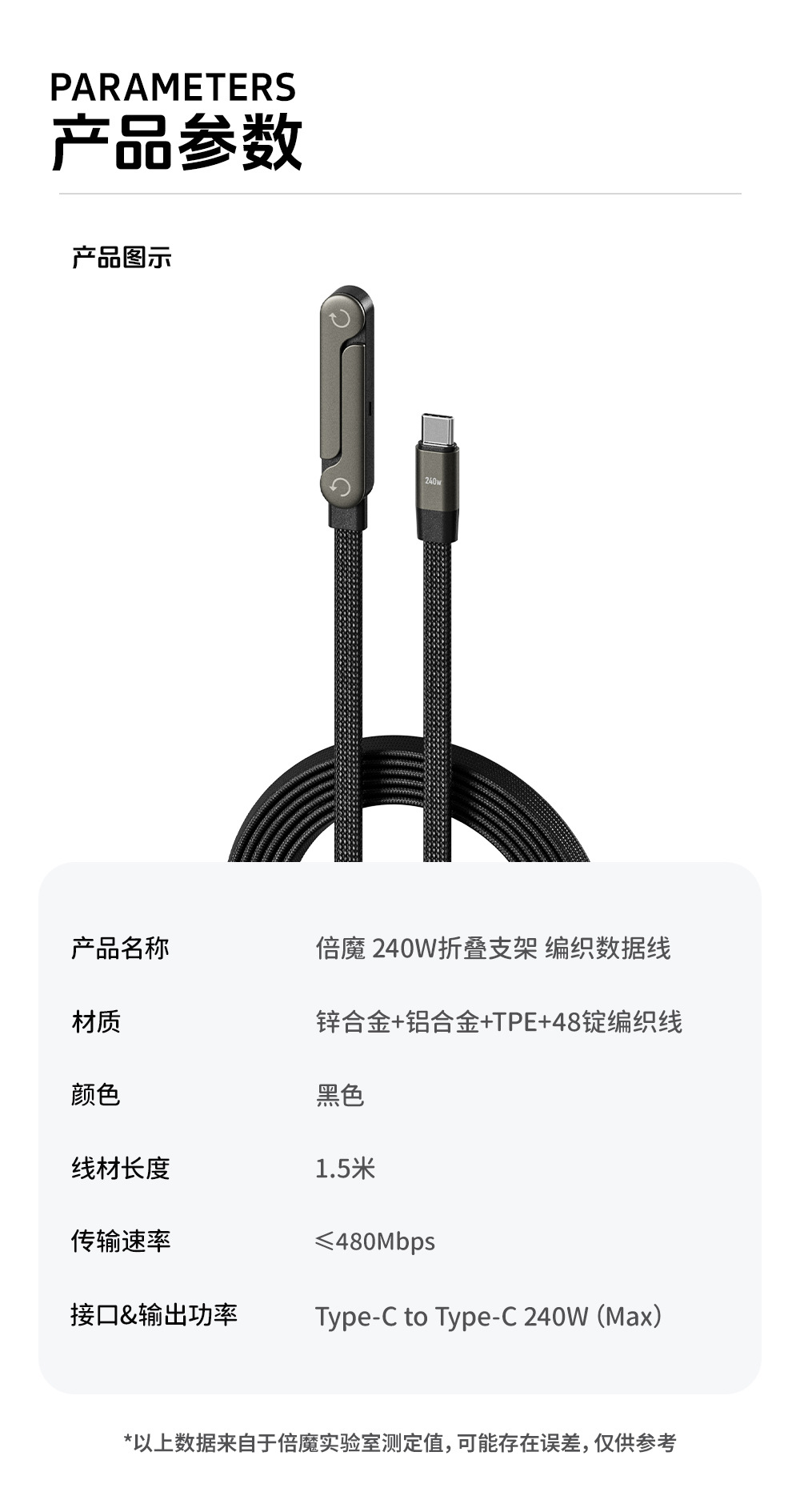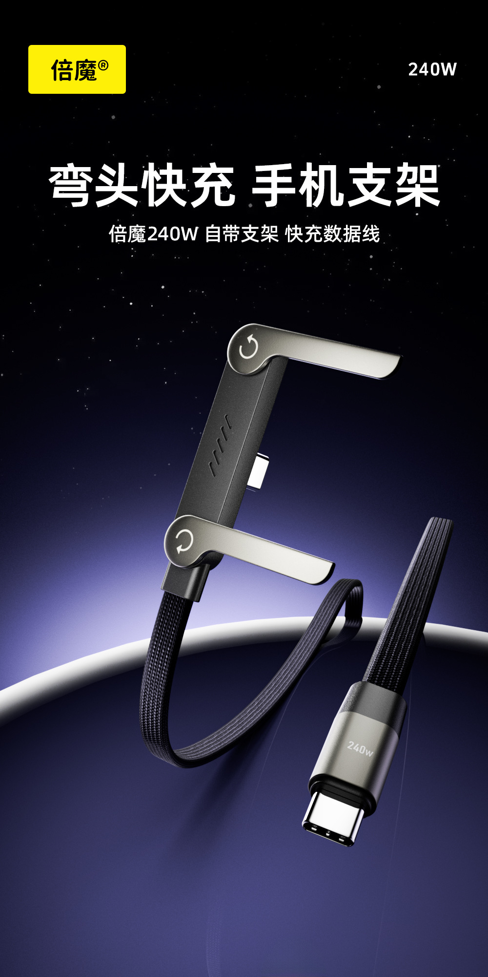 「支架+充电线!一体设计」倍魔240W支架数据线适用于苹果17华为平板手游充电线数码配件