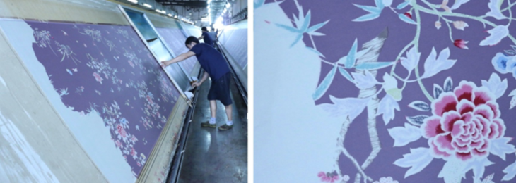 手工抬版印染,是传统的印染技术,图片中那块黑板子就是花板,一块花板刷一个颜色,如果我们的花型有20多套色,就得制作20多个花板,劳动强度极大,通常的壮年男子才能抬得动,皇锦所有真丝印花产品包括丝巾都是这么一块一块刷出来的