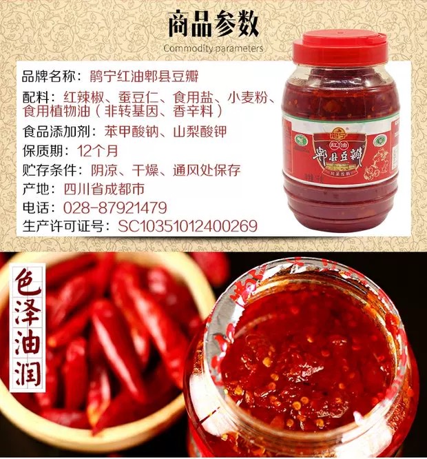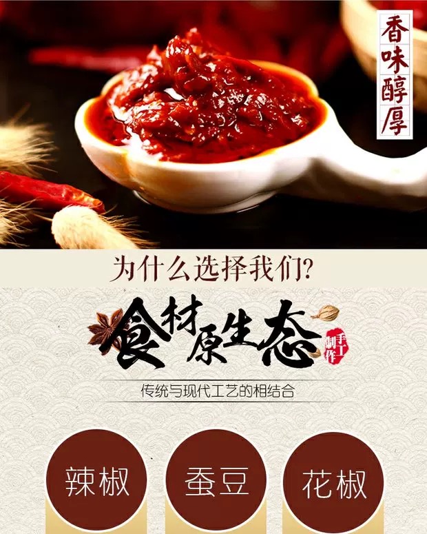 精选红辣椒、蚕豆仁为原料,精心调味;