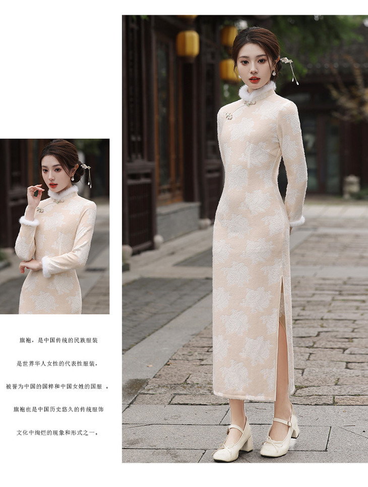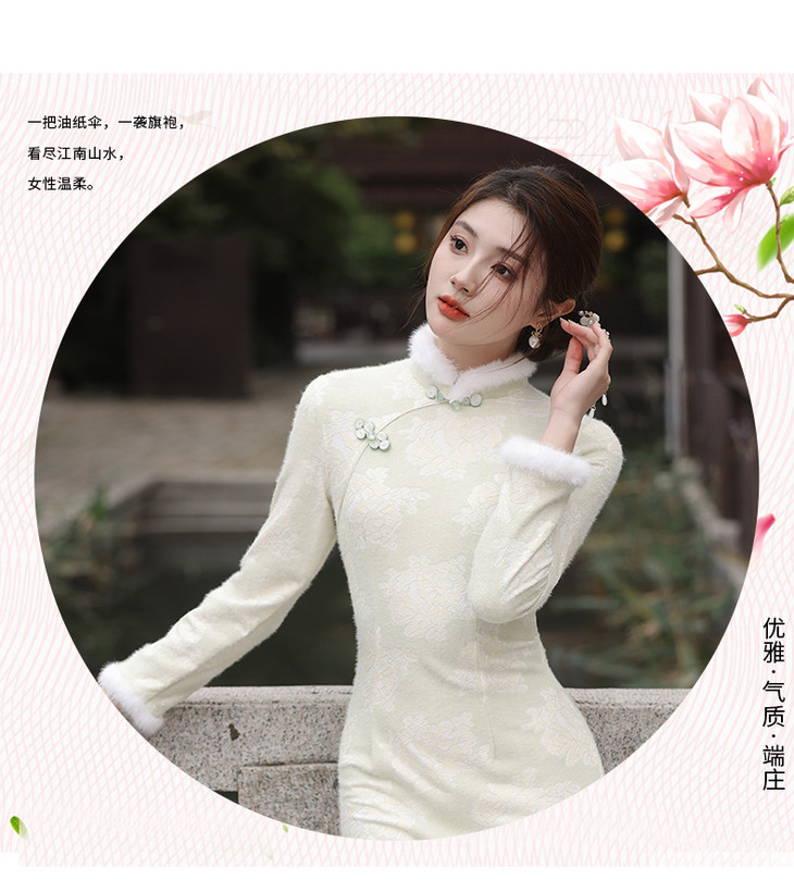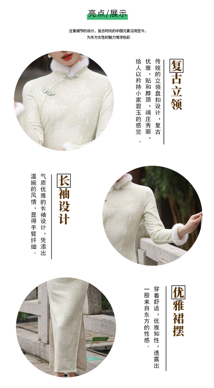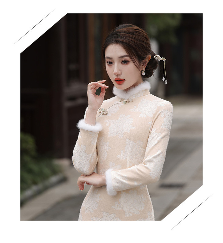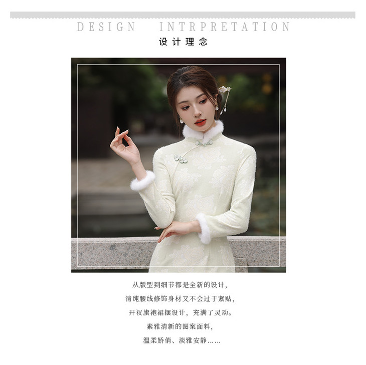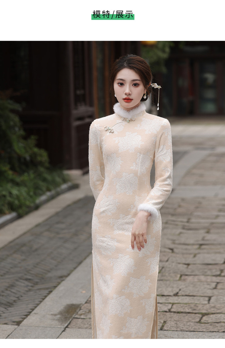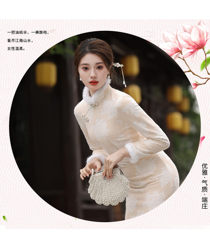 秋冬新款2023气质杏色提花仿水貂复合超柔中长款清新旗袍MLS6831