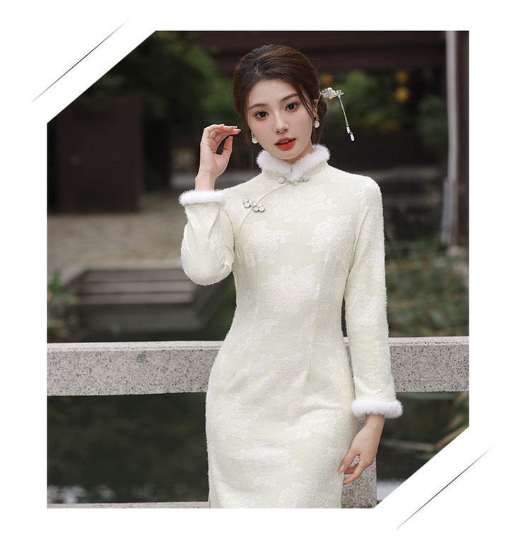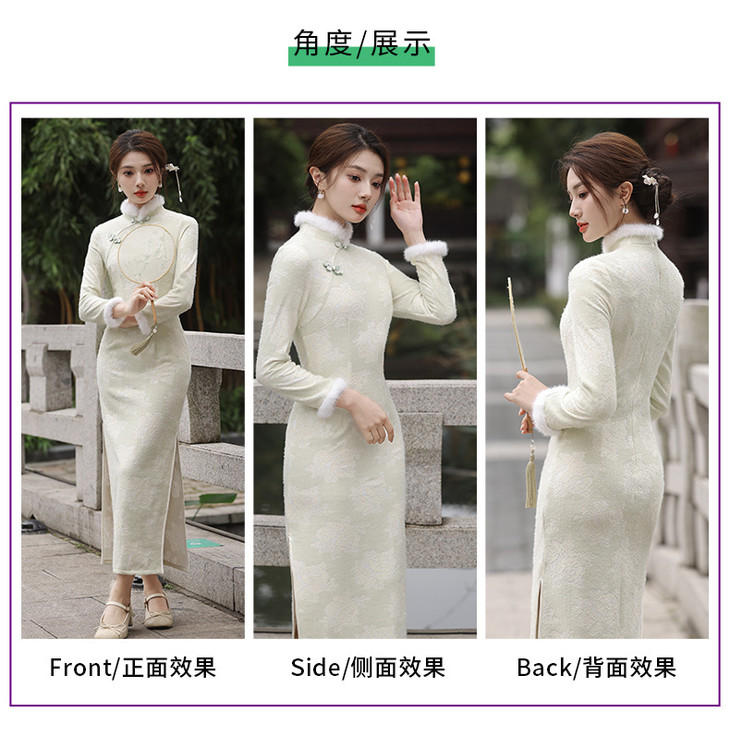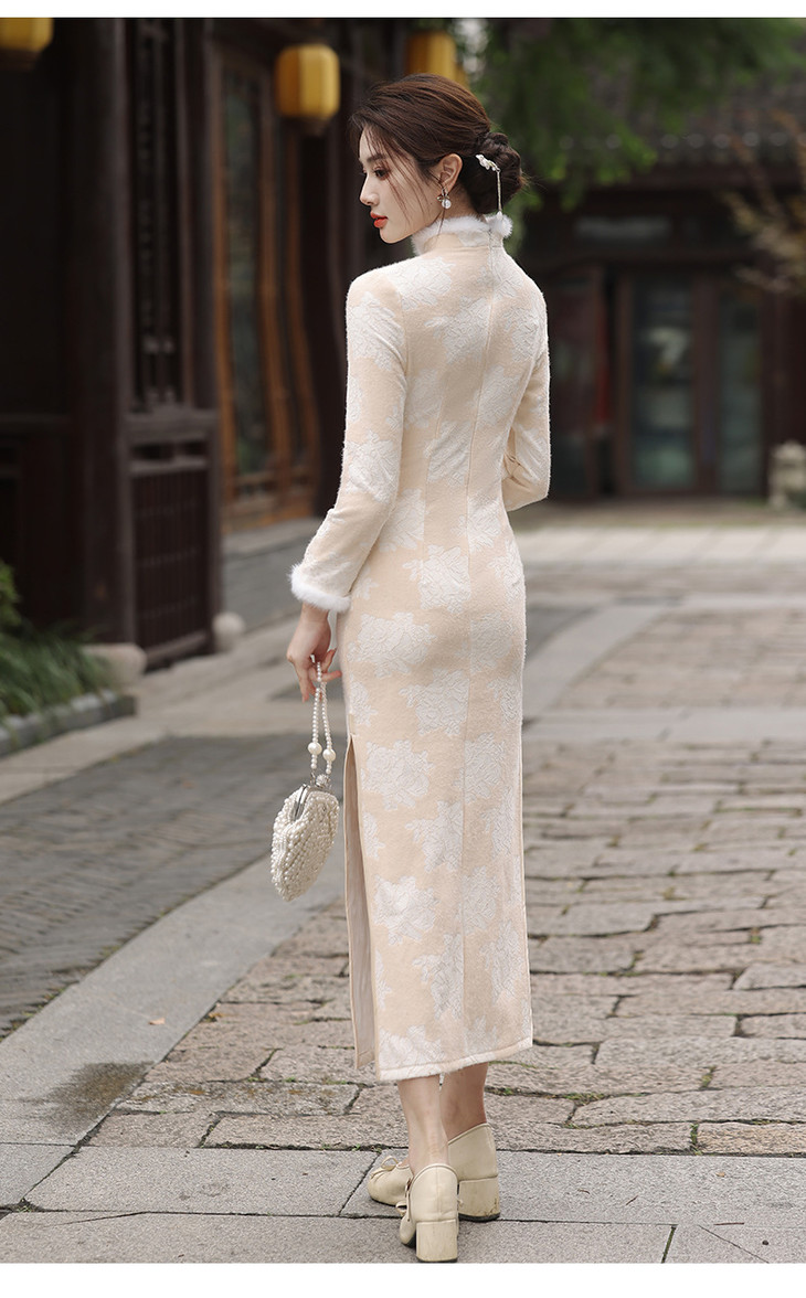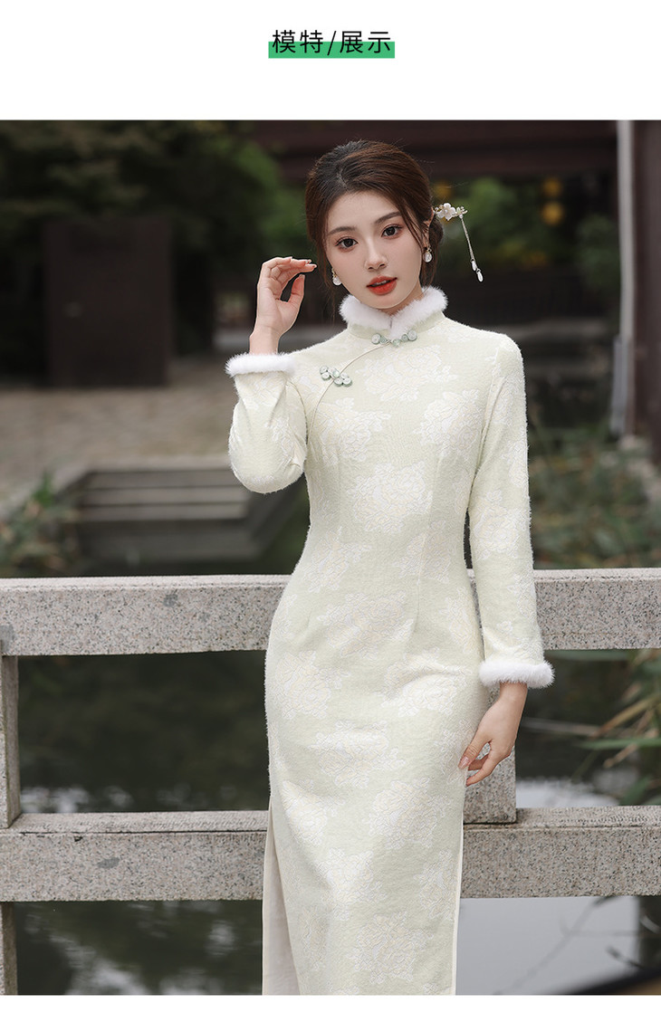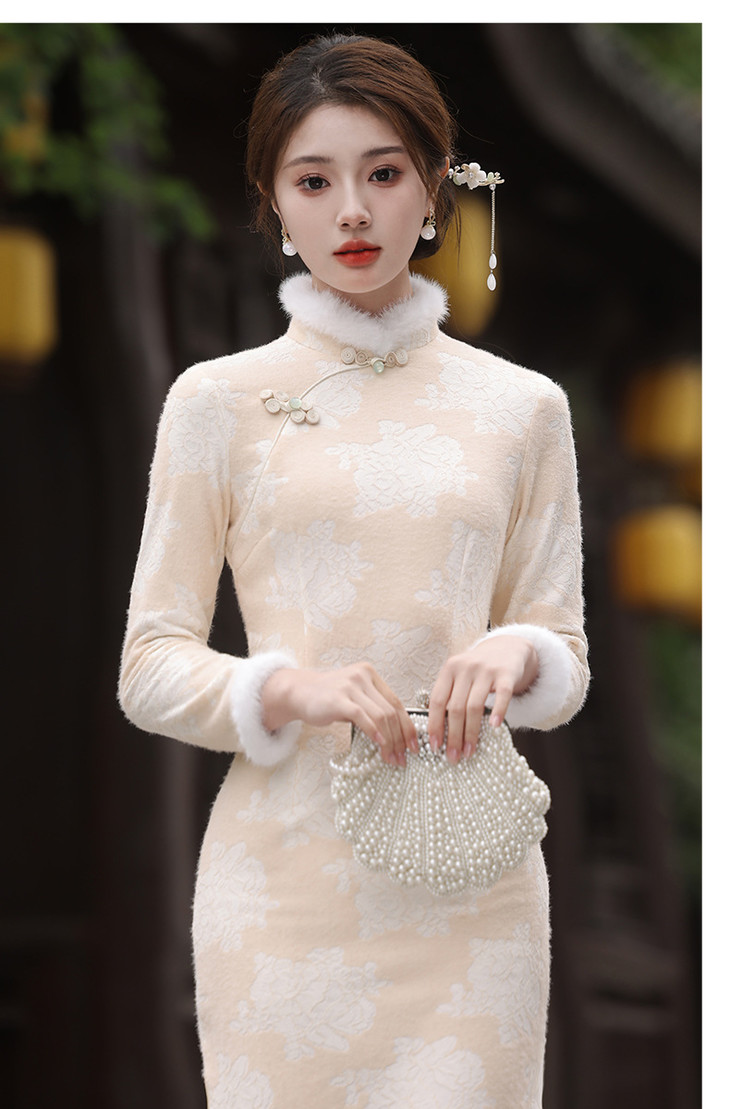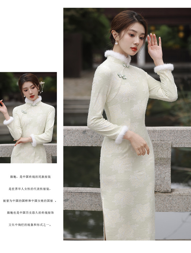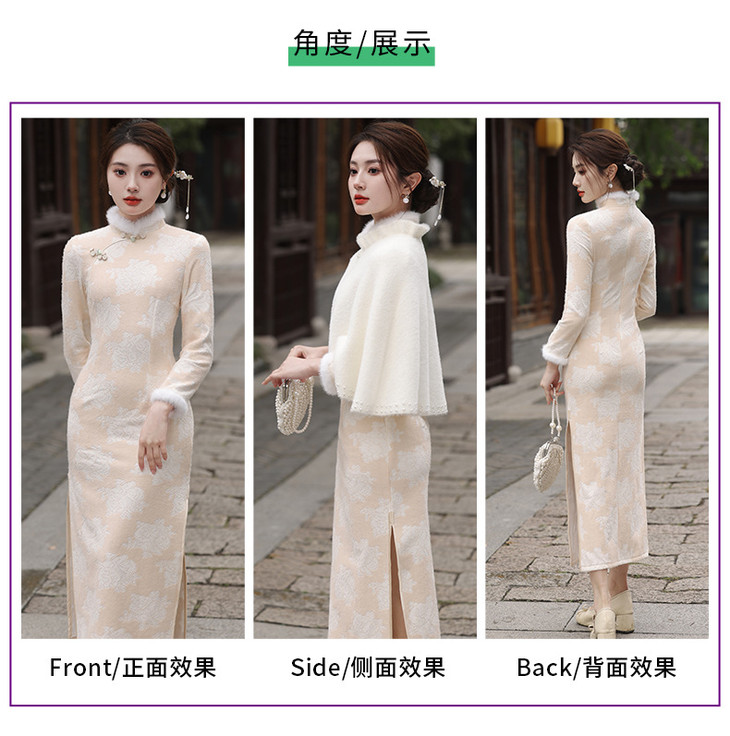 秋冬新款2023气质杏色提花仿水貂复合超柔中长款清新旗袍MLS6831