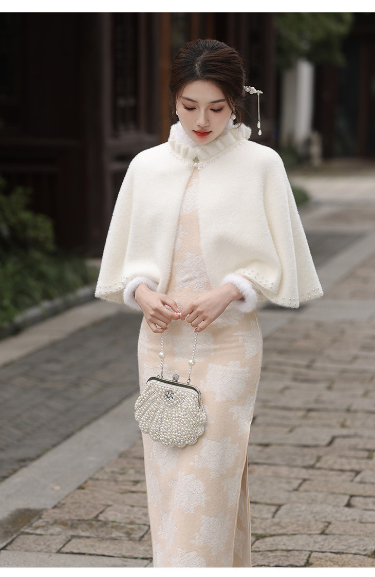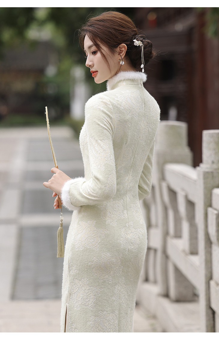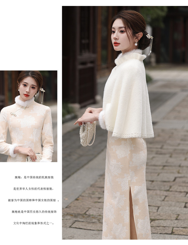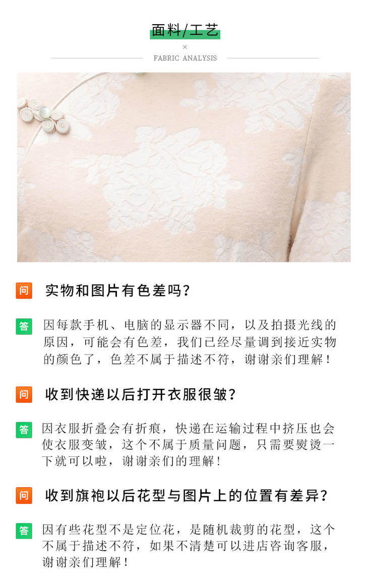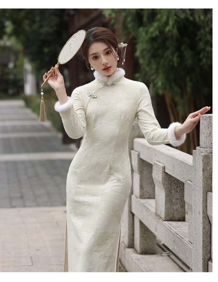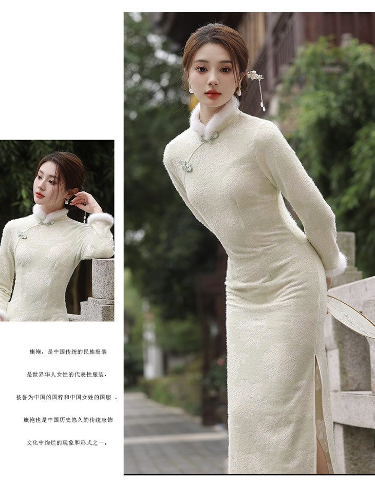 秋冬新款2023气质杏色提花仿水貂复合超柔中长款清新旗袍MLS6831
