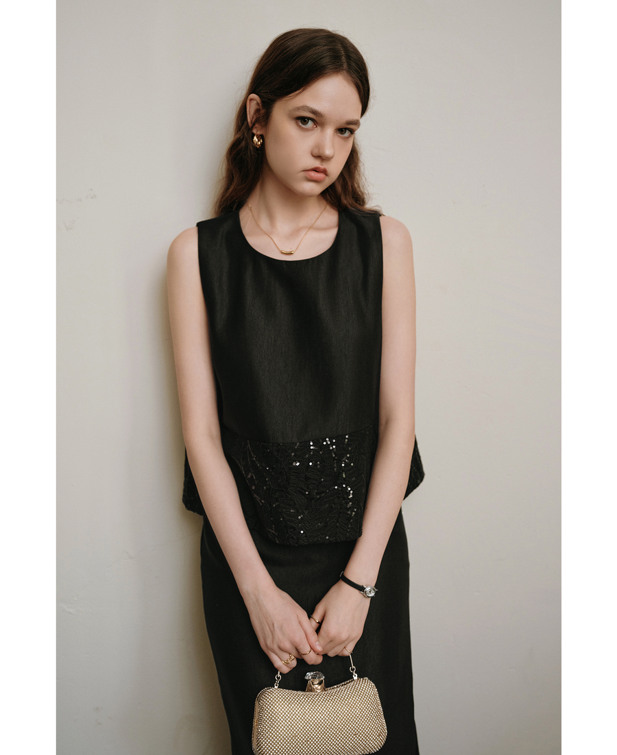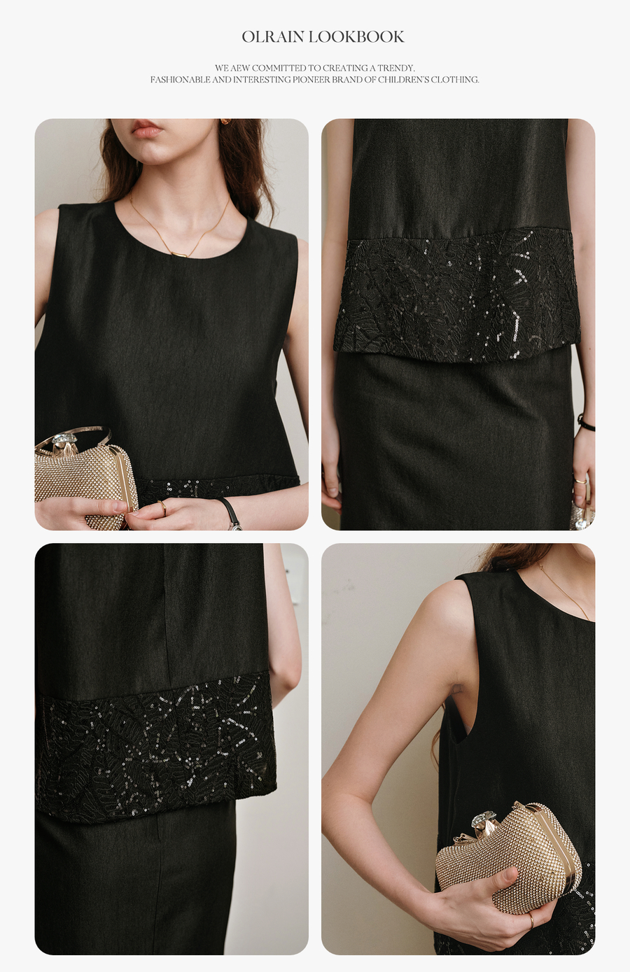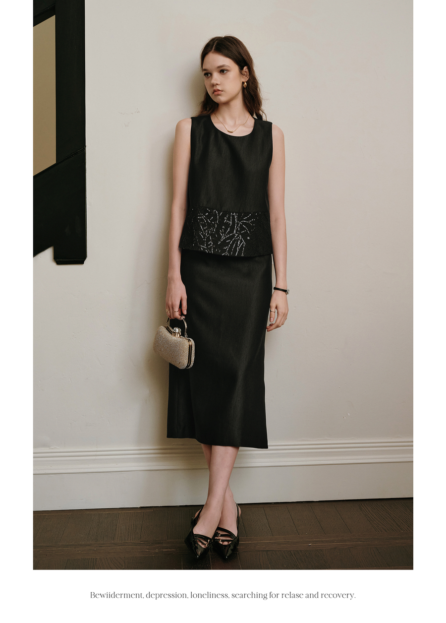 OLrain欧芮儿2025夏季新款黑色拼接亮片高阶感半裙套装时尚两件套