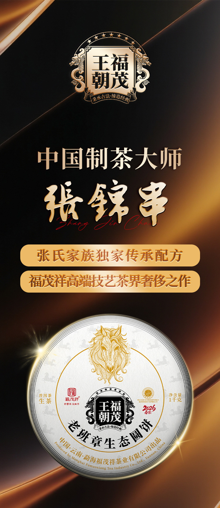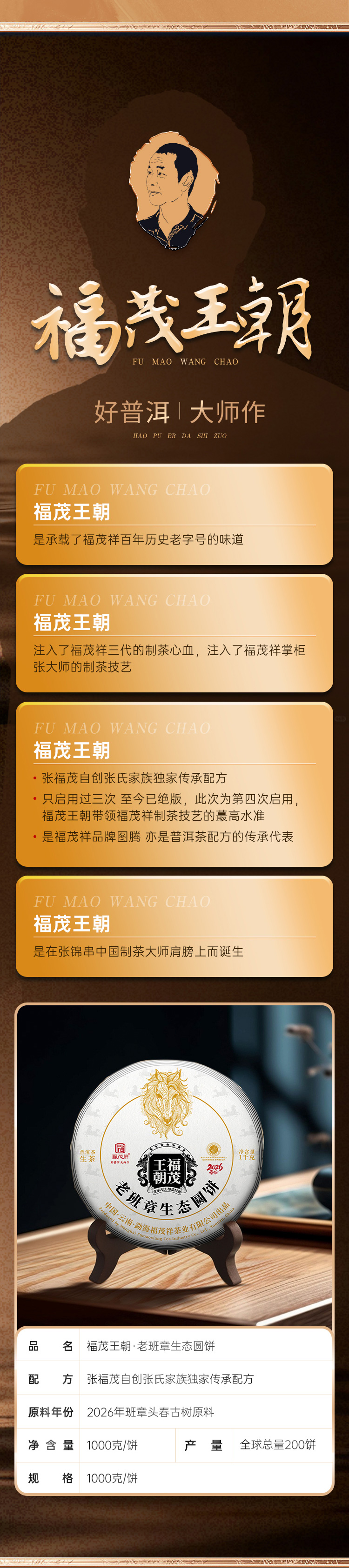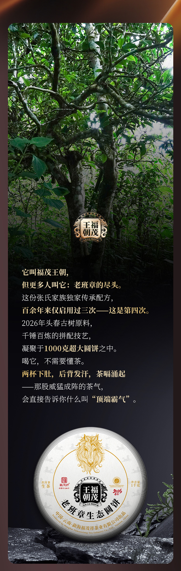 镇店之宝【福茂王朝】老班章生态圆饼;张氏家族传承配方青饼 2026年云南勐海老班章普洱生茶1000g收藏大饼 单饼塑封配茶架