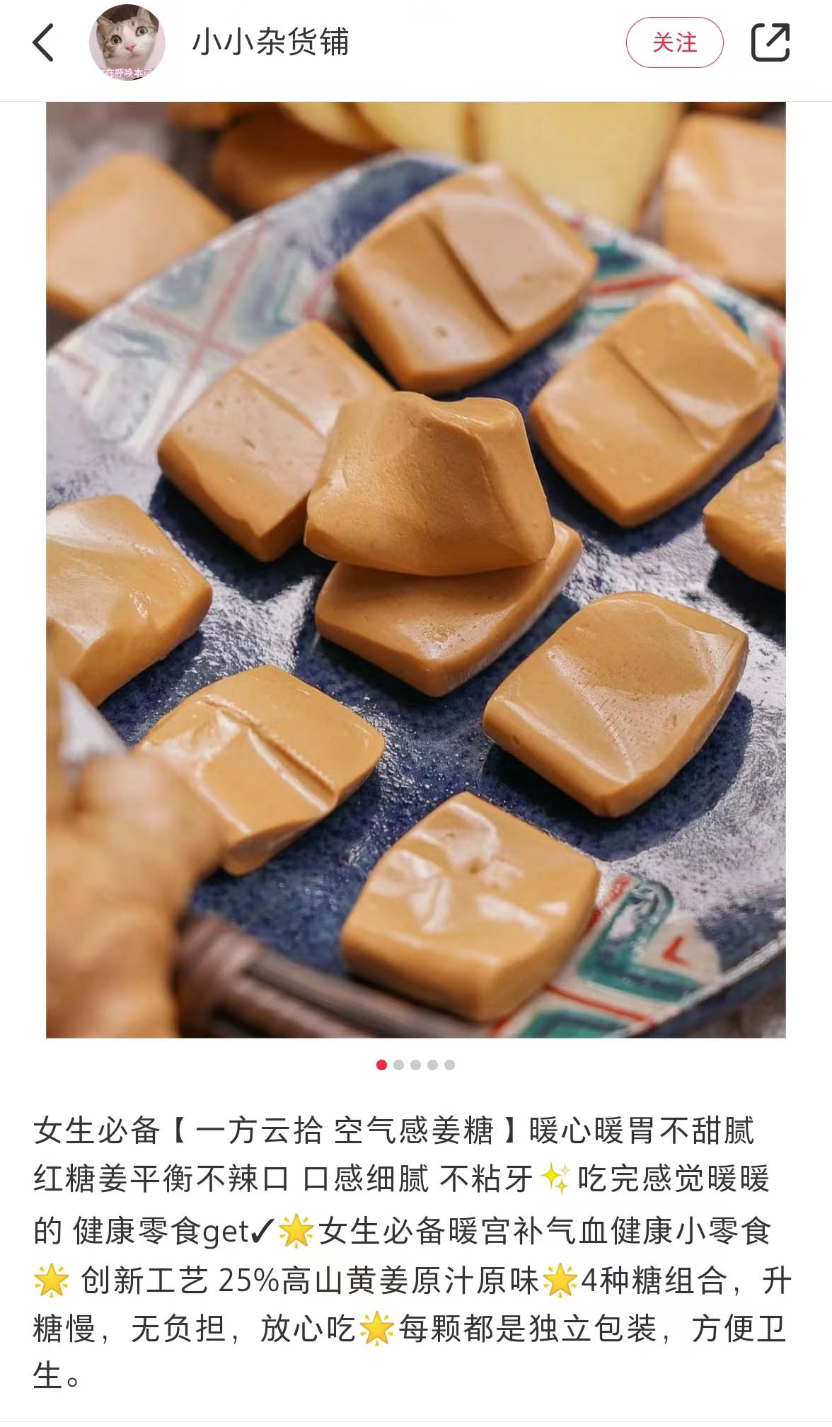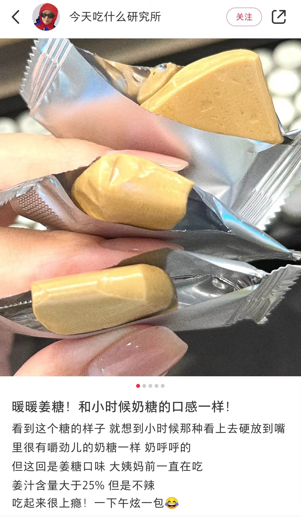 给爱吃姜的怕寒星人推荐的空气感姜糖,甜甜辣辣的,伴着姜汁香,吃起来还挺过瘾的。它看着有点像太妃糖和奶香,吃起来没有辣到飙泪的刺激,也没有干涩的渣丝,有点像香香的姜撞奶。嚼起来是有空气感的,很细腻,,Q弹不粘牙,很好吃。