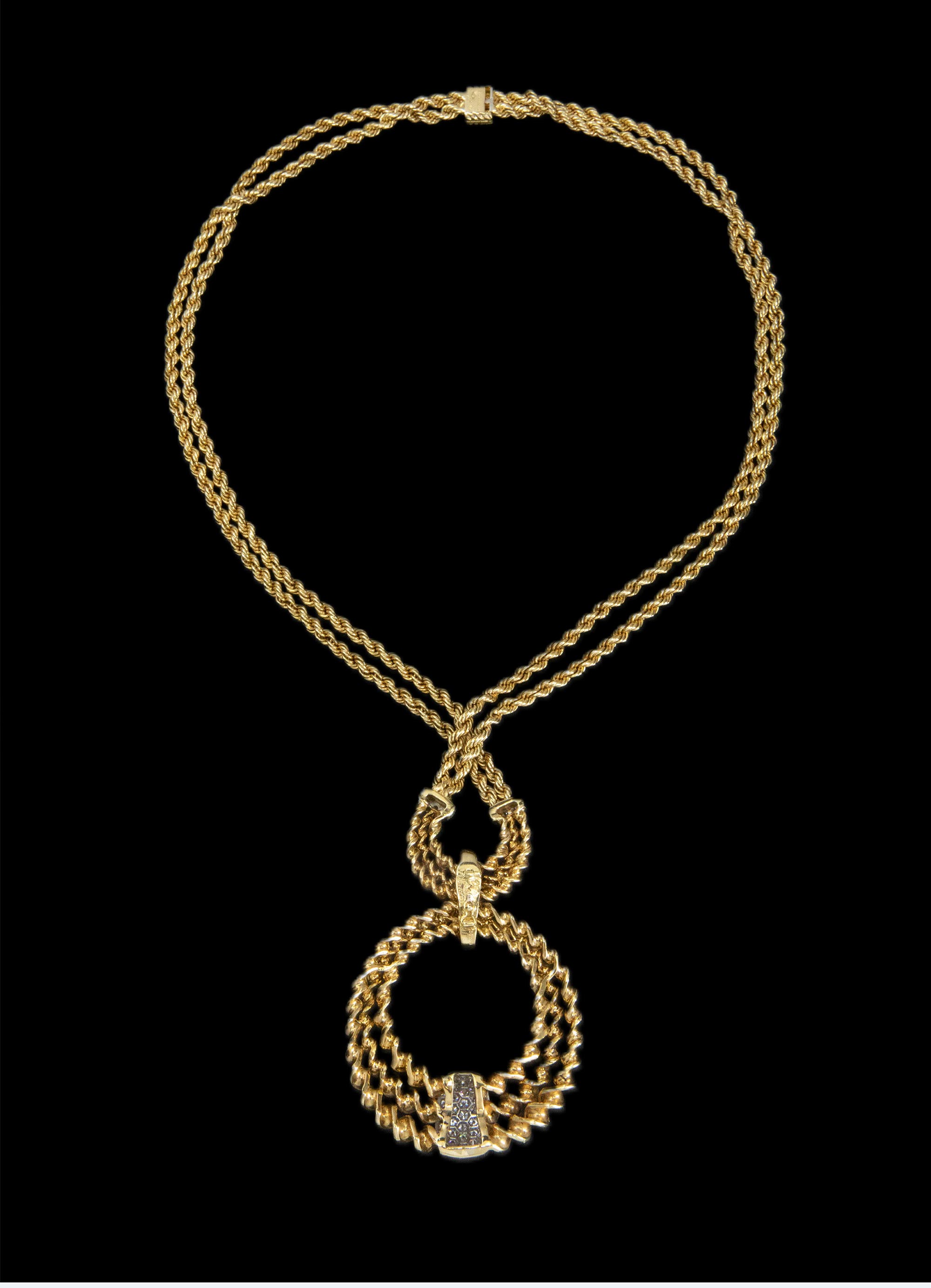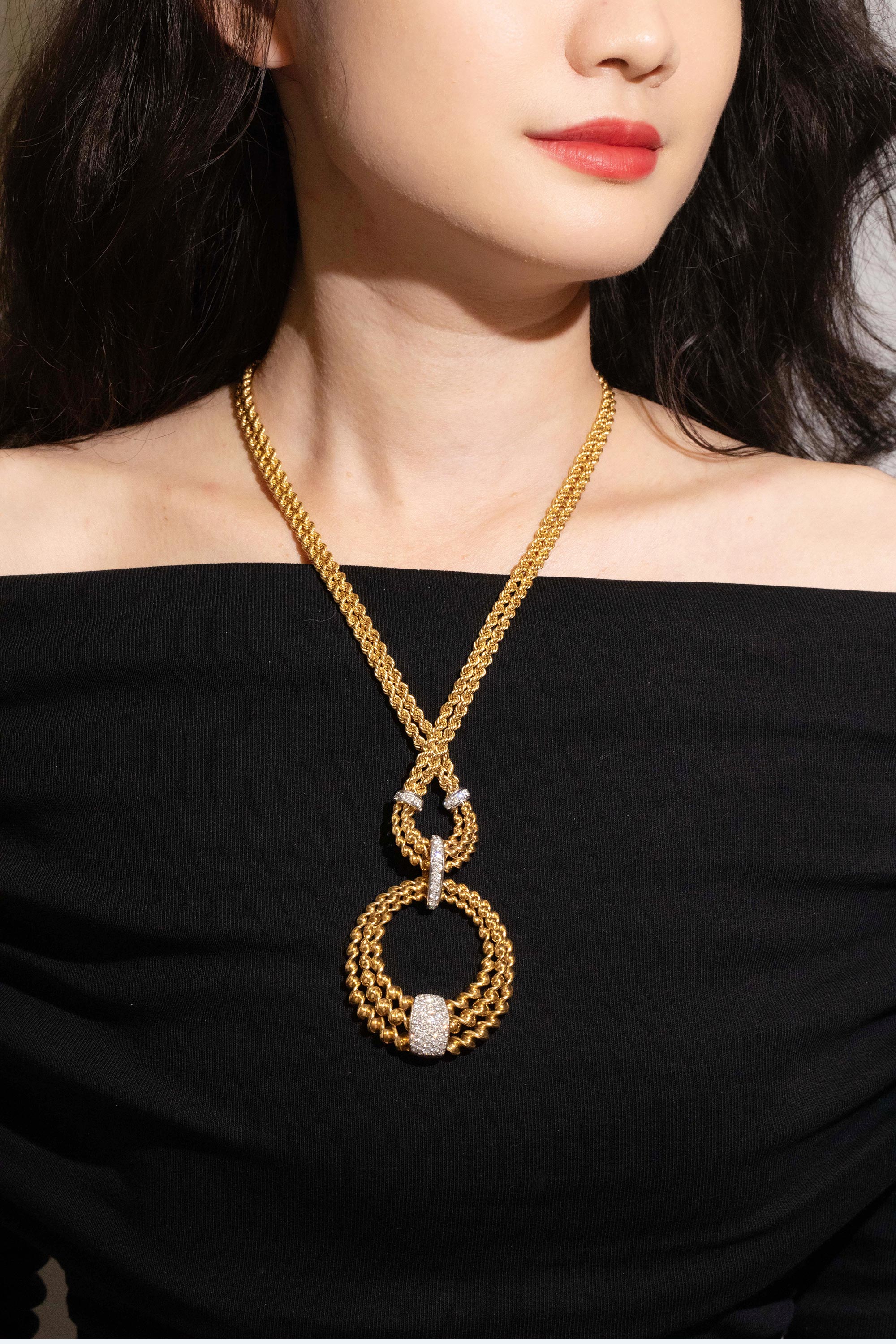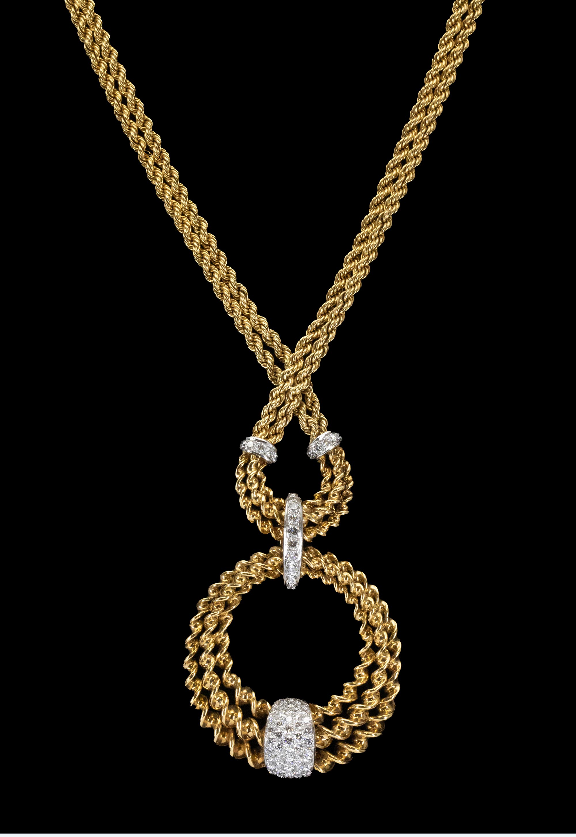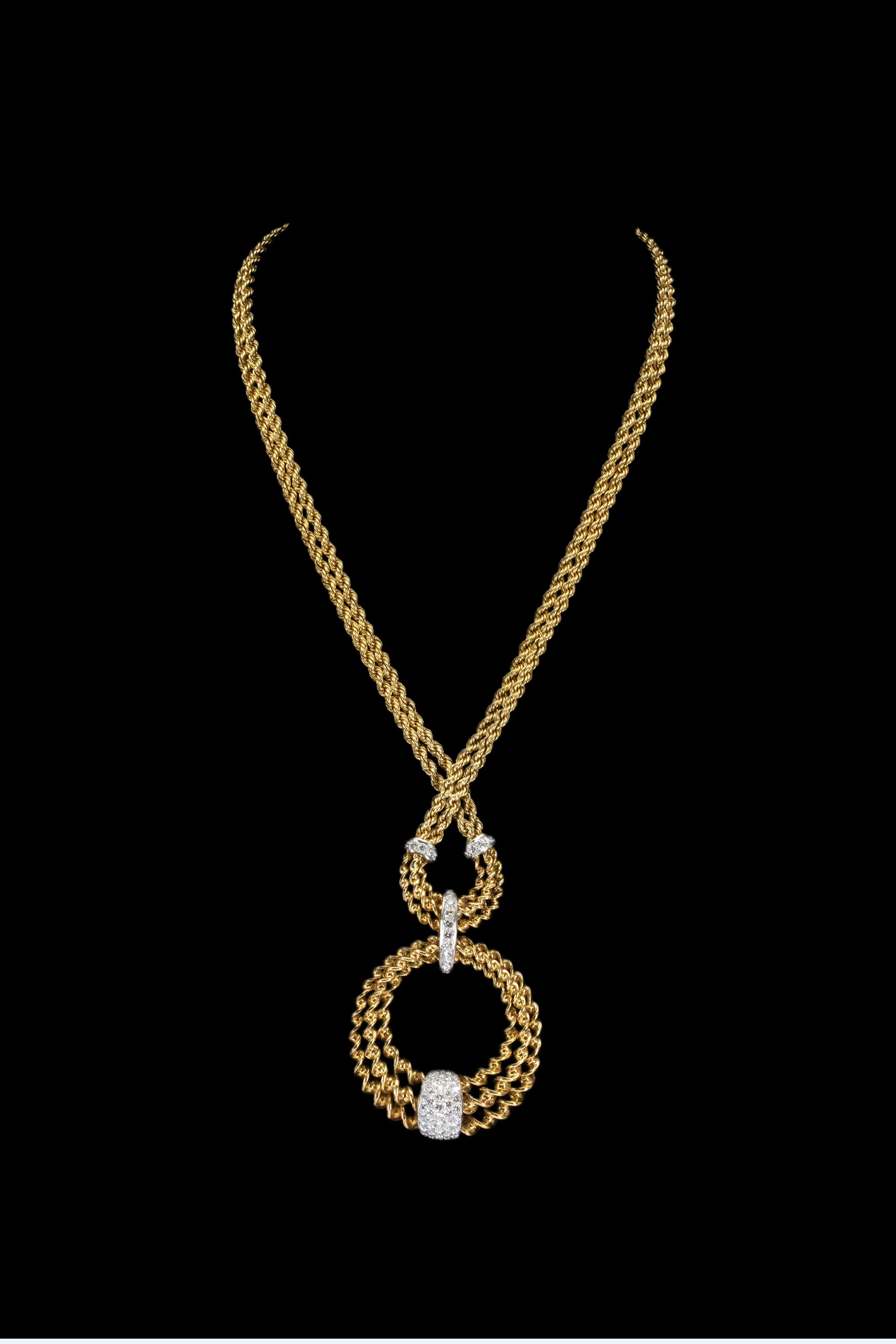 1985年代法国顶级珠宝世家宝诗龙Boucheron出品18K黄金及铂金镶嵌钻石双链吊坠造型编织纹理项链